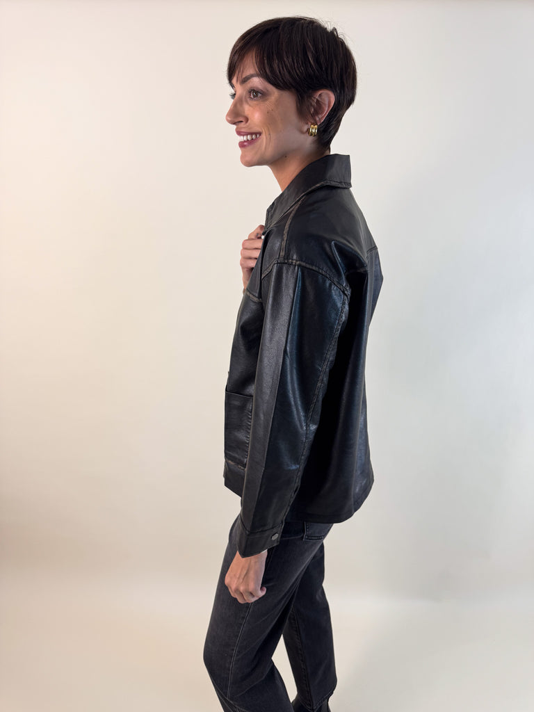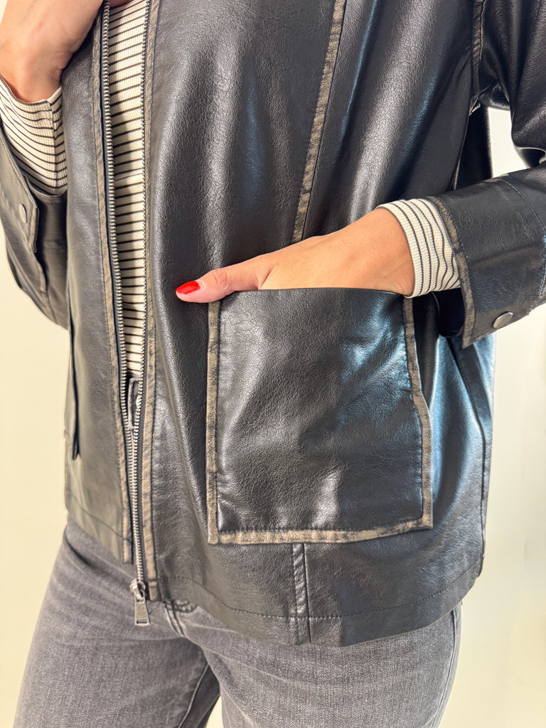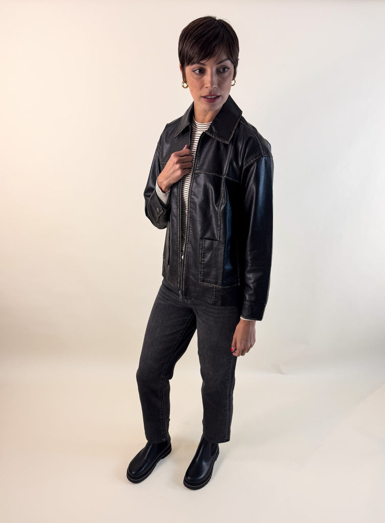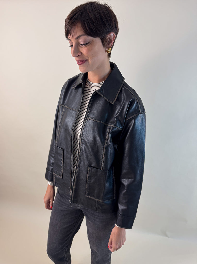 Bring back that effortlessly cool 90’s vibe with this washed black faux leather jacket. With a lived-in finish that gives just the right amount of edge, this zip-up style is equal parts timeless and trendy.