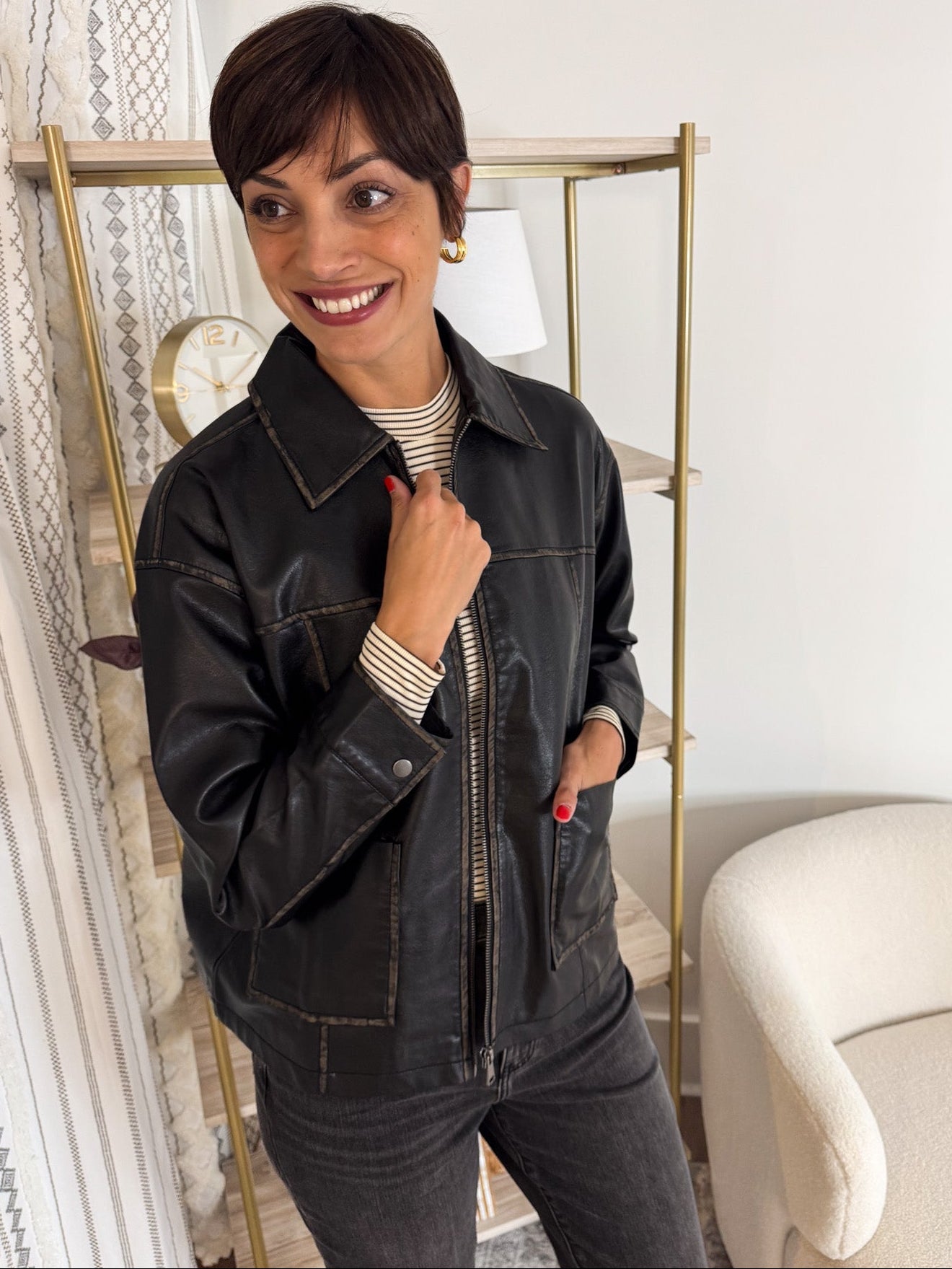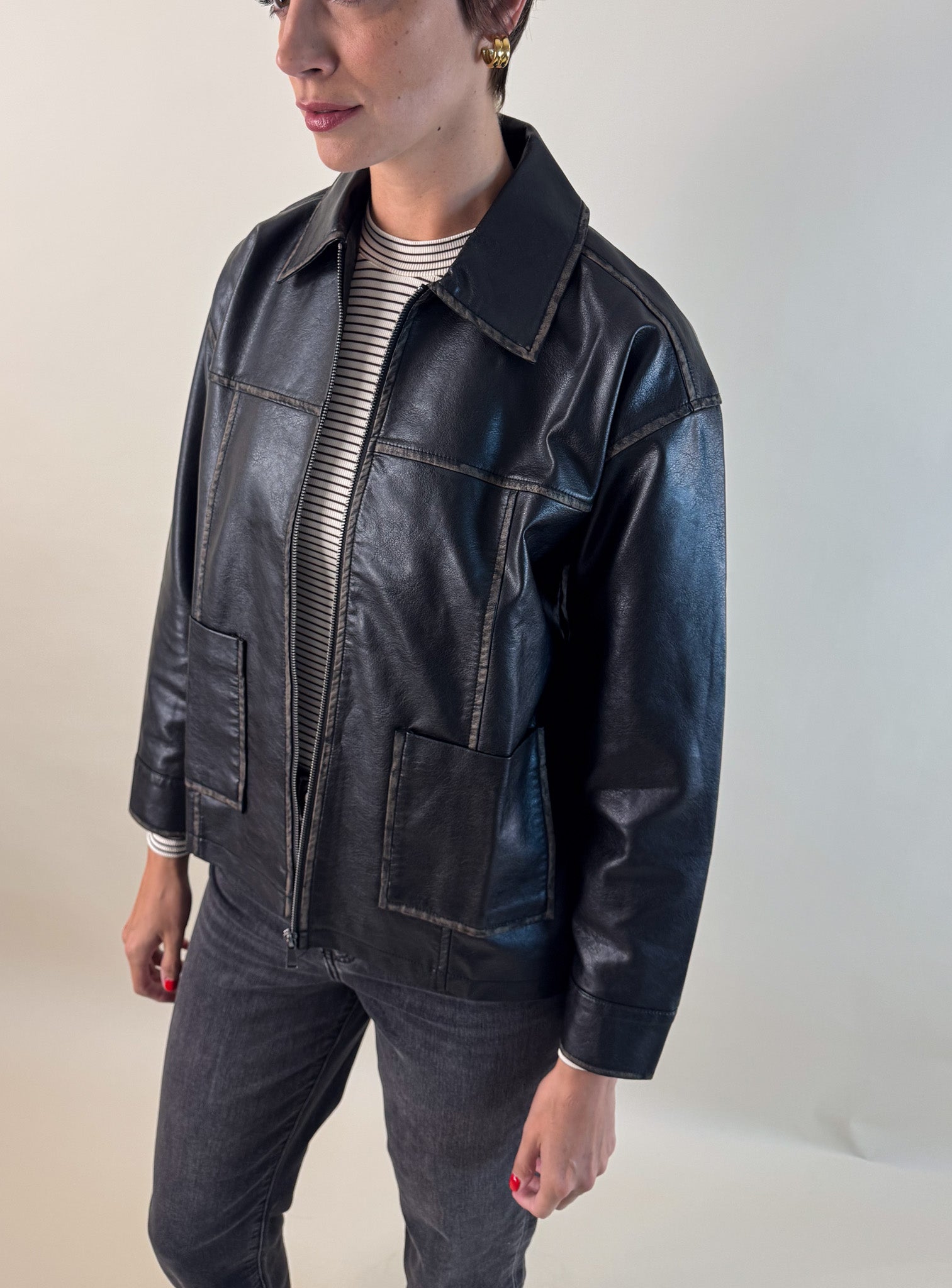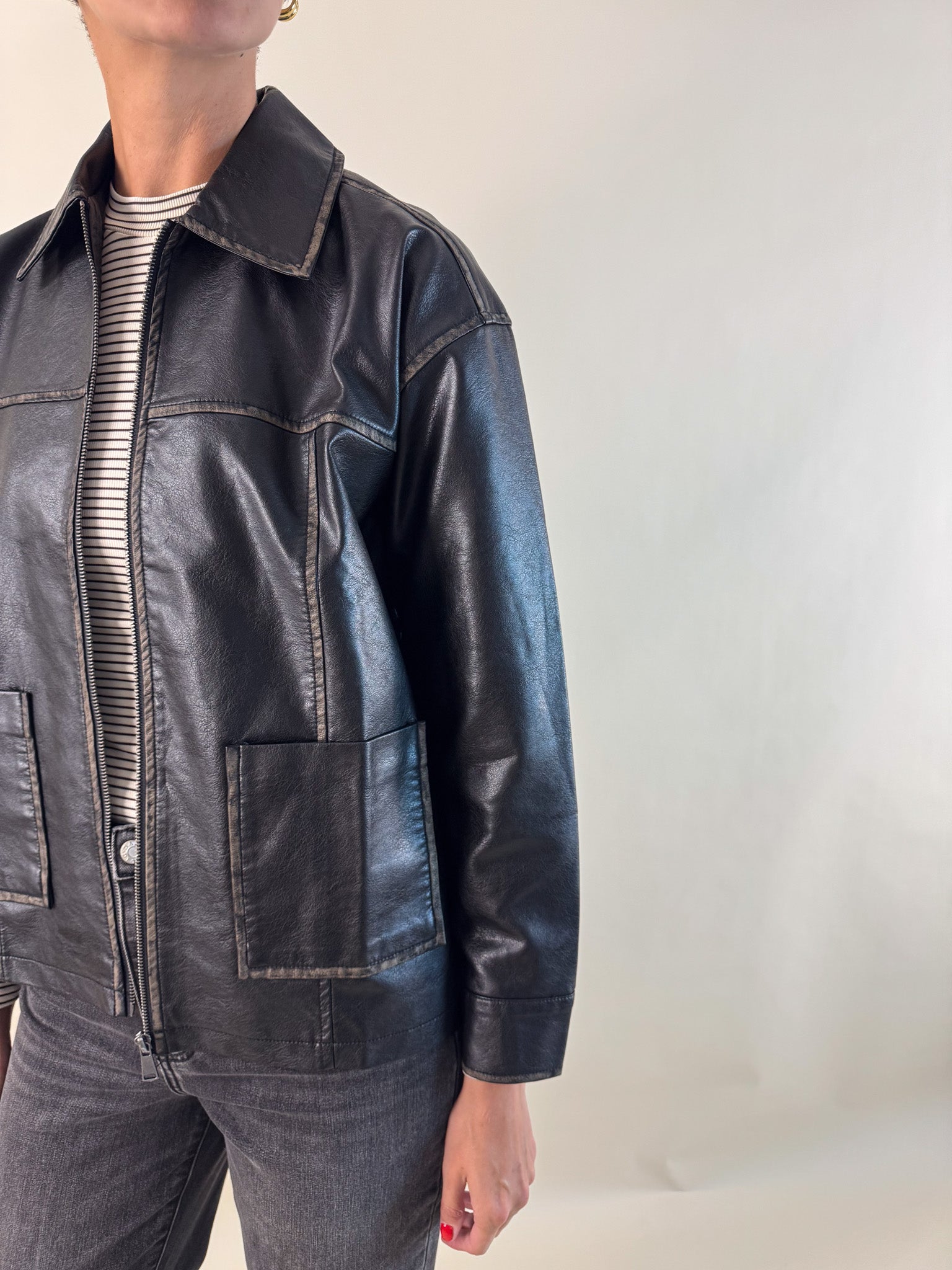 Bring back that effortlessly cool 90’s vibe with this washed black faux leather jacket. With a lived-in finish that gives just the right amount of edge, this zip-up style is equal parts timeless and trendy.