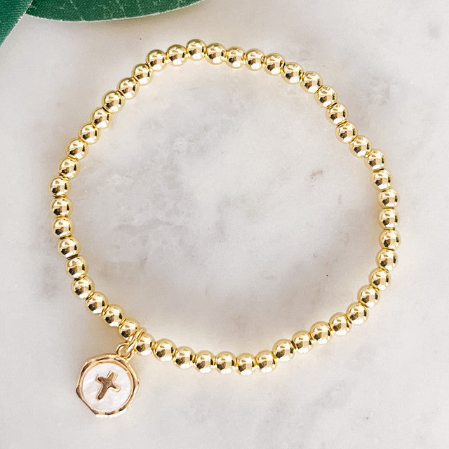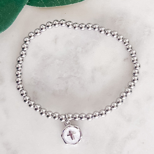 Ball stretch bracelet with MOP cross charm