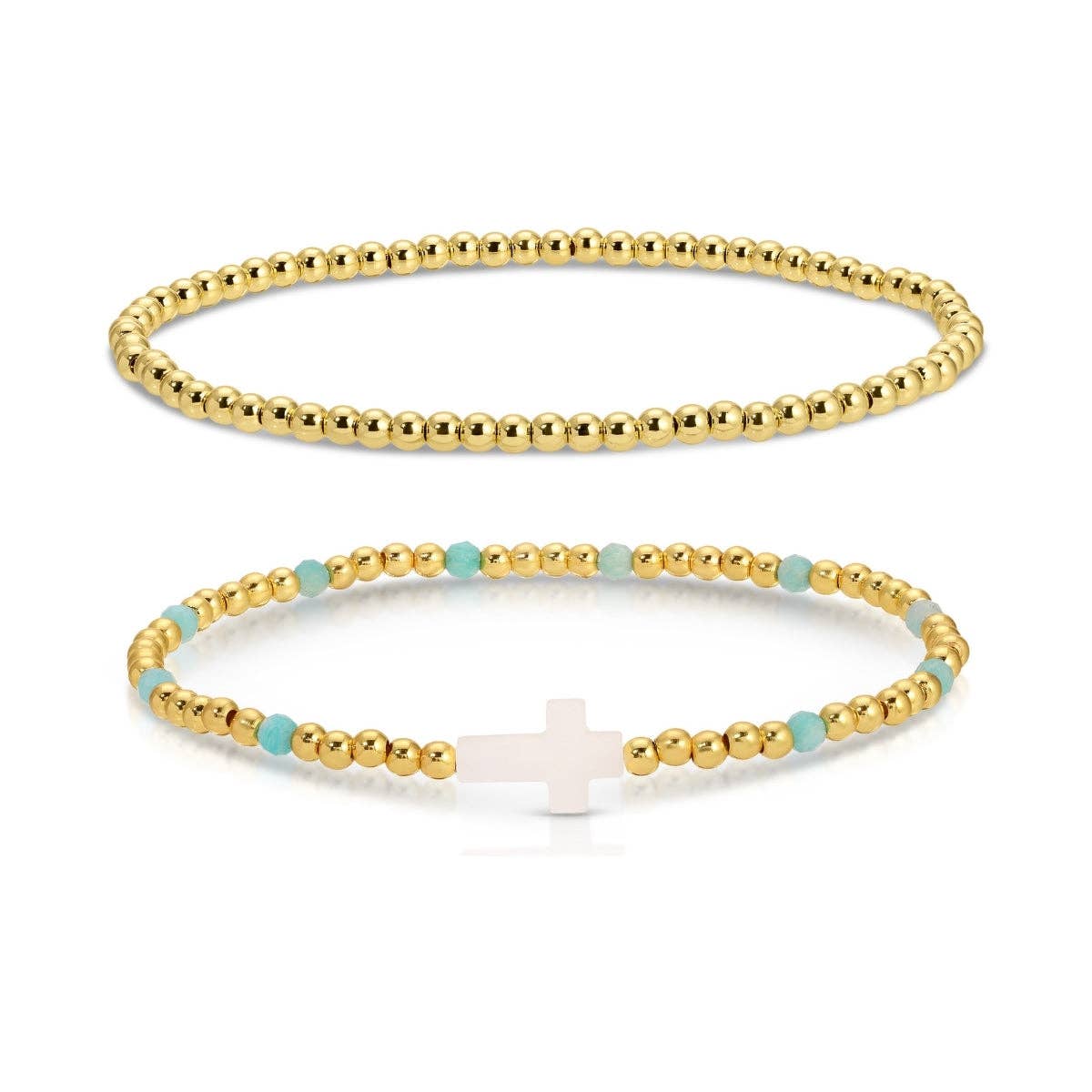 Elevate your everyday stack with the Cross Beaded Bracelet Charm Set. This 18K gold plated bracelet set pairs a simple gold plated beaded bracelet with a vibrant colorful stone accented cross beaded bracelet. Designed with comfortable stretch styling, these bracelets are perfect worn together or mixed into your favorite stack for effortless elegance.