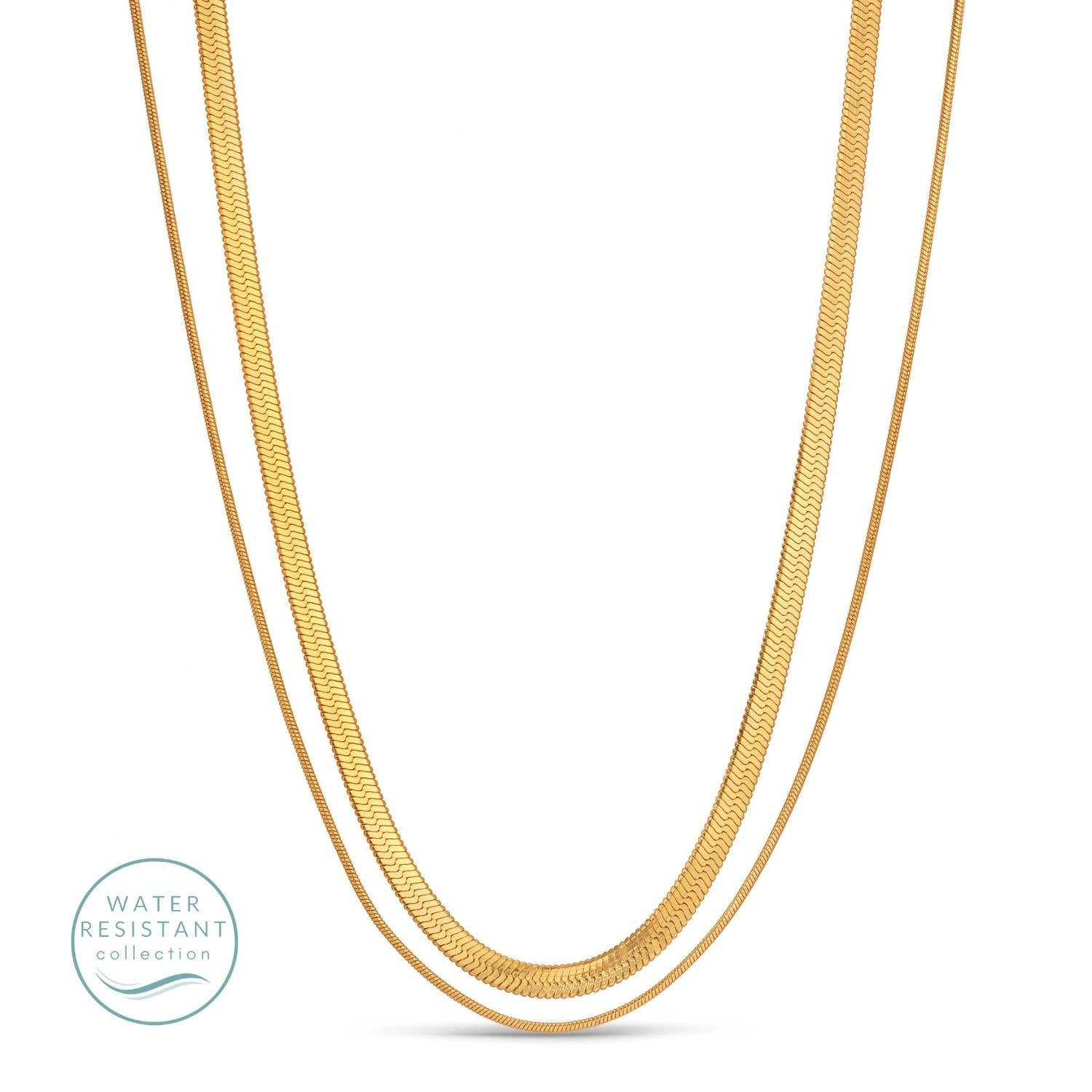 Elevate your everyday style with effortless edge and lasting quality! Our "Double Layer Water Resistant Necklace" is the ultimate must-have for a chic, on-trend look that stands up to your active life. This stunning piece features two perfectly layered snake chains, creating a sleek and sophisticated silhouette that adds instant glamour to any neckline. Crafted with a durable stainless steel base, each chain is then meticulously finished with a radiant 18K gold plating, offering the rich, warm glow of solid gold without the premium price tag.
