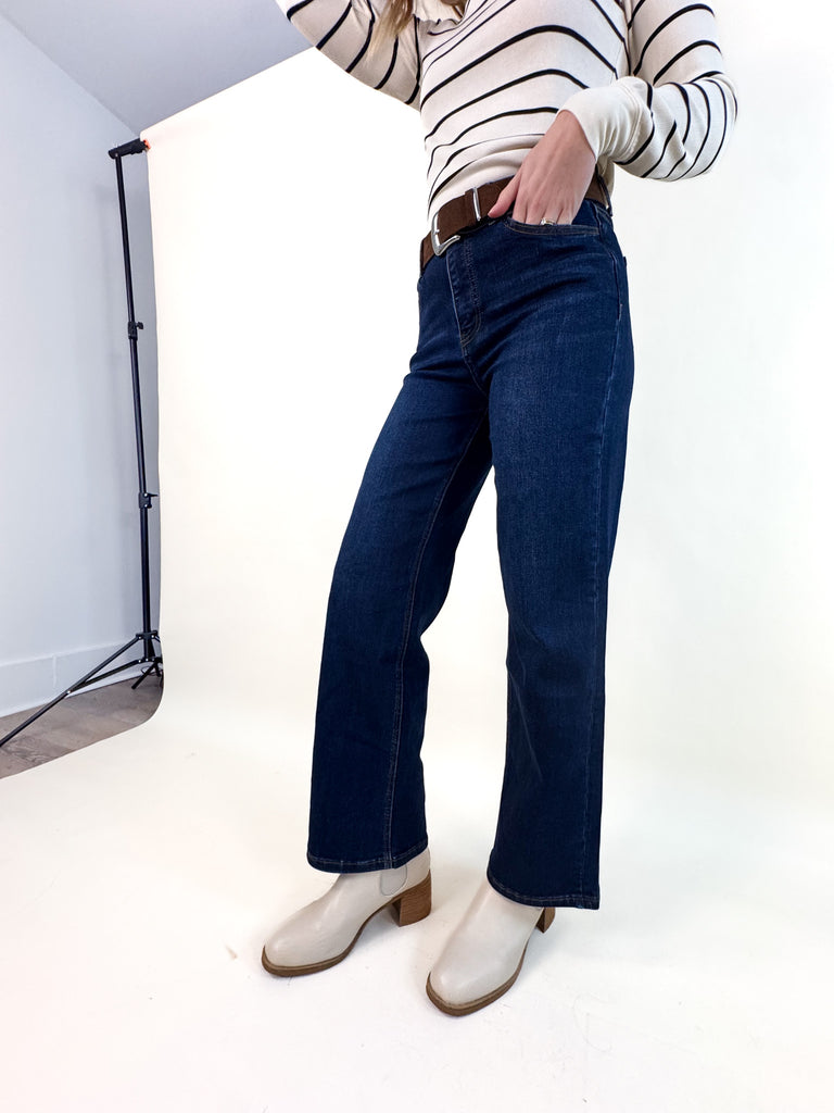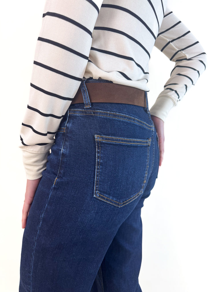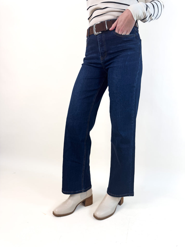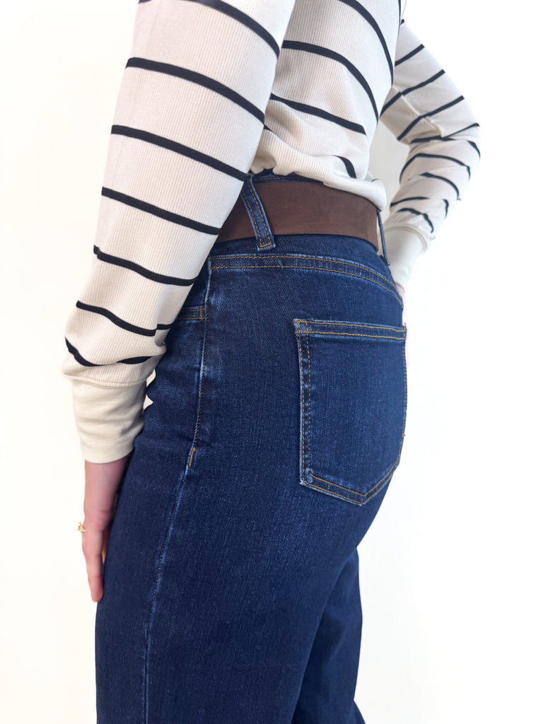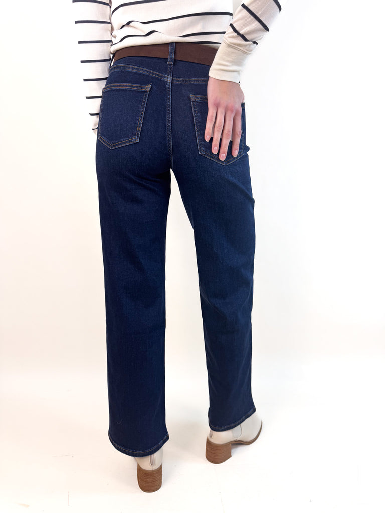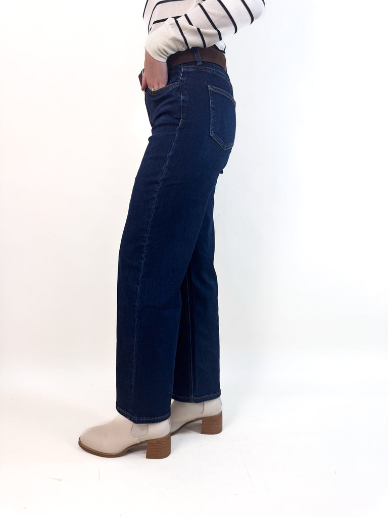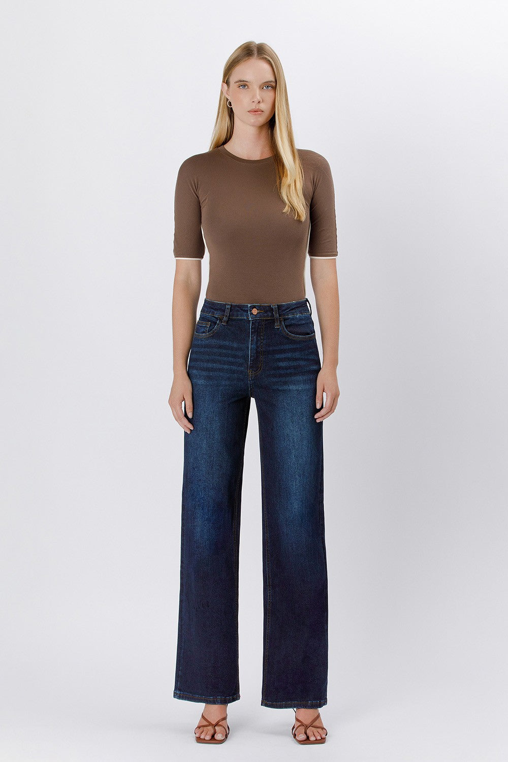 Relaxed vintage-inspired jeans in dark wash with an elevated high rise silhouette.