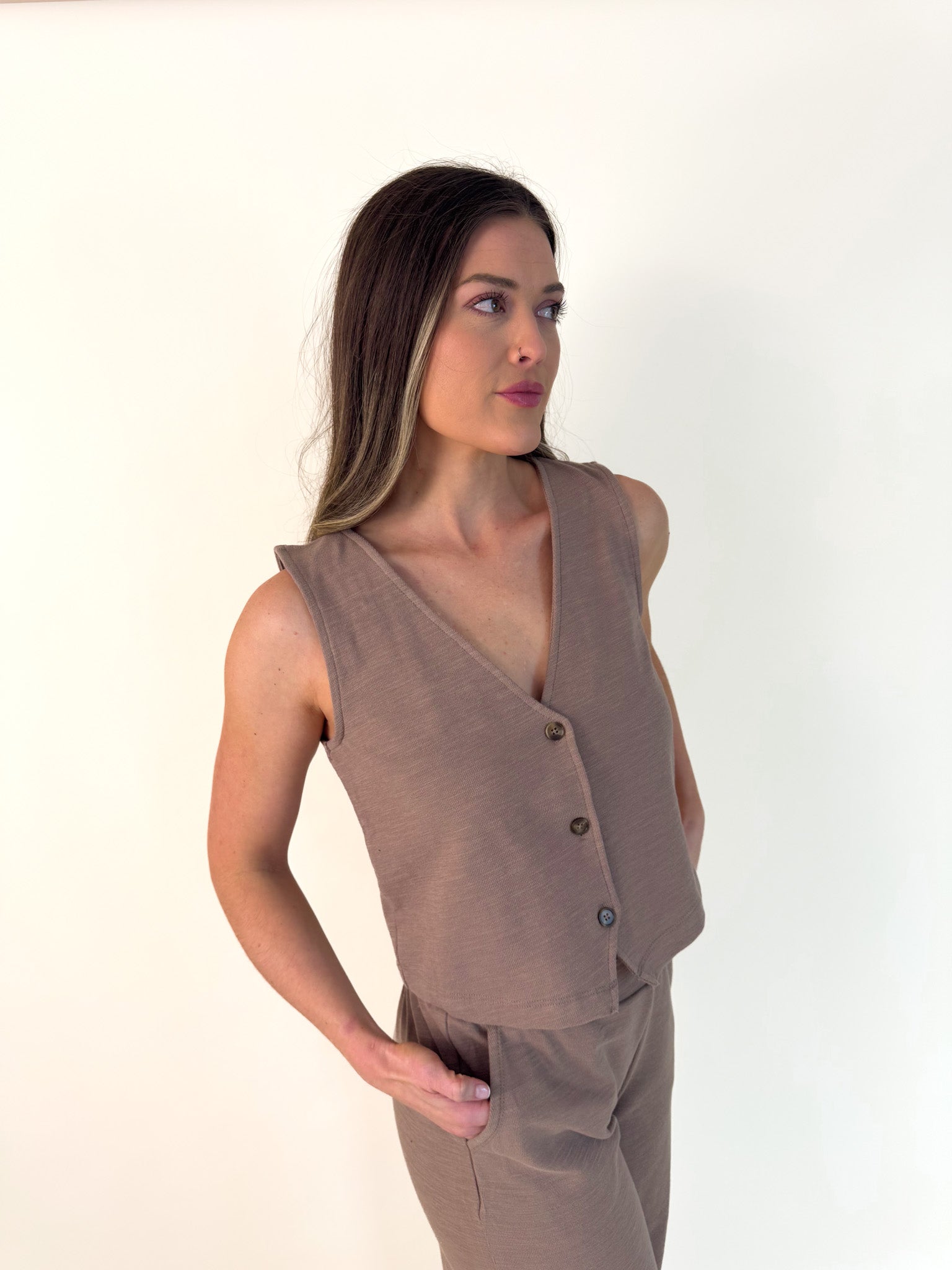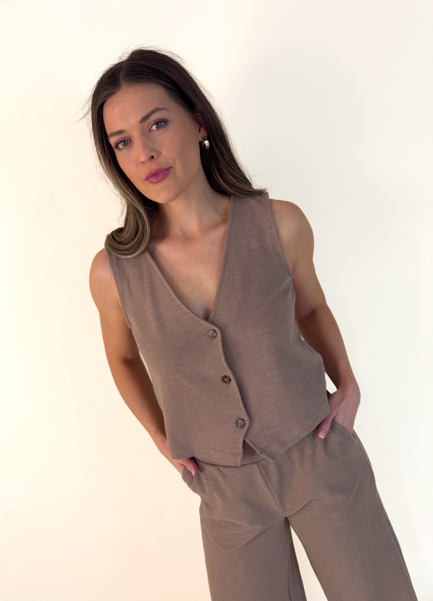 Detailed with a button front, v-neck, and lightweight textured knit fabric, this sleeveless top will be a forever staple in your wardrobe. Make it your go-to outfit with its matching pant or denim.