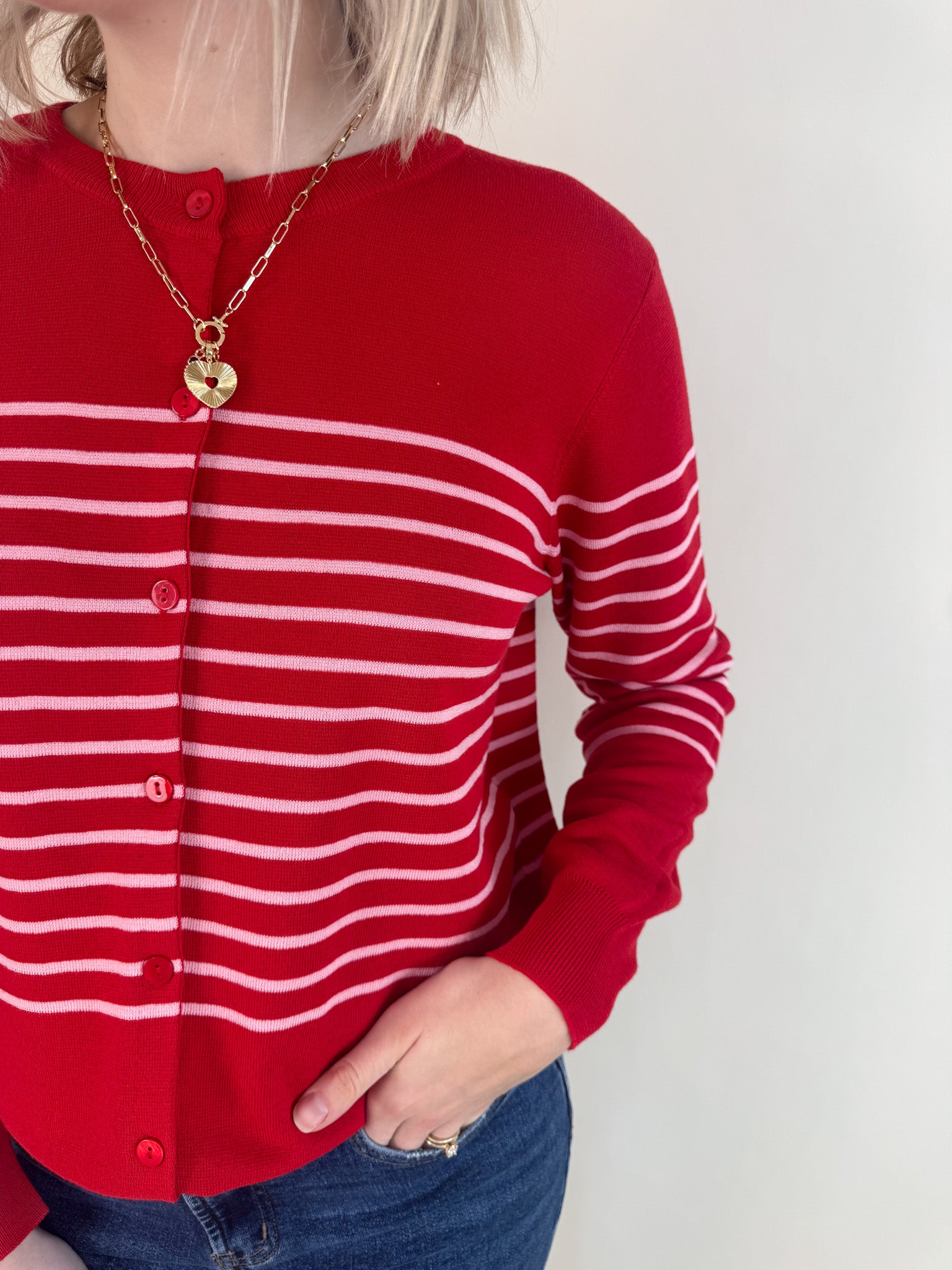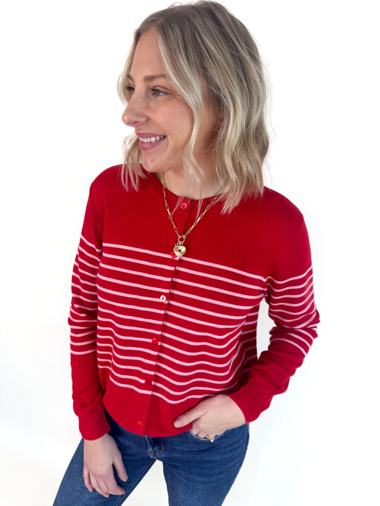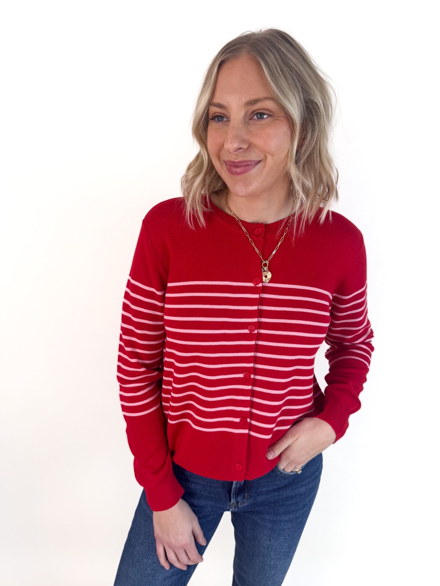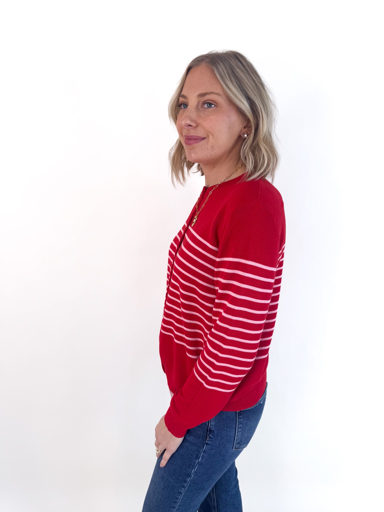 Effortlessly chic and endlessly versatile, this red cardigan features delicate pink stripes that add a touch of sweetness to your wardrobe. Button it up for polished sophistication or wear it open as a relaxed layer over your favorite tank.