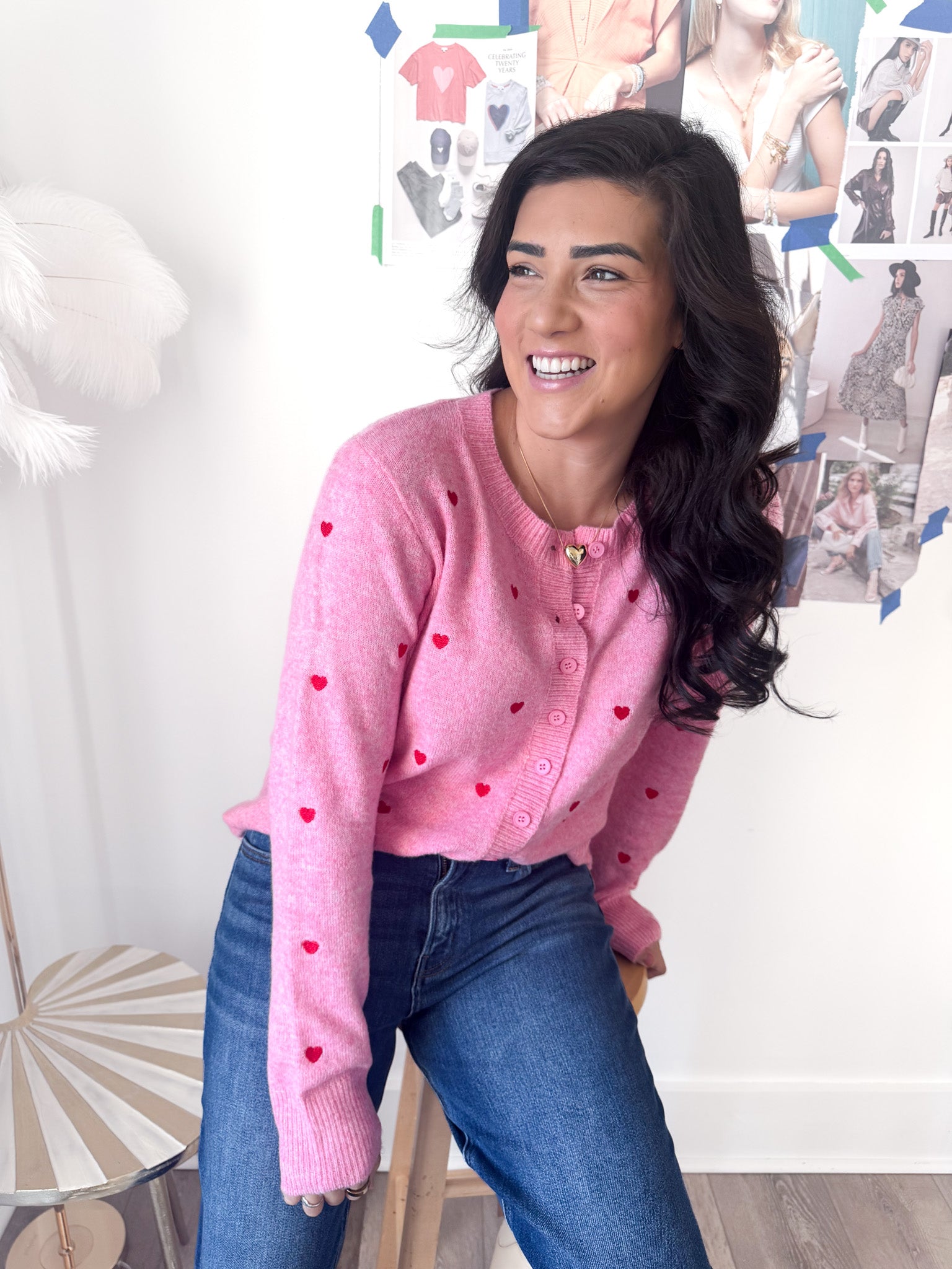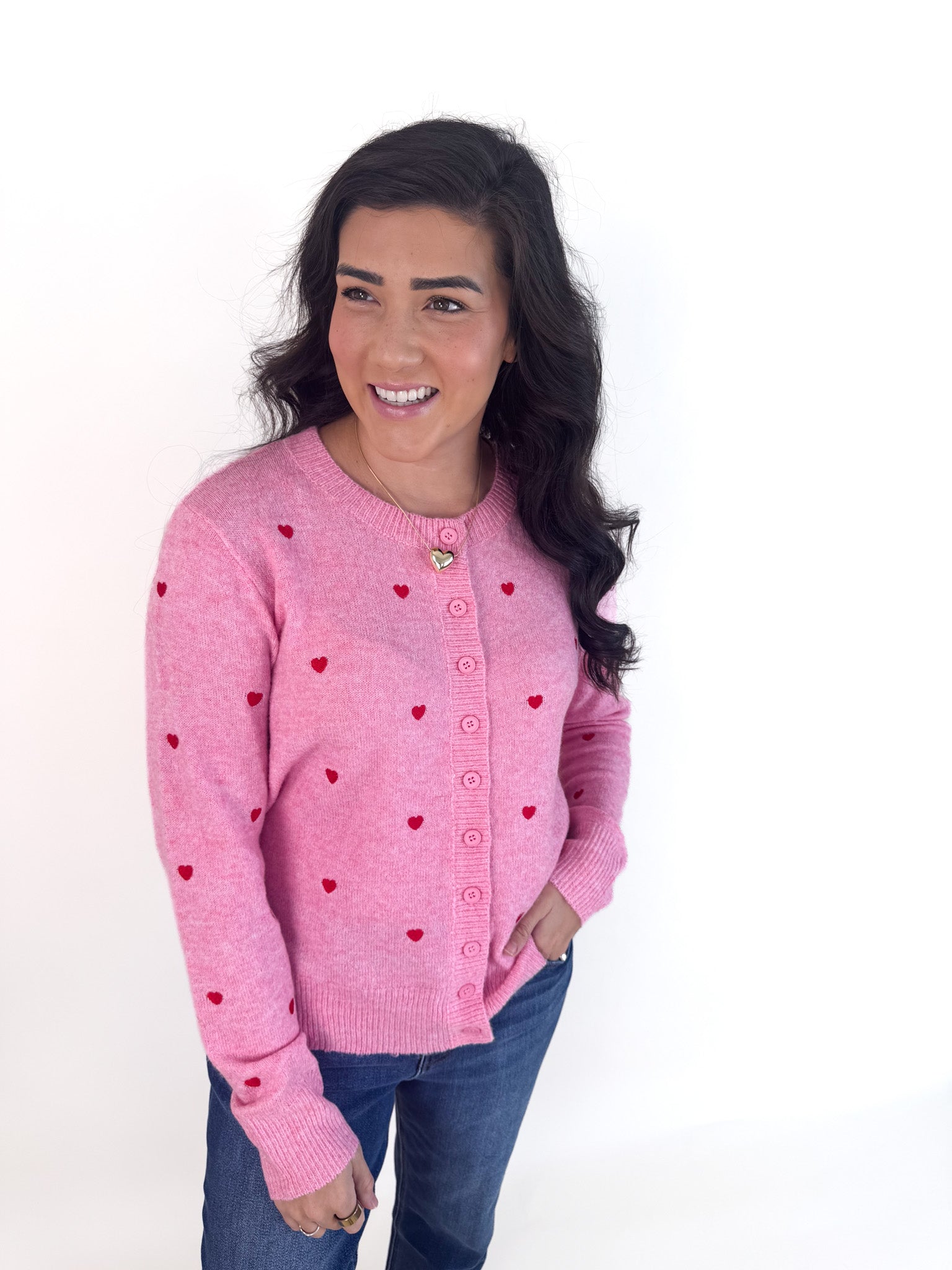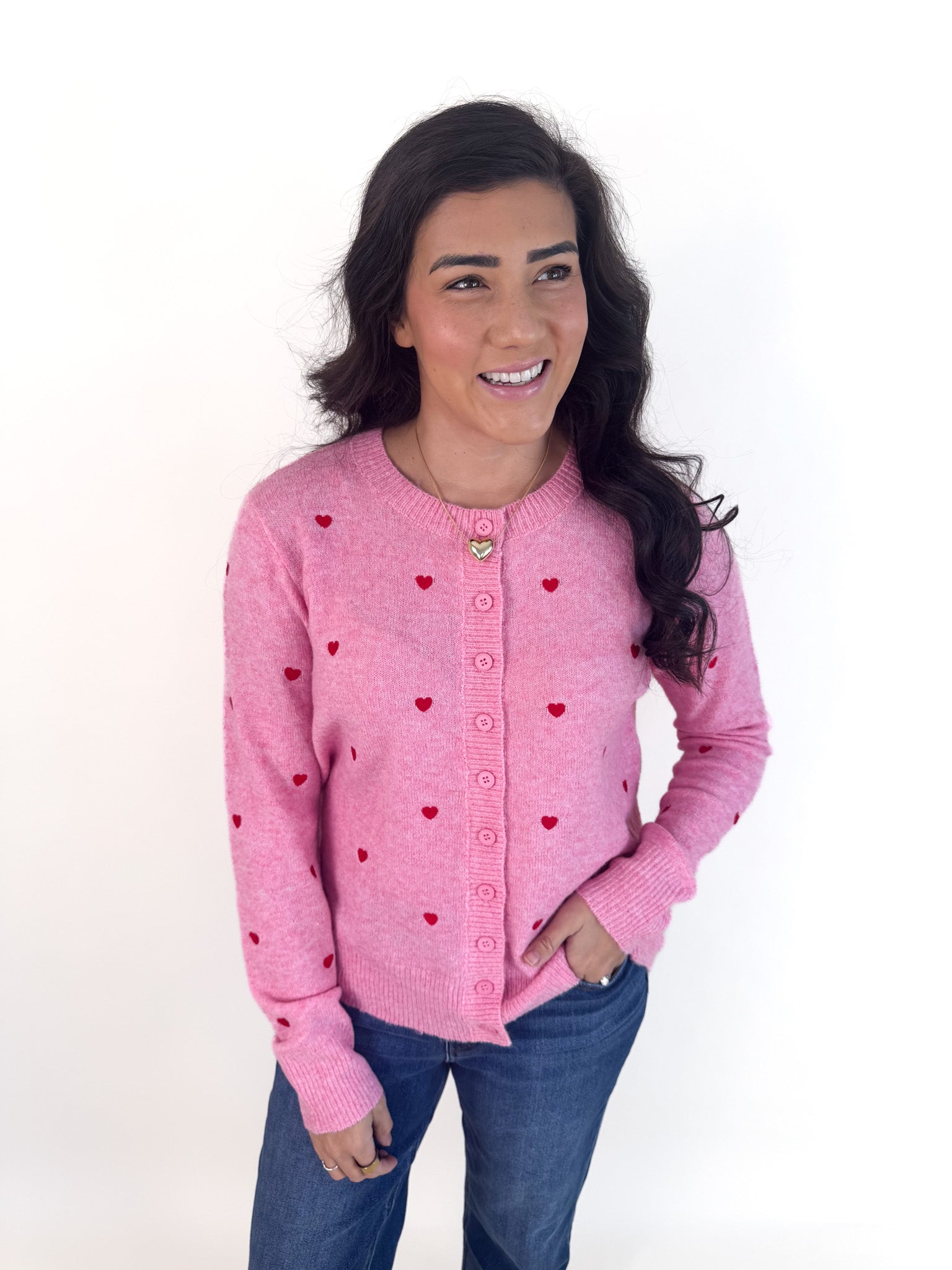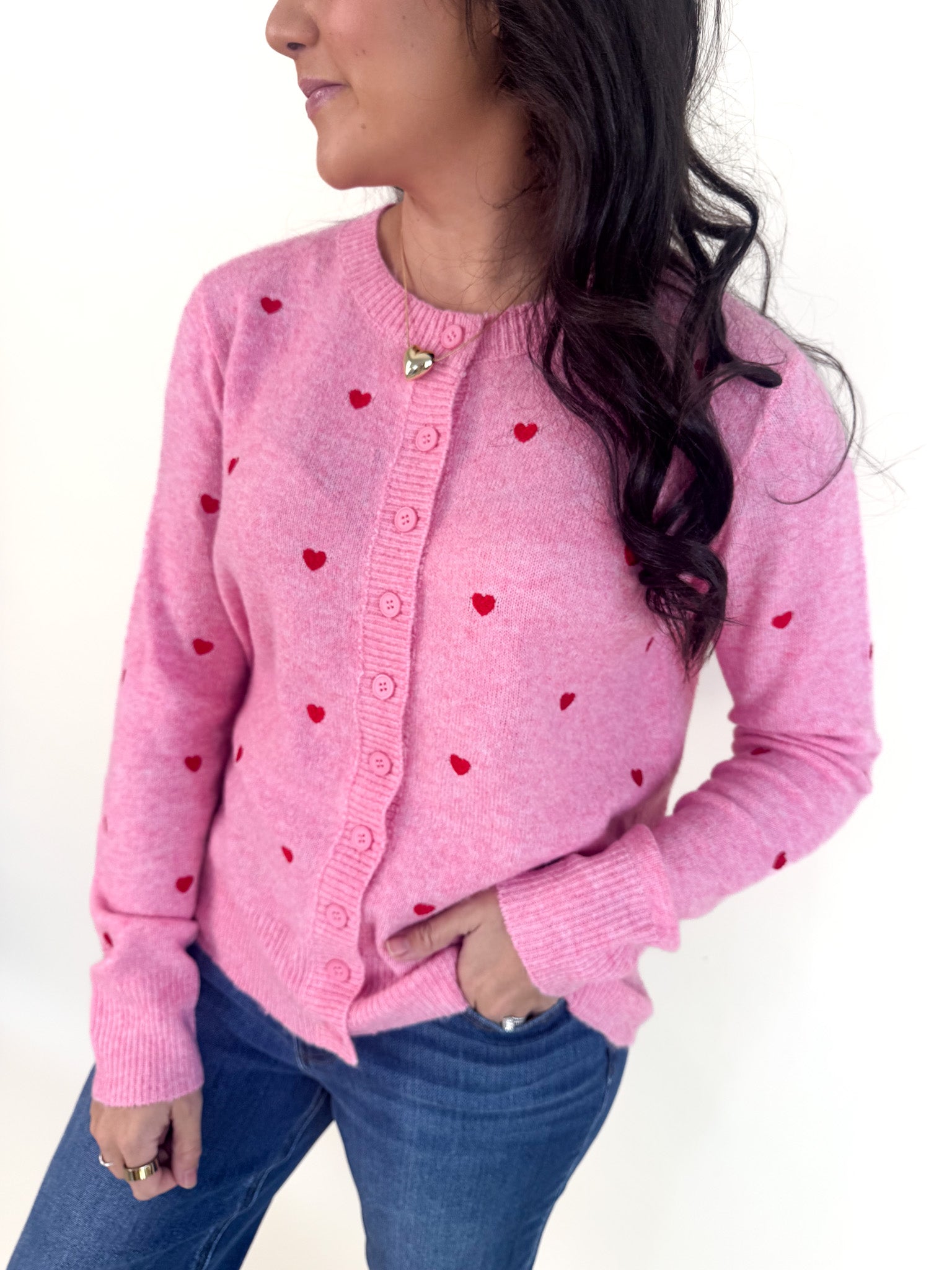 Slip into sweetness with this bright pink button-up cardigan that's as soft as a cloud. Delicate pink stitched hearts dance across the fabric, adding a charming touch to your everyday look. Crafted from the lightest, most breathable material, it's perfect for layering on cool days without the bulk. Whether you're heading out for coffee or cozying up at home, this playful piece brings instant joy and comfort to any outfit.