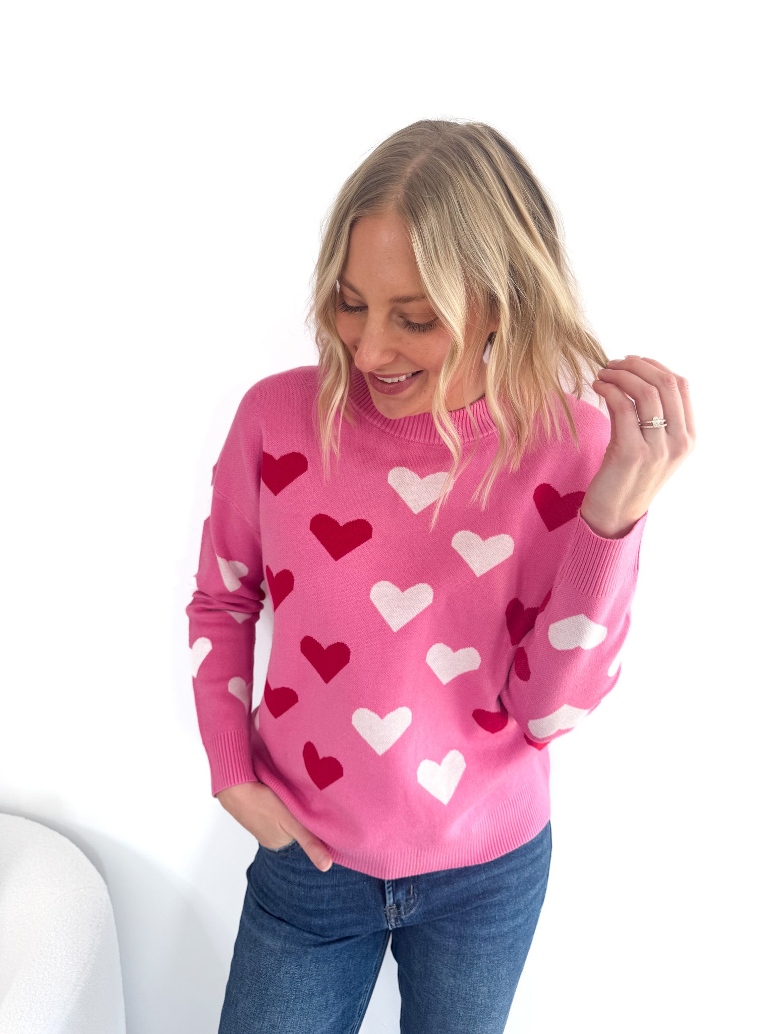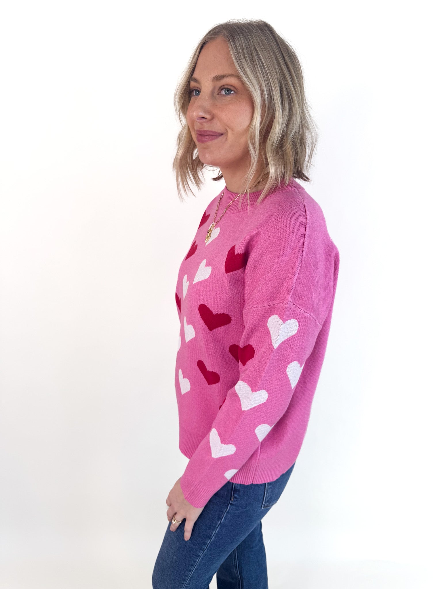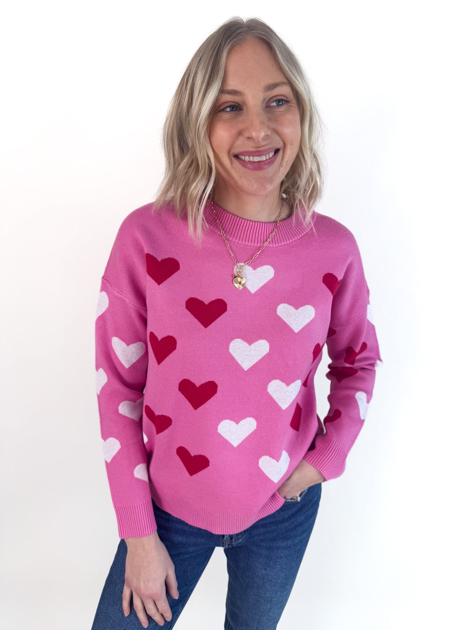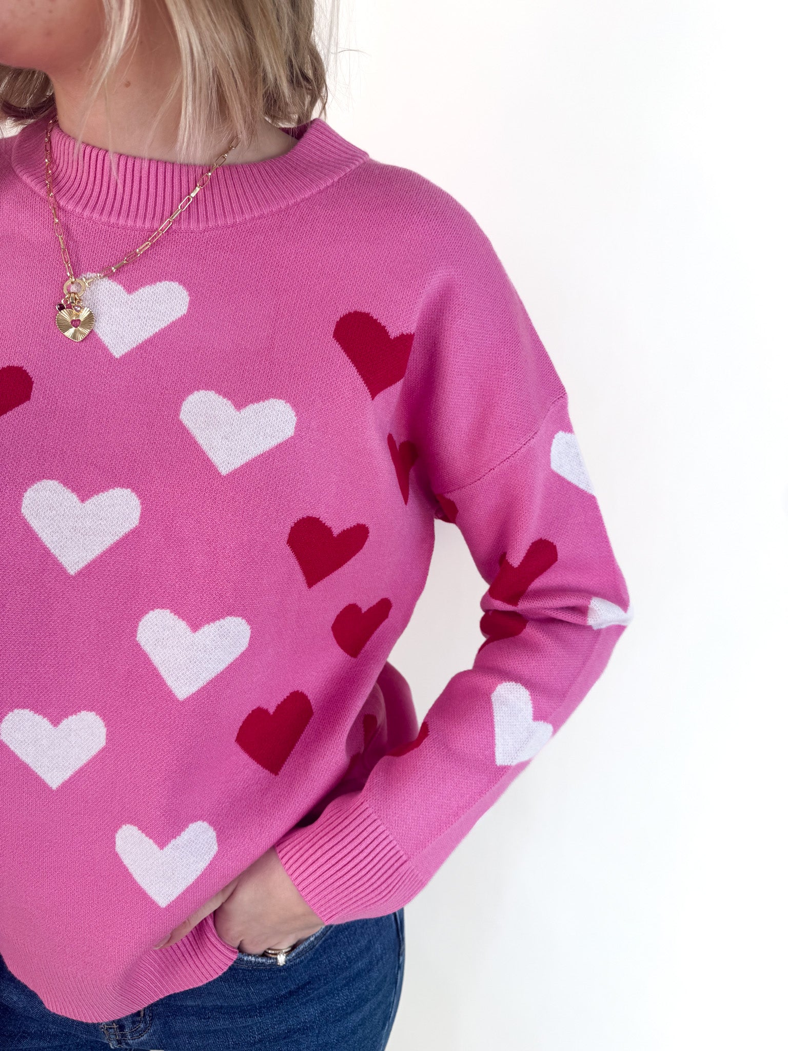 Spread the love this spring with our Valentine Heart Crewneck Sweater! Featuring a soft pink base adorned with cheerful multicolored hearts, this cozy layer is perfect for those days when you want to wear your heart on your sleeve—literally!