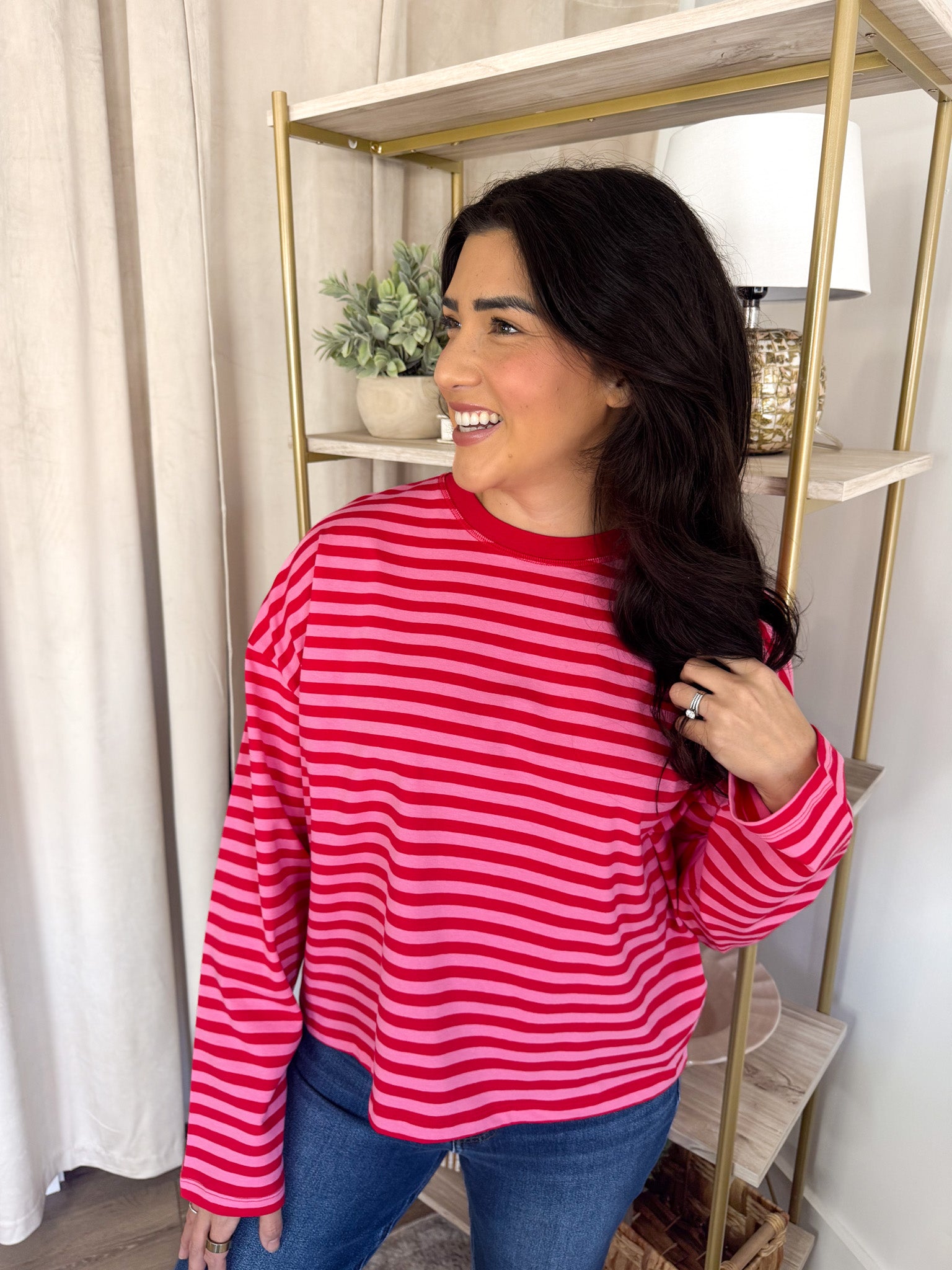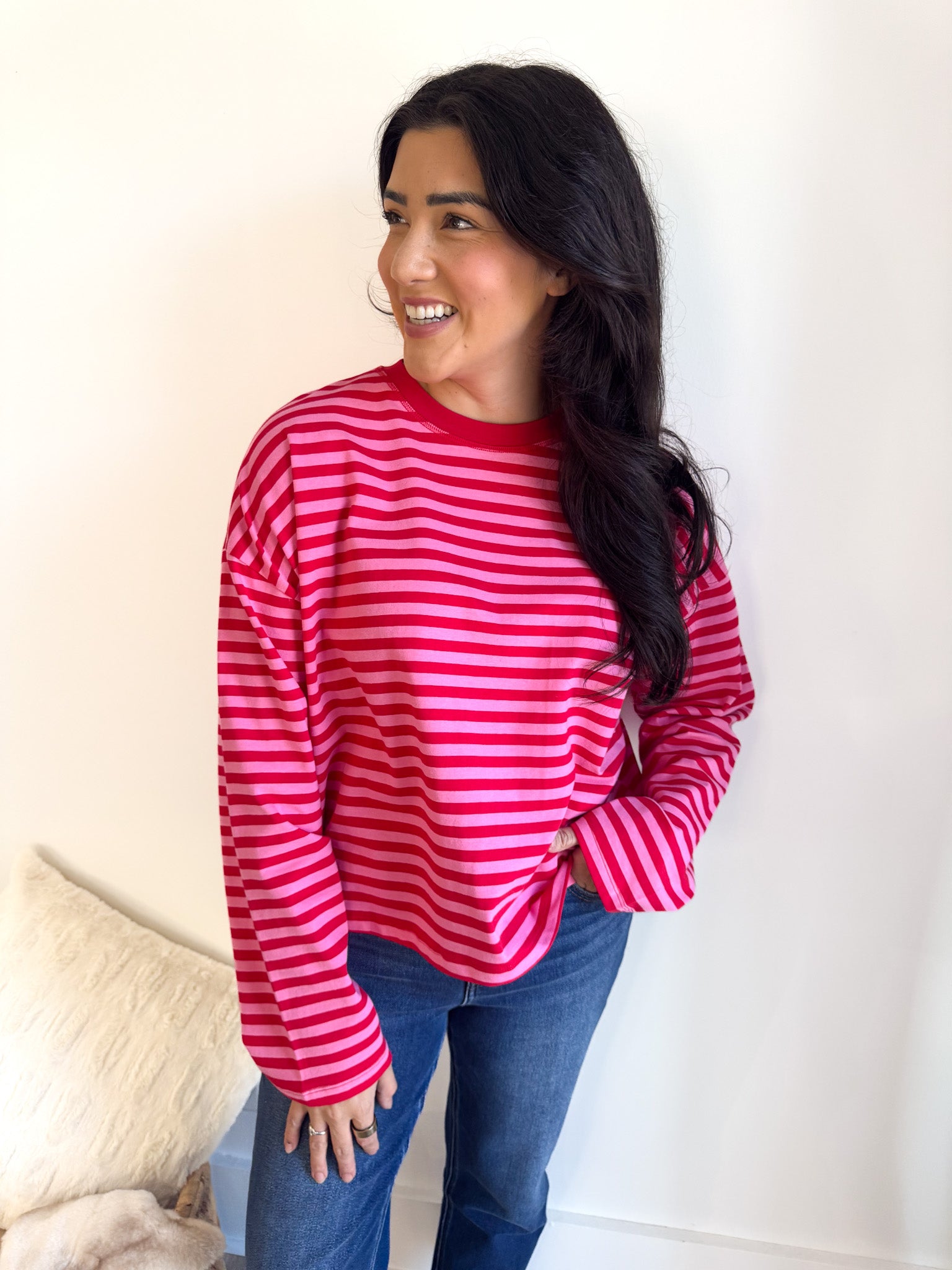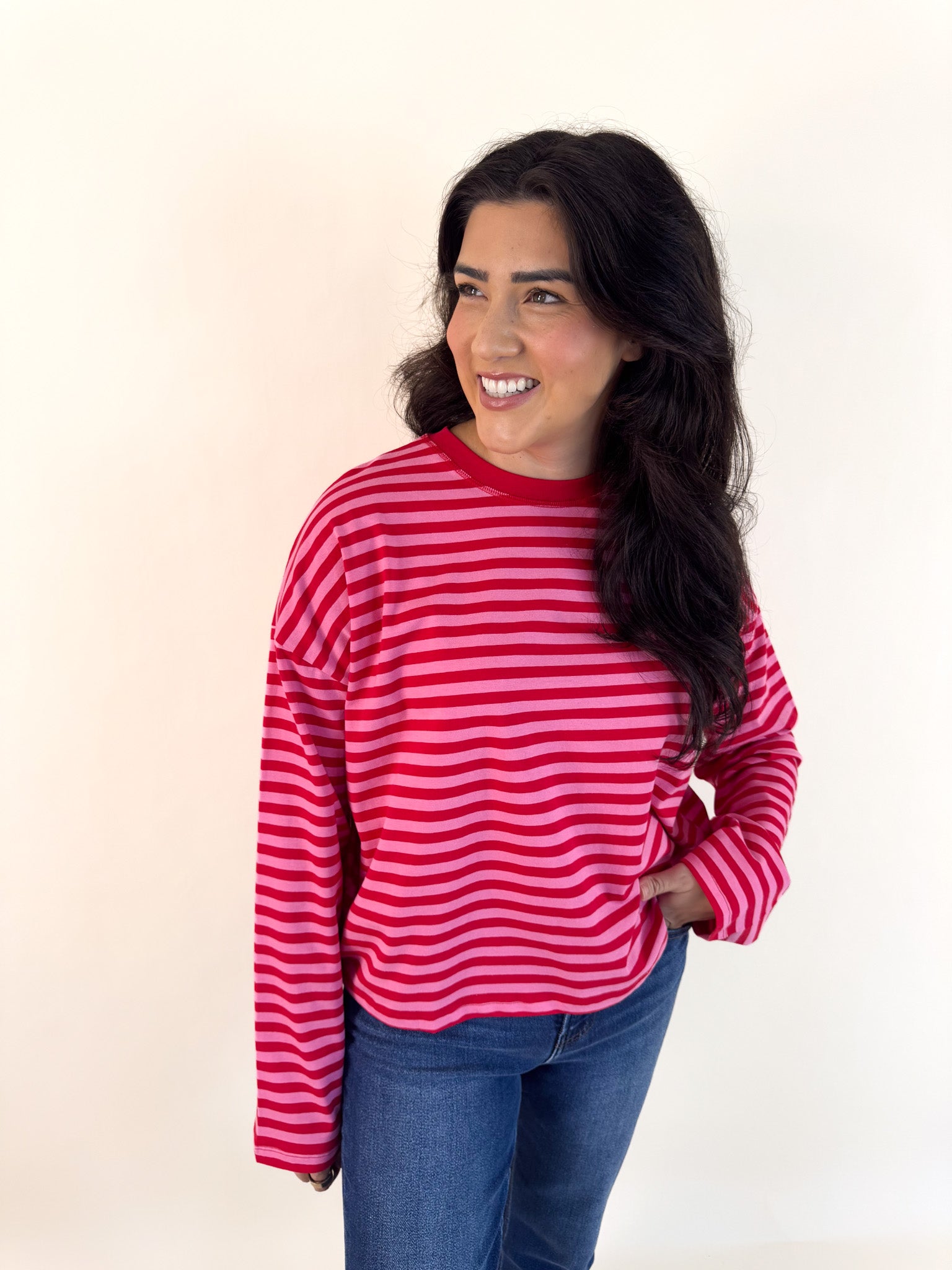 Mix two of our favorite hues in one effortless piece! This striped top pairs hibiscus and cherry for a vibrant pop of color that feels fresh and fun.