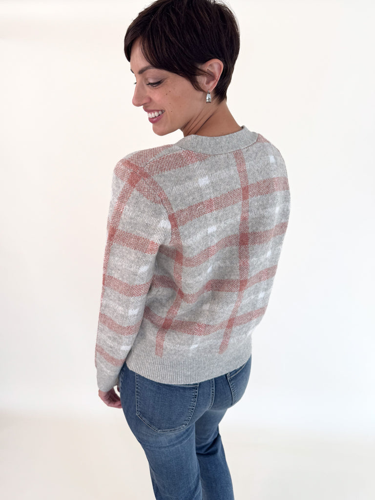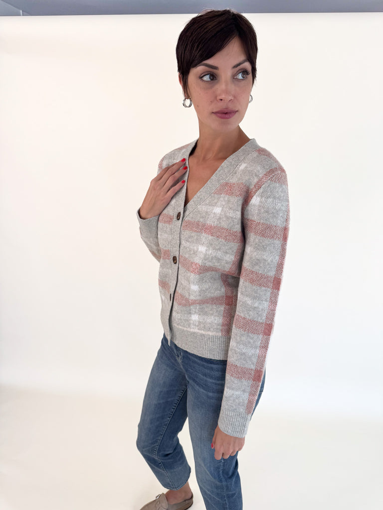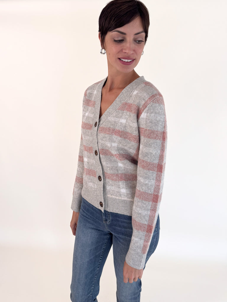 Wrap yourself in comfort and style with this soft grey button-up cardigan, designed with a timeless rust and white plaid pattern.