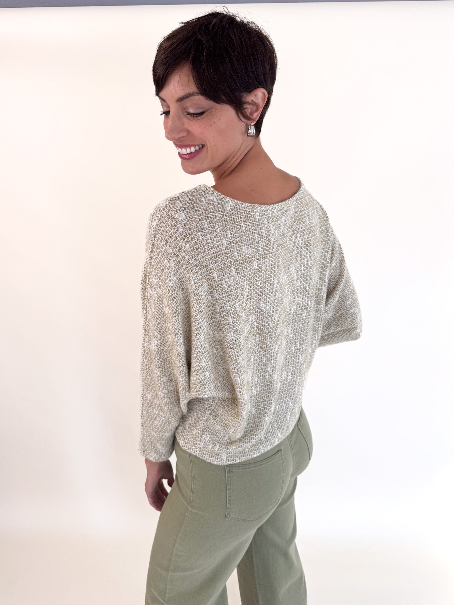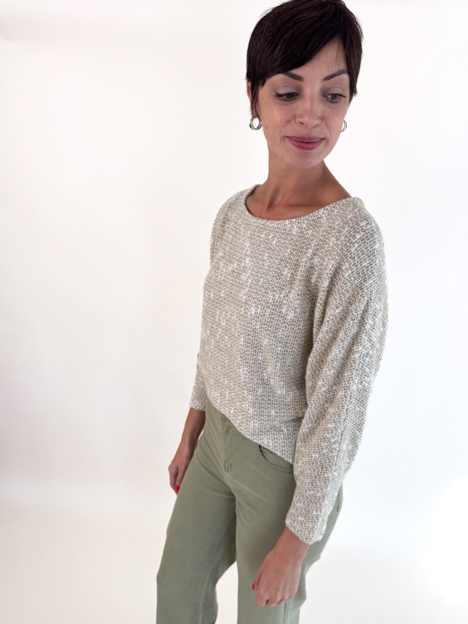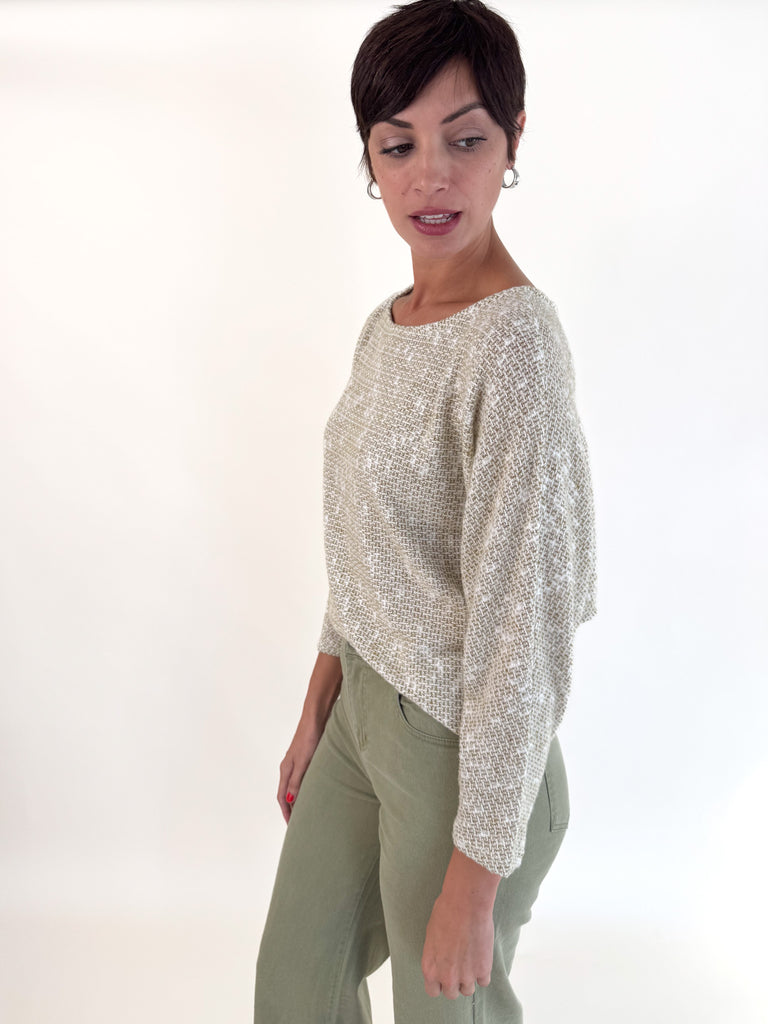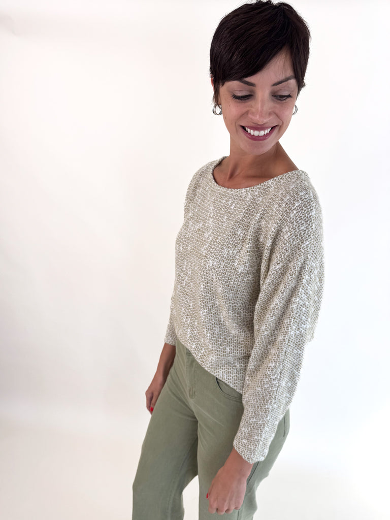 Breezy and effortless, this green and white woven knit top is the perfect piece for those in-between fall days. Pair it with denim or layered under a jacket for a seamless transition into fall style.