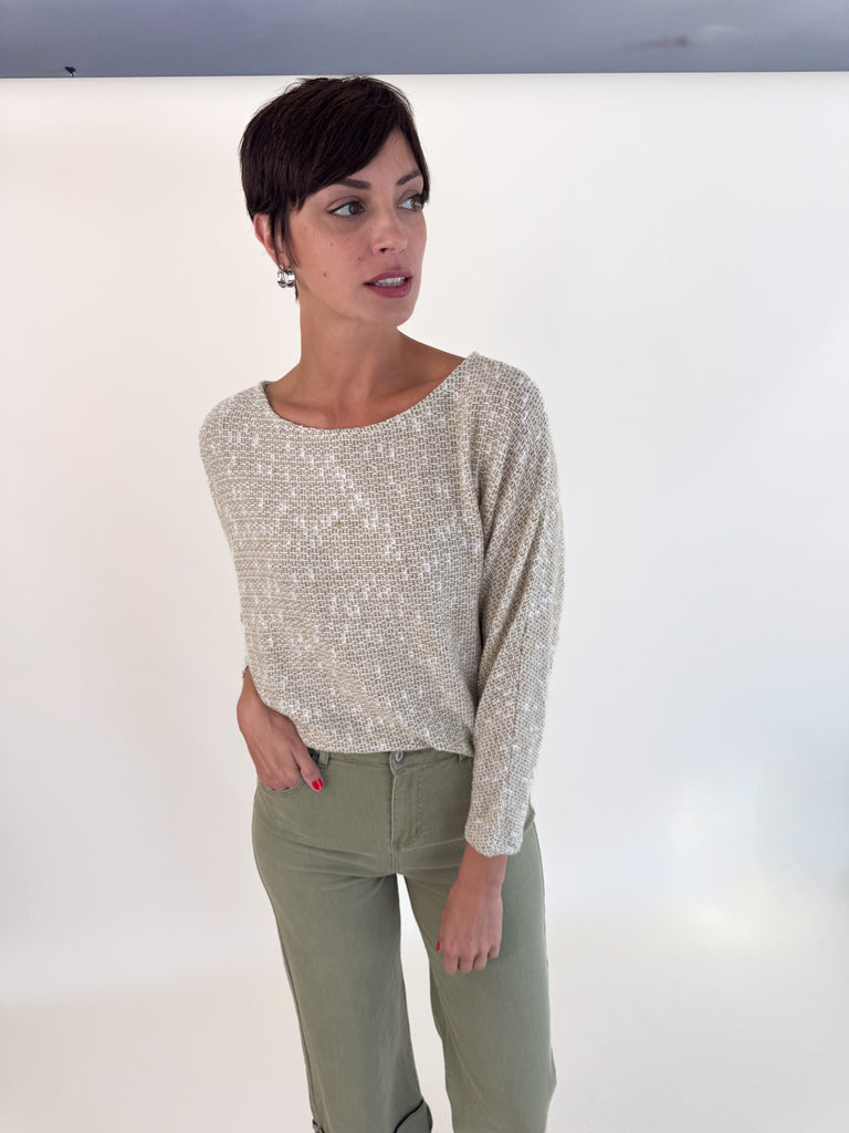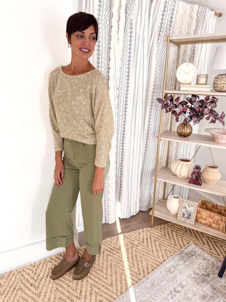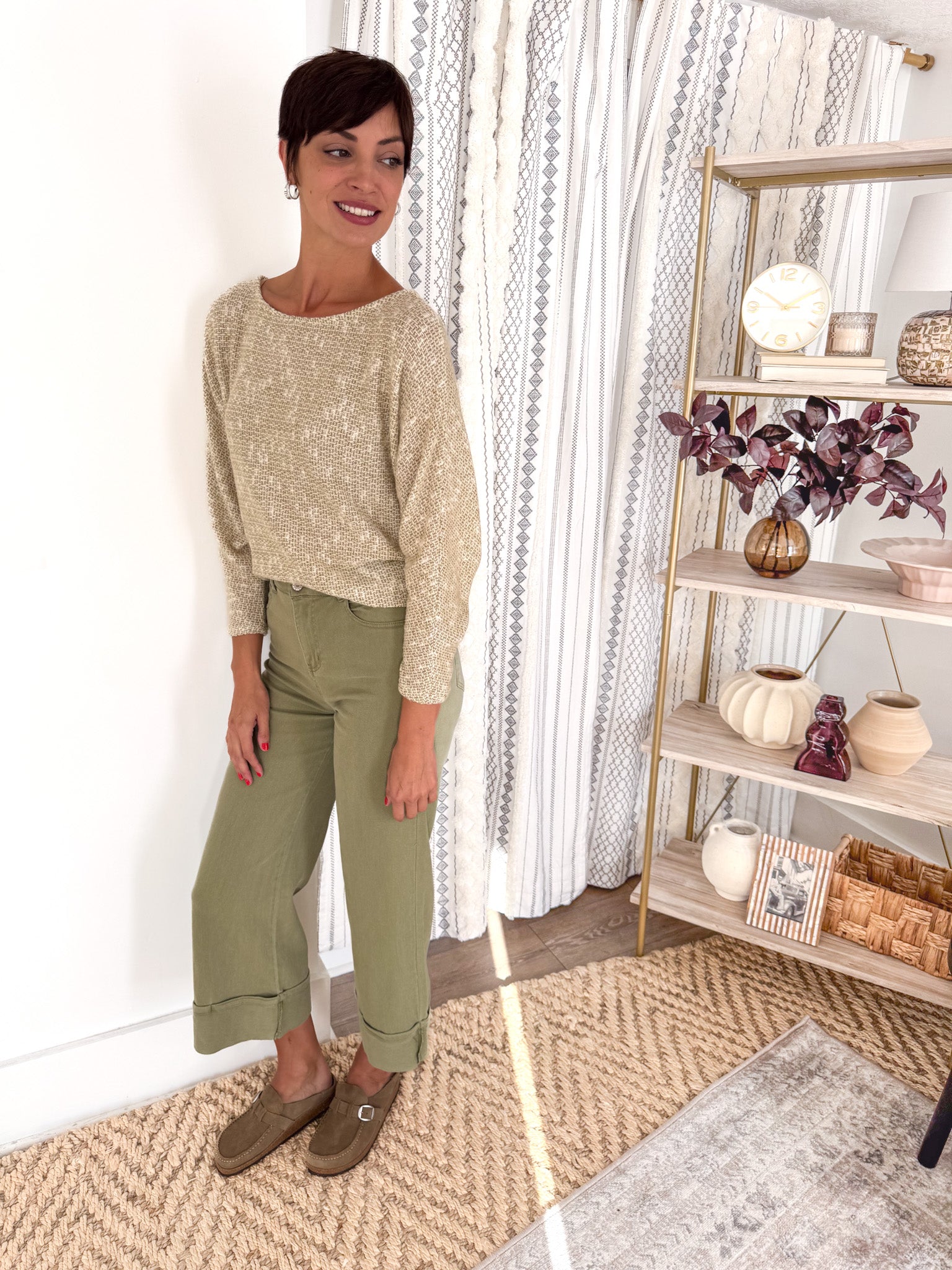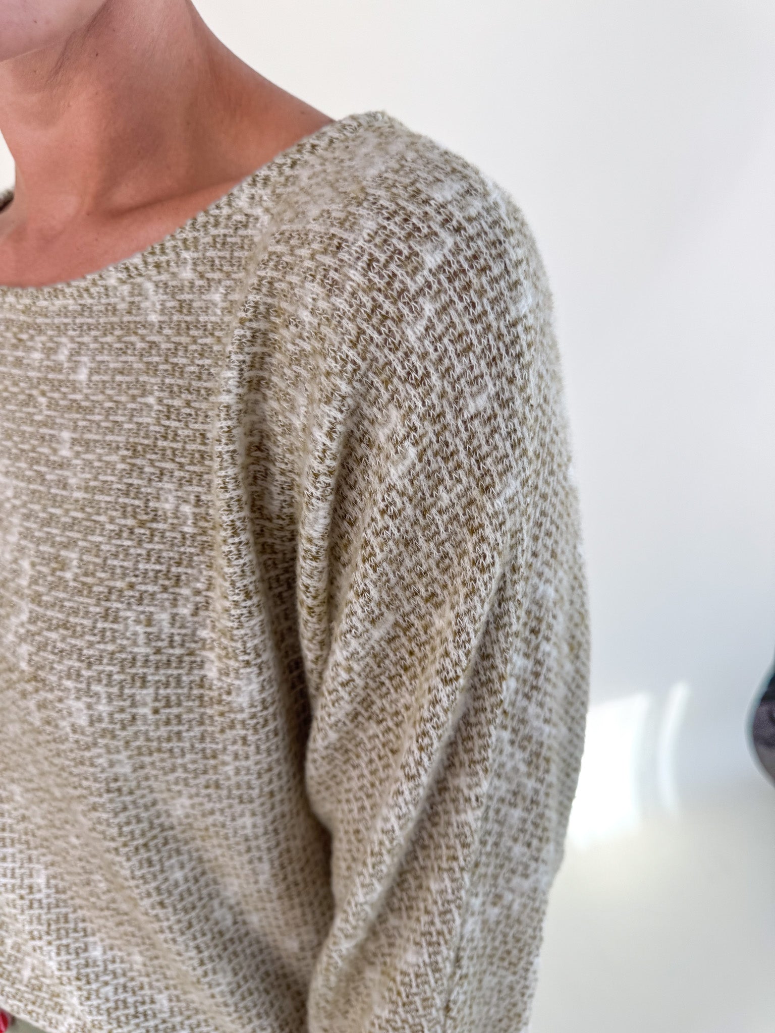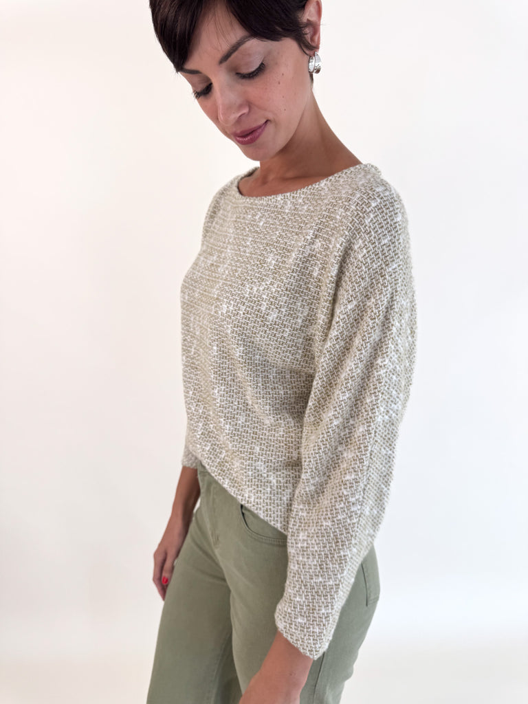Breezy and effortless, this green and white woven knit top is the perfect piece for those in-between fall days. Pair it with denim or layered under a jacket for a seamless transition into fall style.