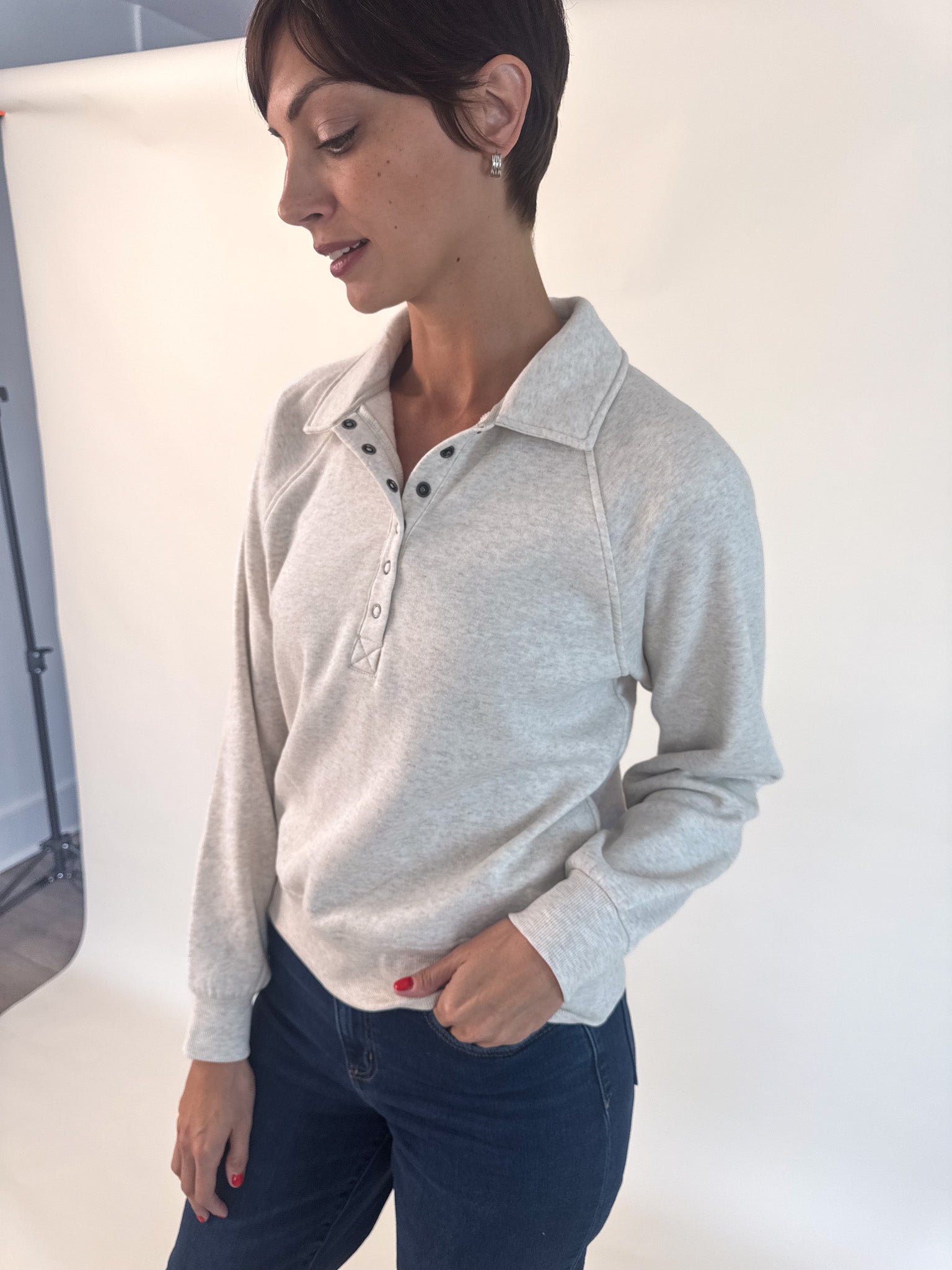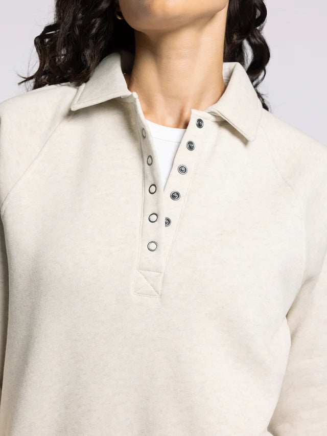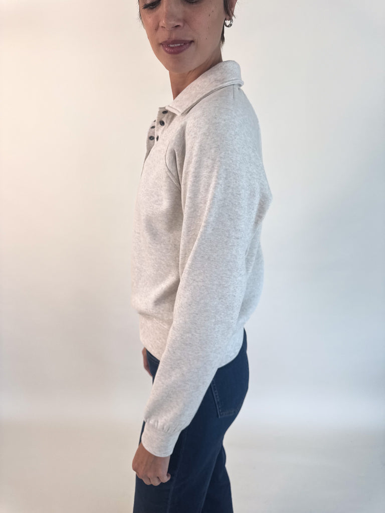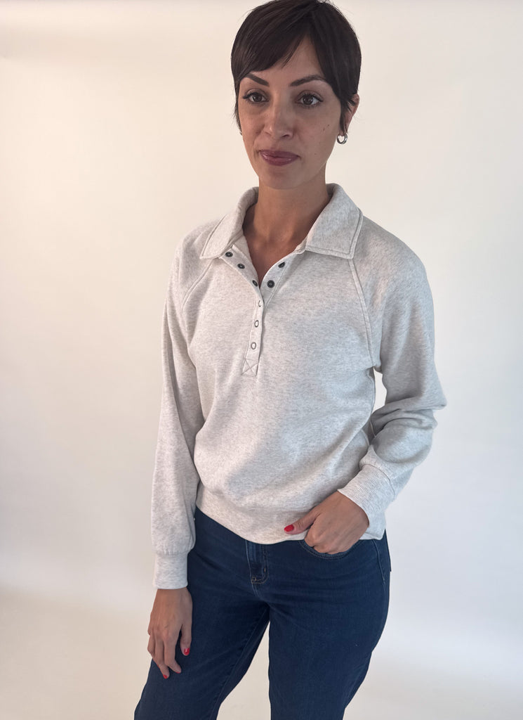 Get comfortable in this oh-so soft pullover featuring a half snap front closure, relaxed fit and collared neckline.