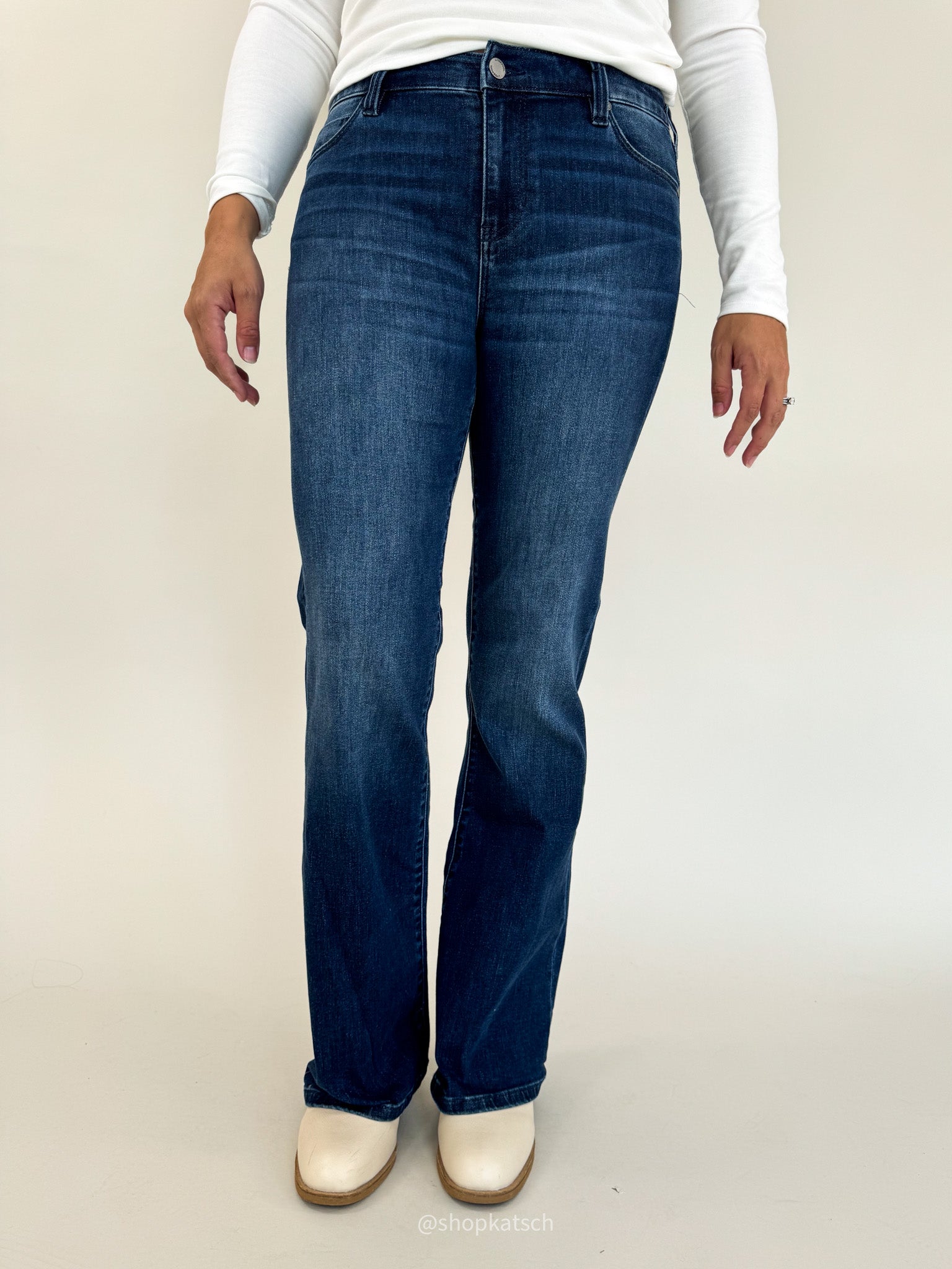 Slimming through the hips and thighs before gently releasing at the knee and leg opening, these jeans are known for their iconic bootcut silhouette. The wide leg opening elegantly drapes over your favorite footwear, whether it's classic boots or heels, completing your look with effortless sophistication. Whether you're strolling through city streets or hitting the dance floor, these bootcut jeans are your trusted companion for every occasion.