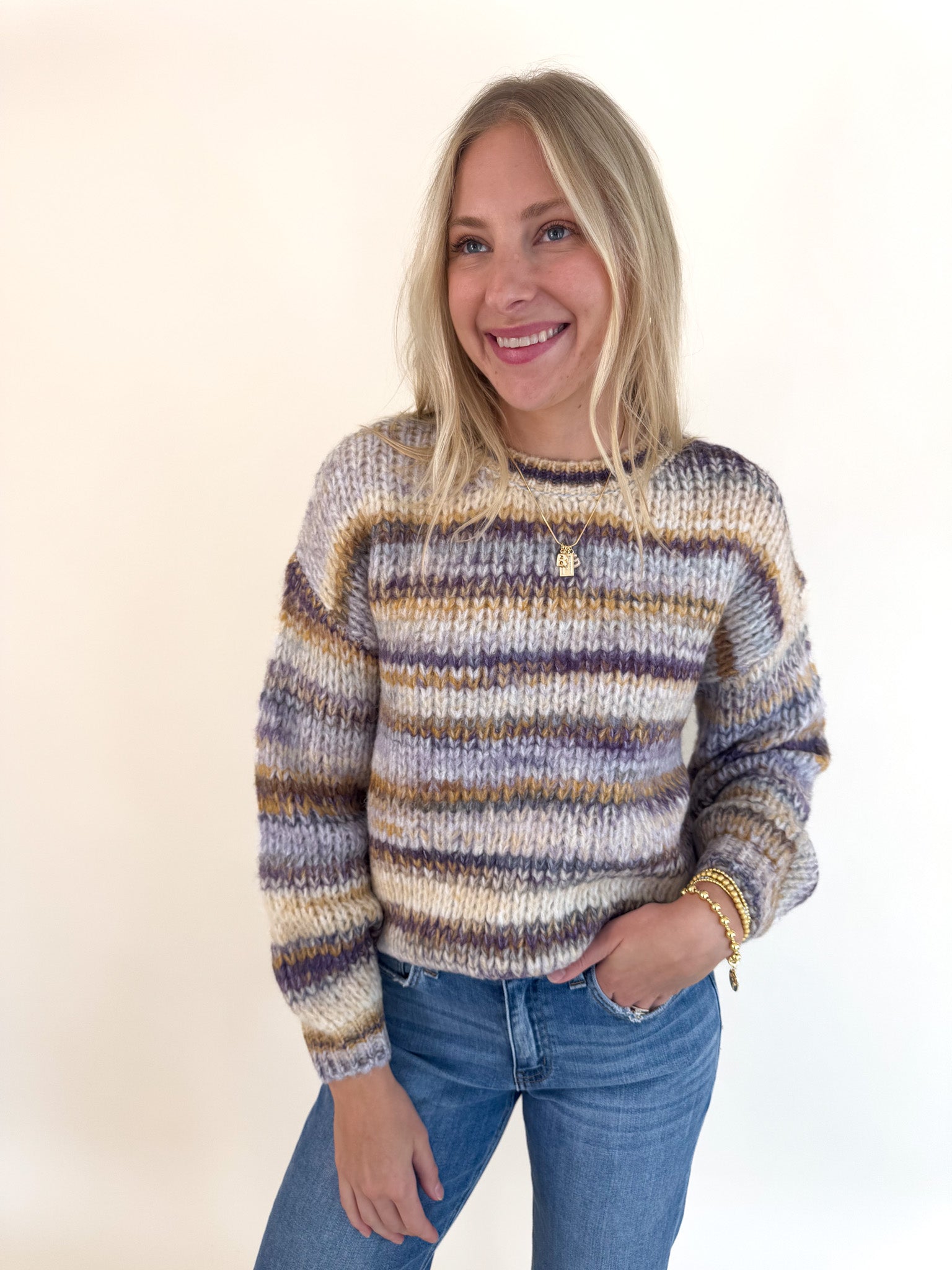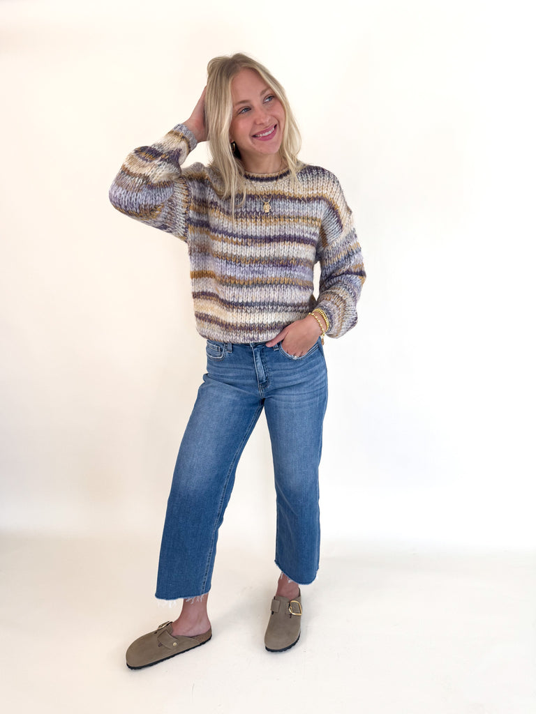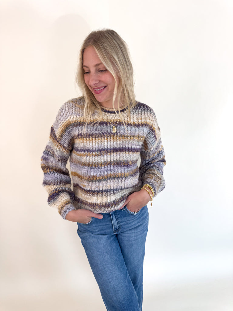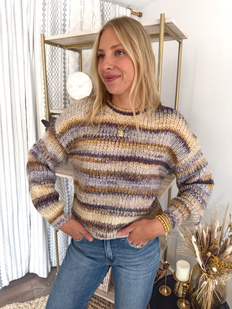Cozy meets chic in this soft knitted crewneck sweater, designed with a dreamy ombre pattern that blends rich purples into warm golden tones—perfect for fall.