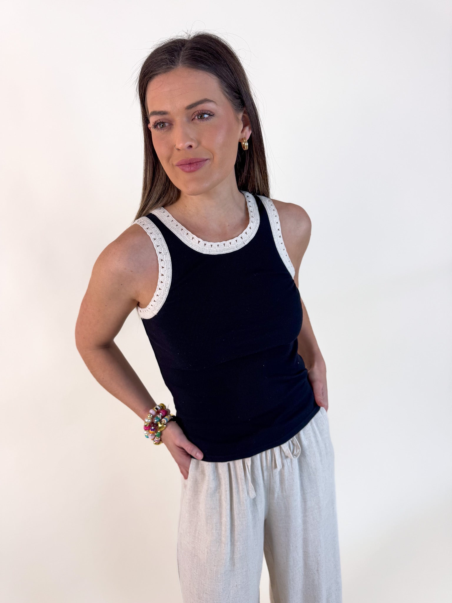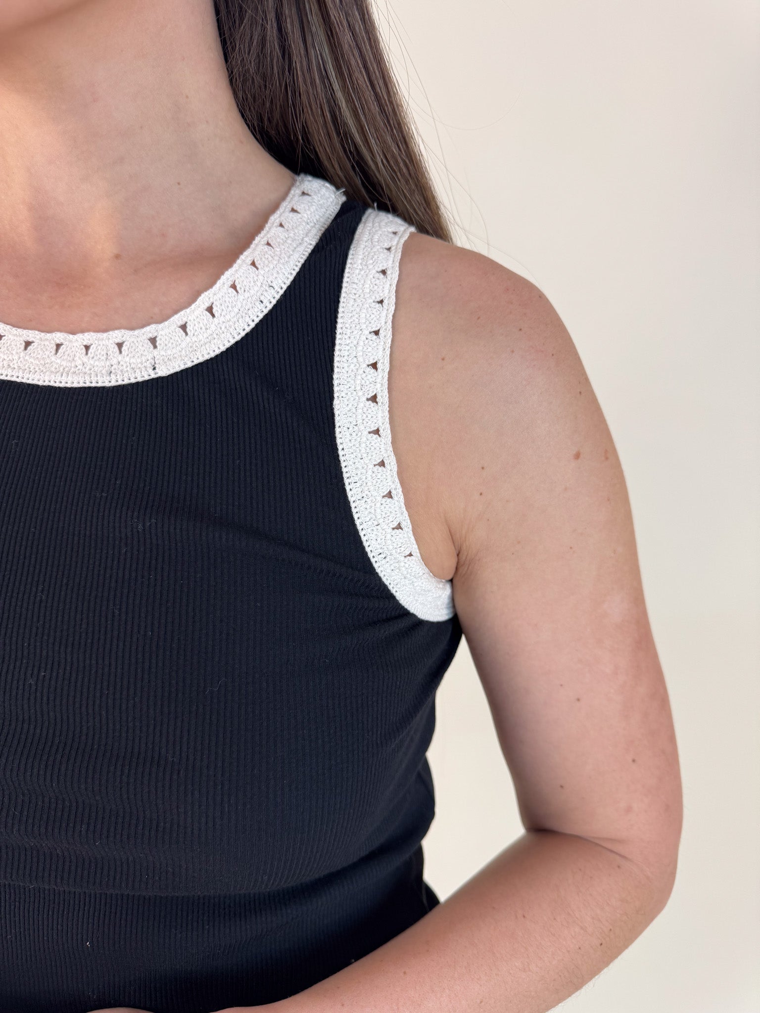 It’s all in the details with feather rib fabric and crochet trim at neckline and arms. We love this updated tank with high waist denim or linen trousers.