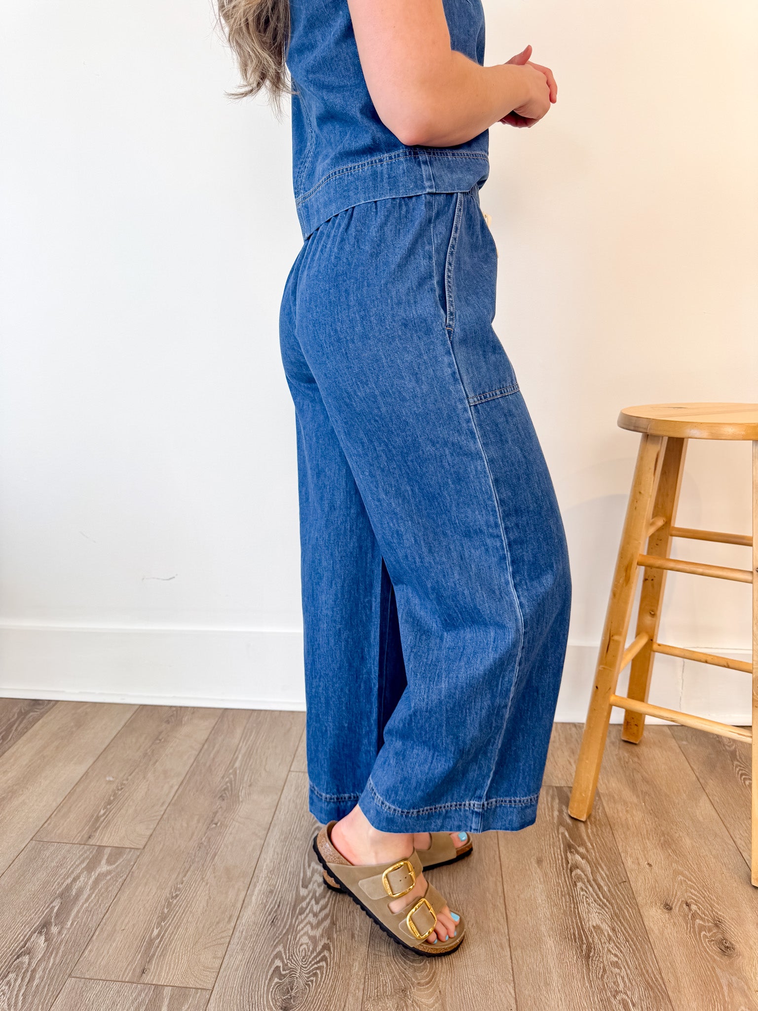 Count us in for ultra soft denim made of 100% cotton. These wide leg pants feature patch pockets, drawcord waistband and midweight feel to them. Dress it up or down with its matching top or a simple tank.