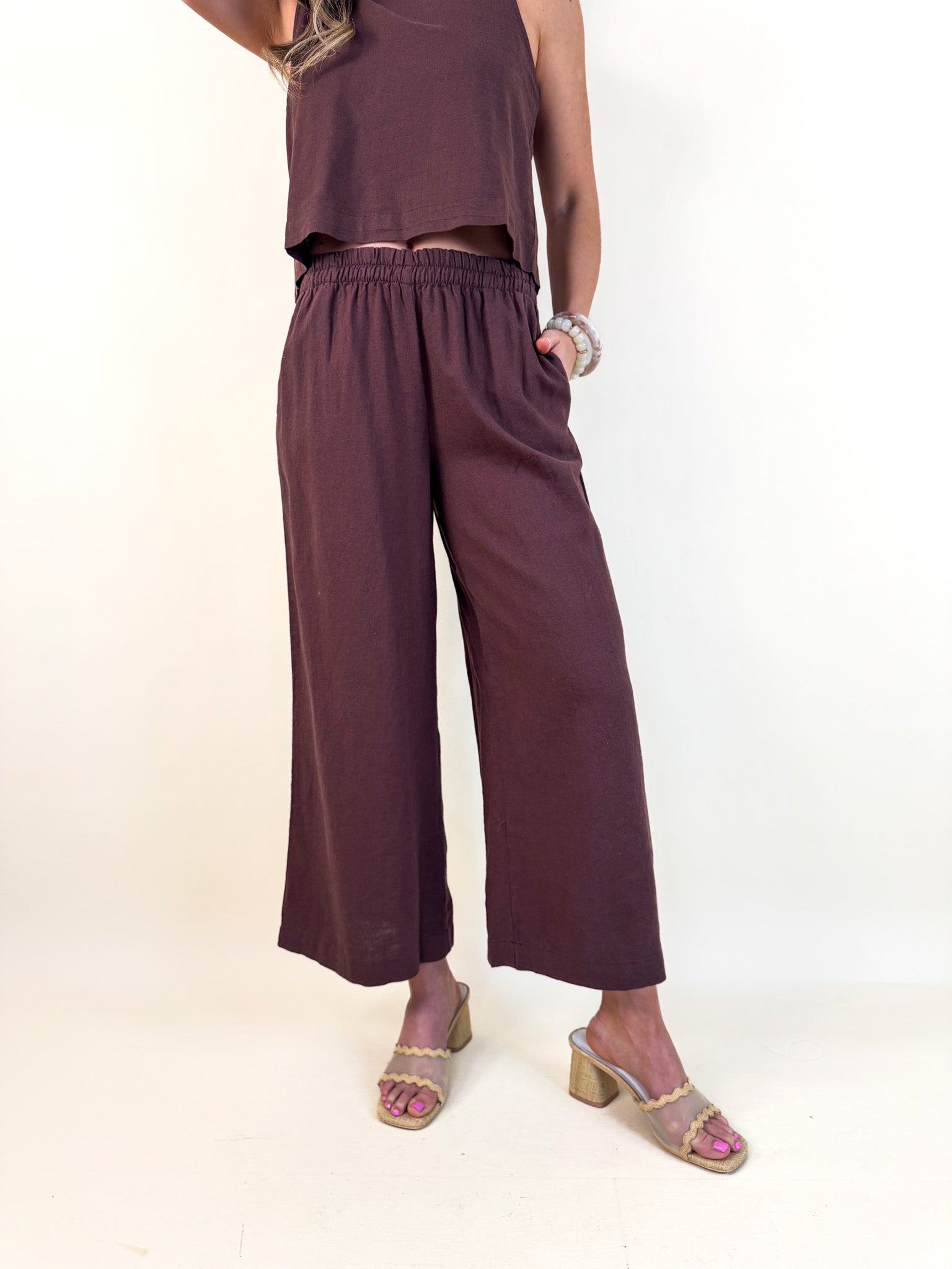 Detailed with an elastic waistband, side seam pockets, and washed linen blend fabric, these high rise pants will be a forever staple in your wardrobe. Make it a set with the Sloane Linen Top.