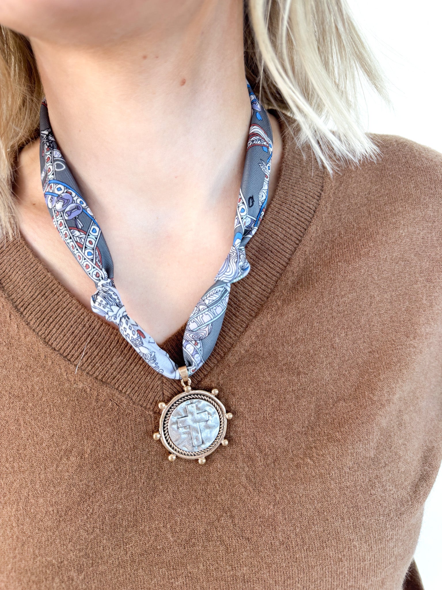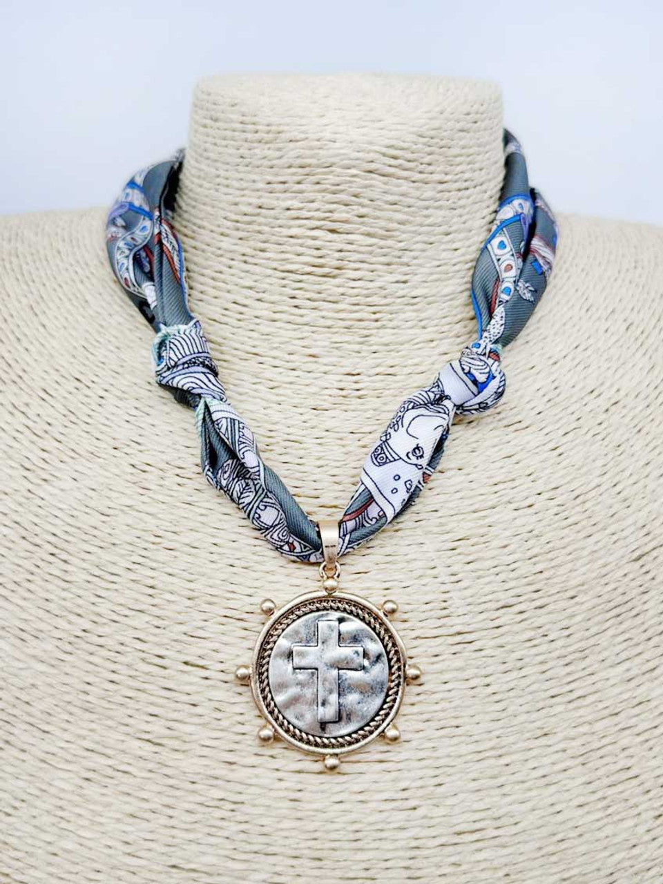 Cross pendant necklace with bandana detailing. A versatile accessory that works beautifully on its own or layered with other pieces for a personalized look.