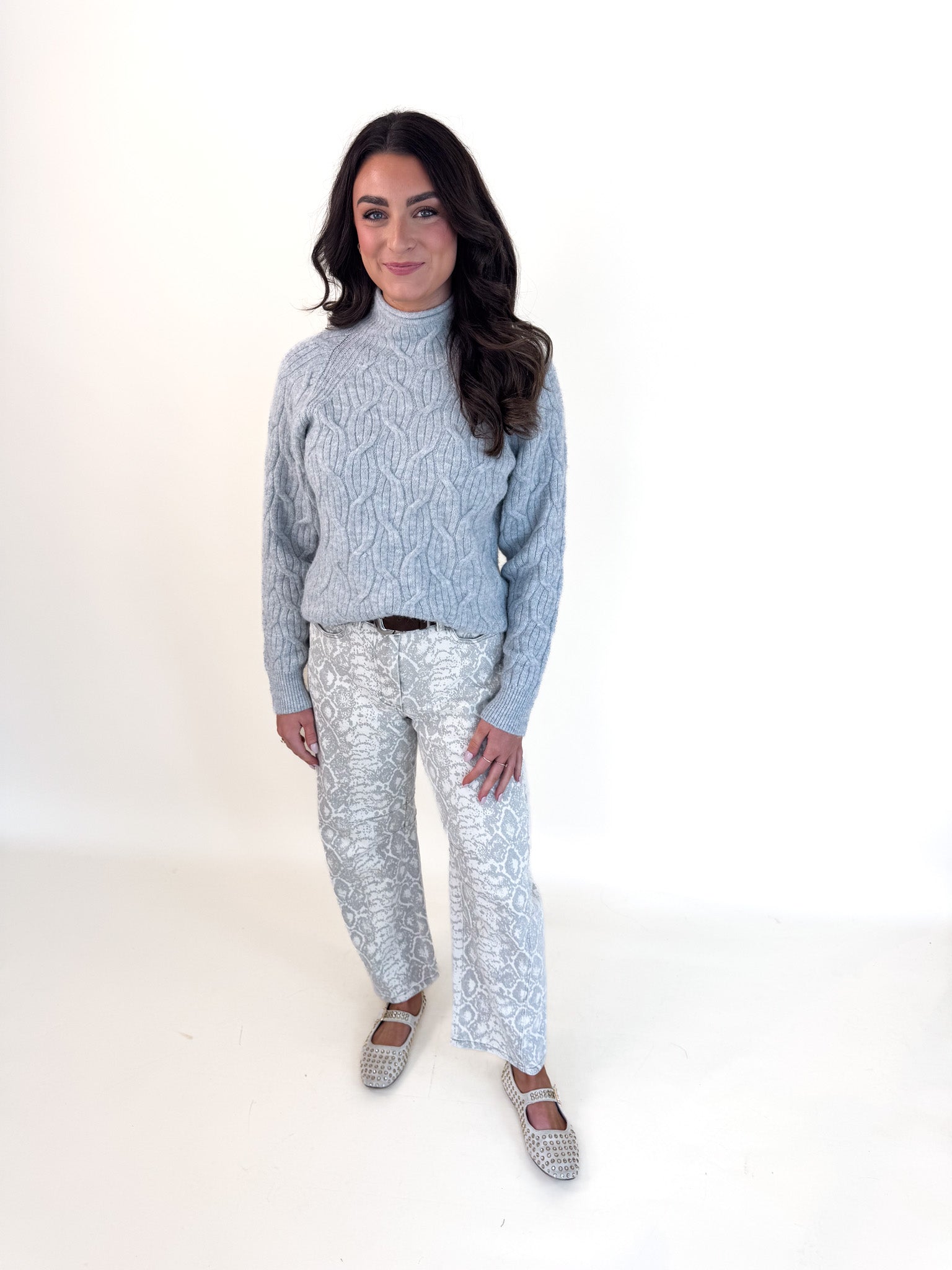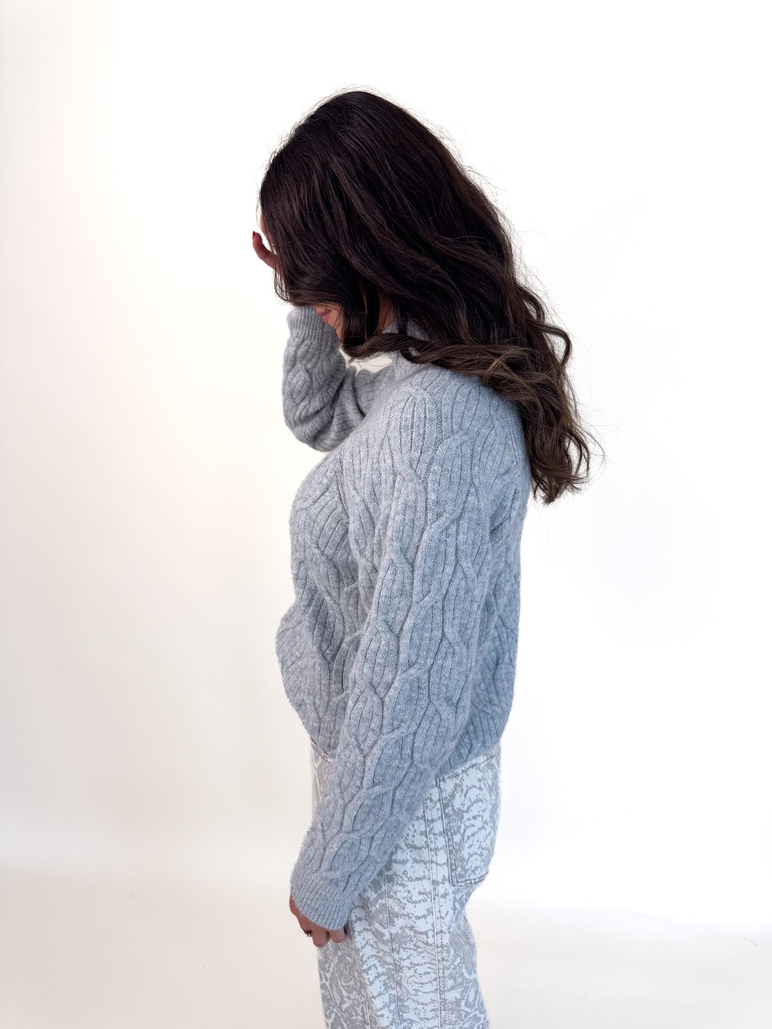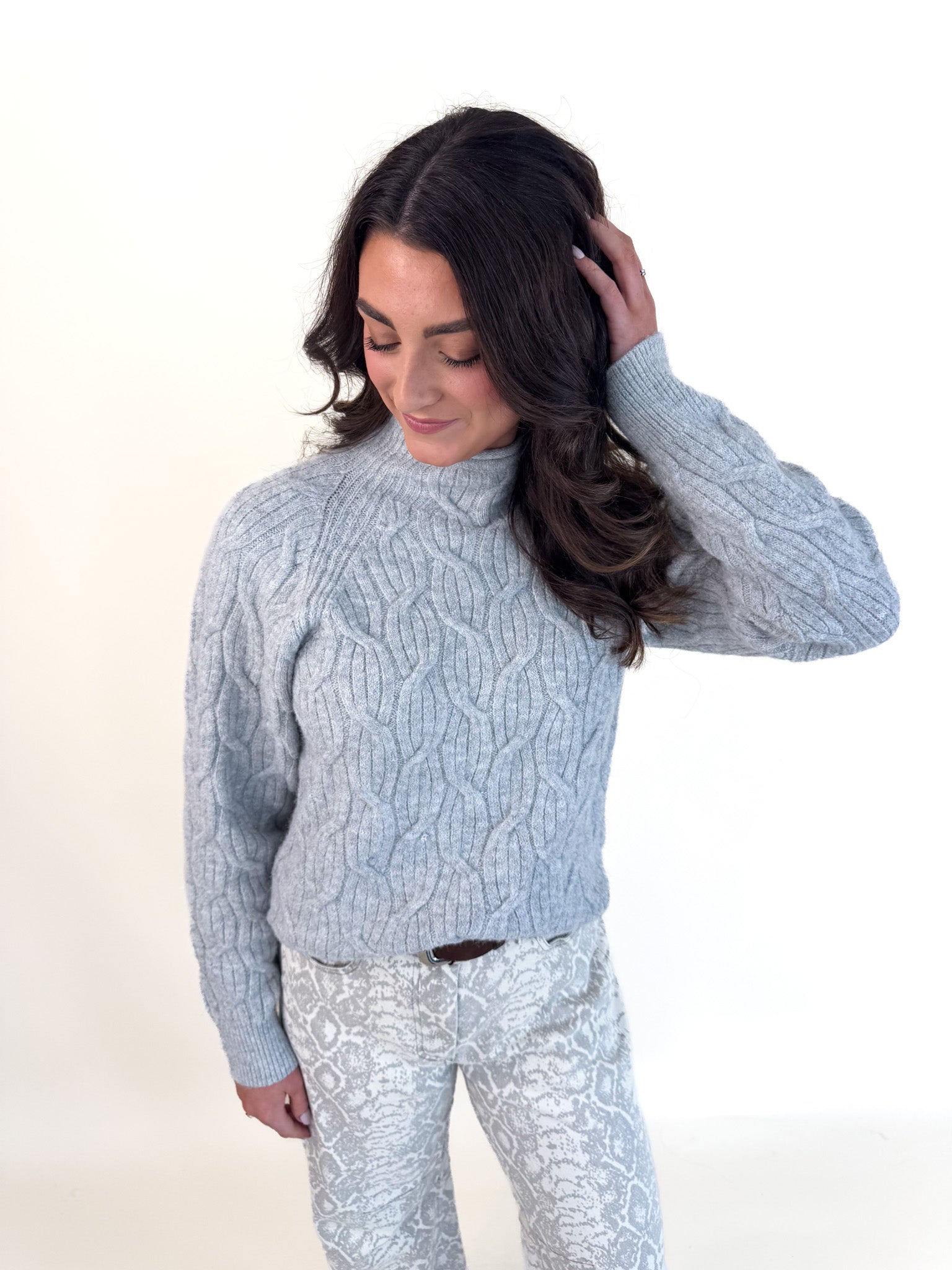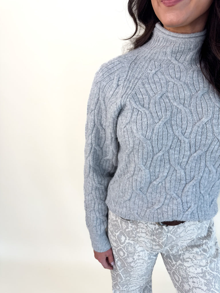 This cozy cable knit sweater features a mock neck and ribbed hem for a polished, timeless look. Ultra-soft construction makes it perfect for everyday wear.