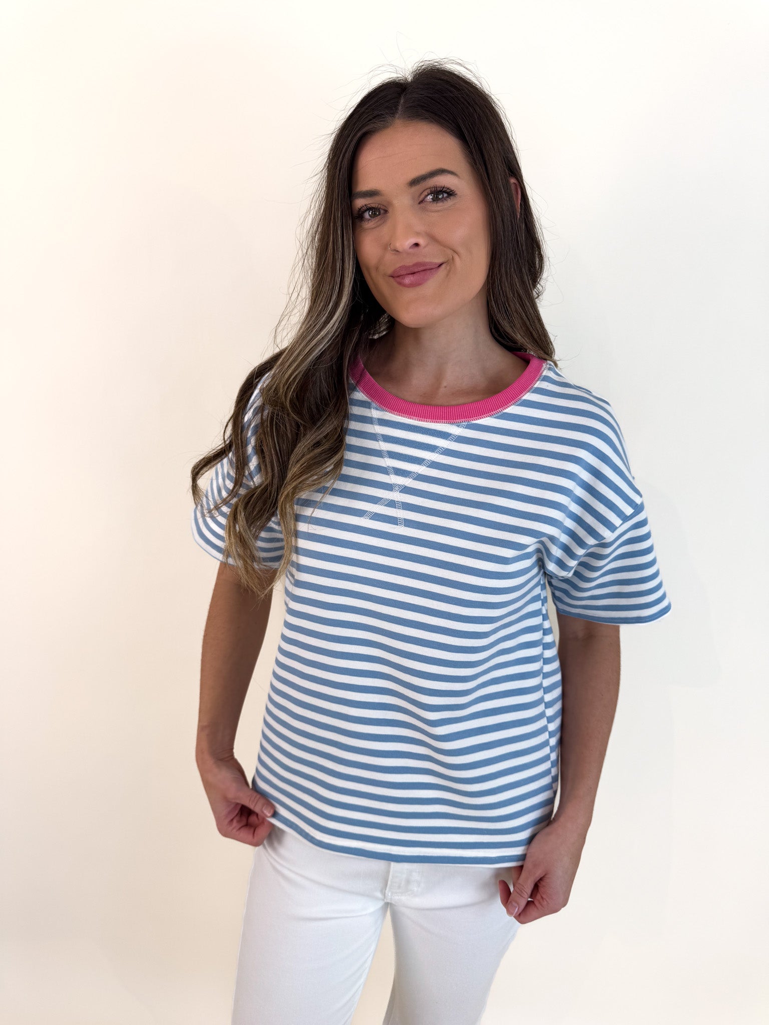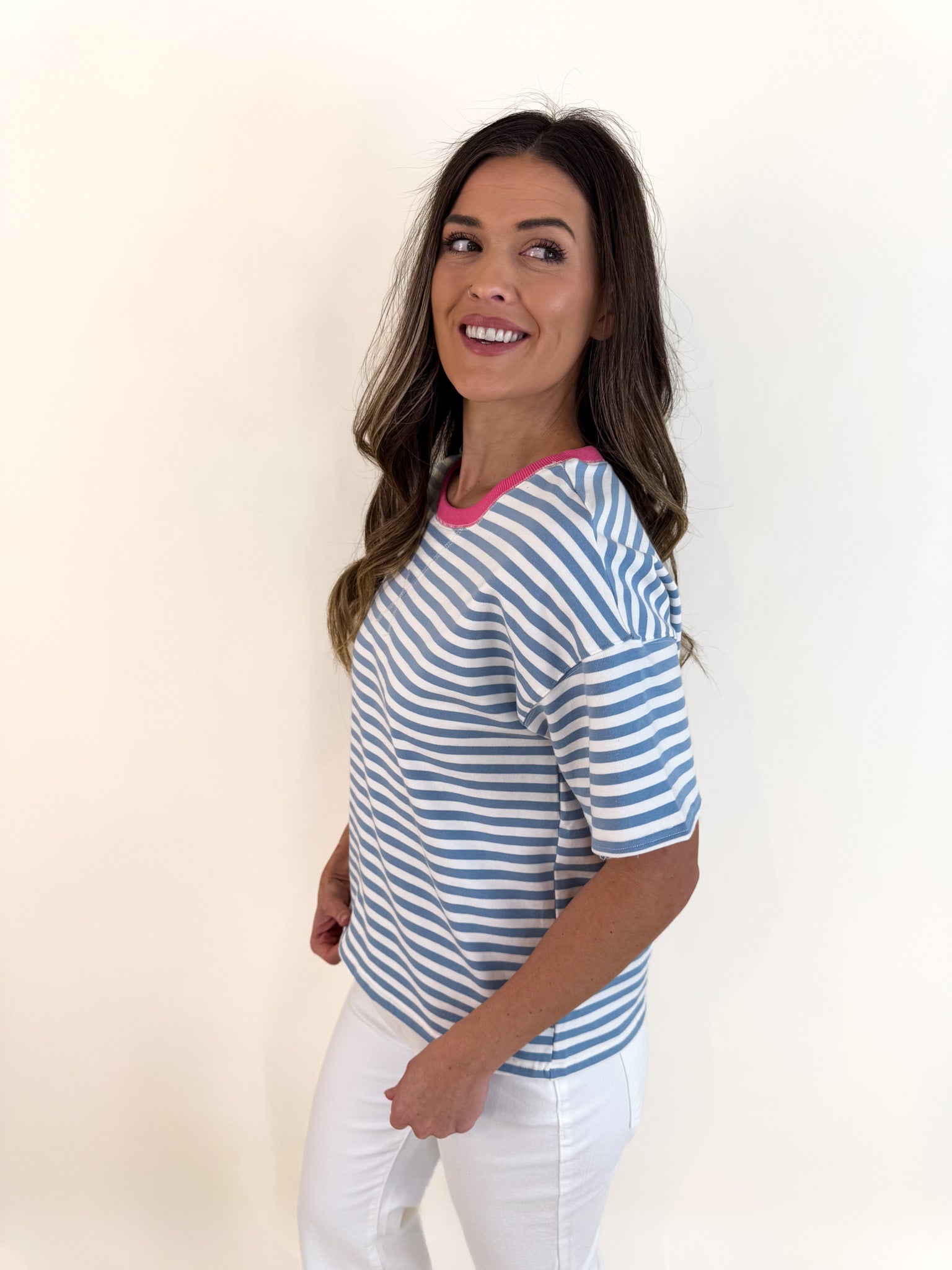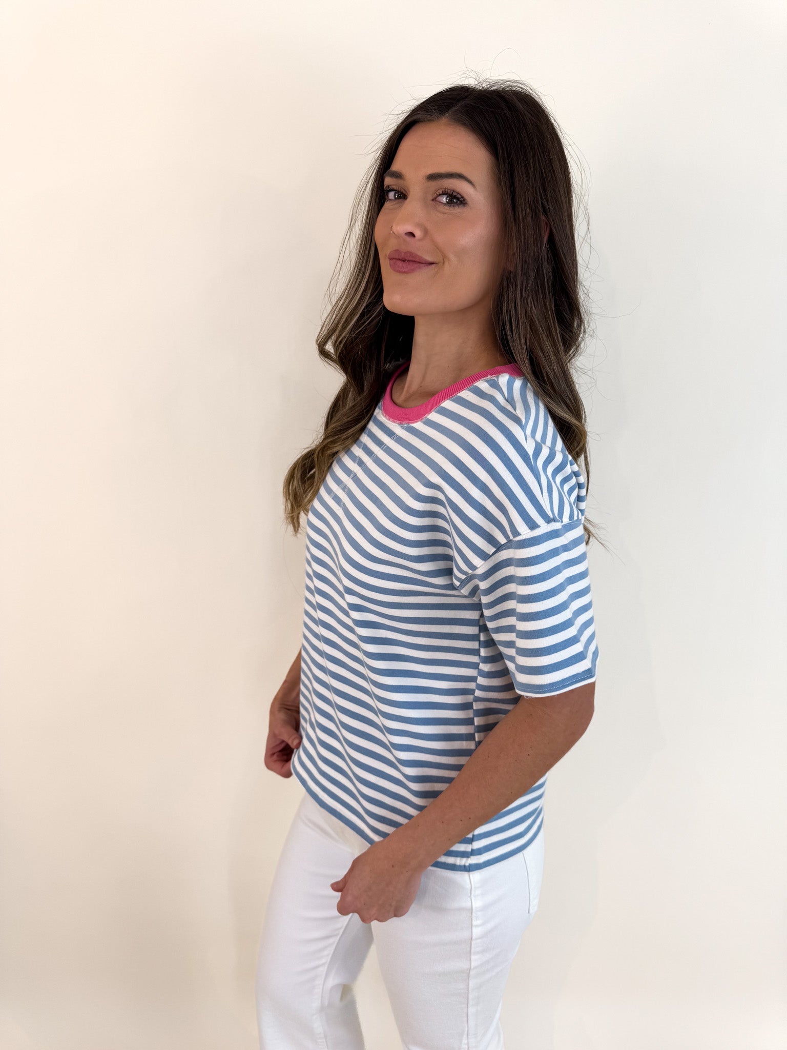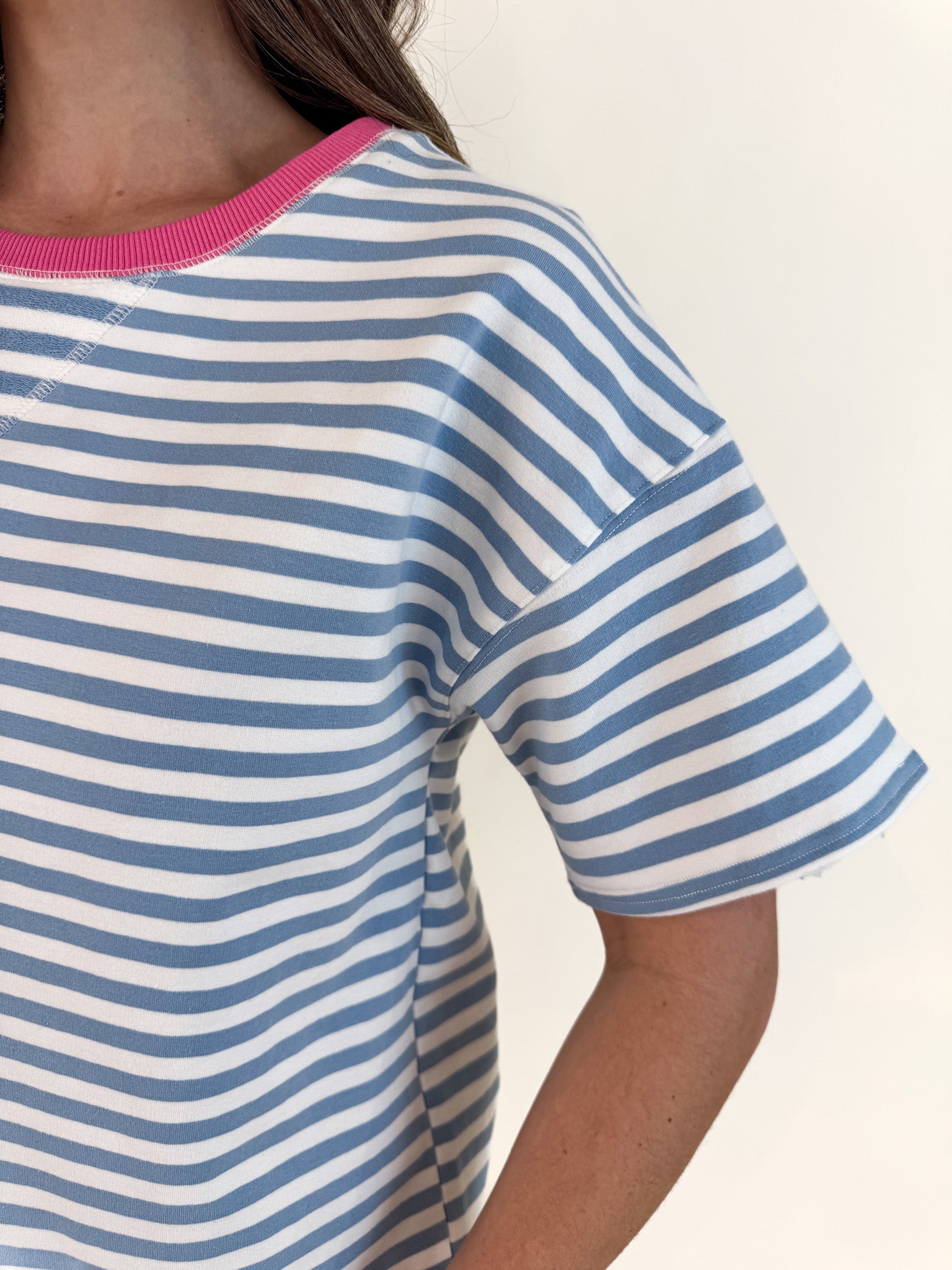 Crisp sky blue and ivory stripes keep things fresh and fun, while the unexpected pink contrast neckline adds a playful pop of personality.