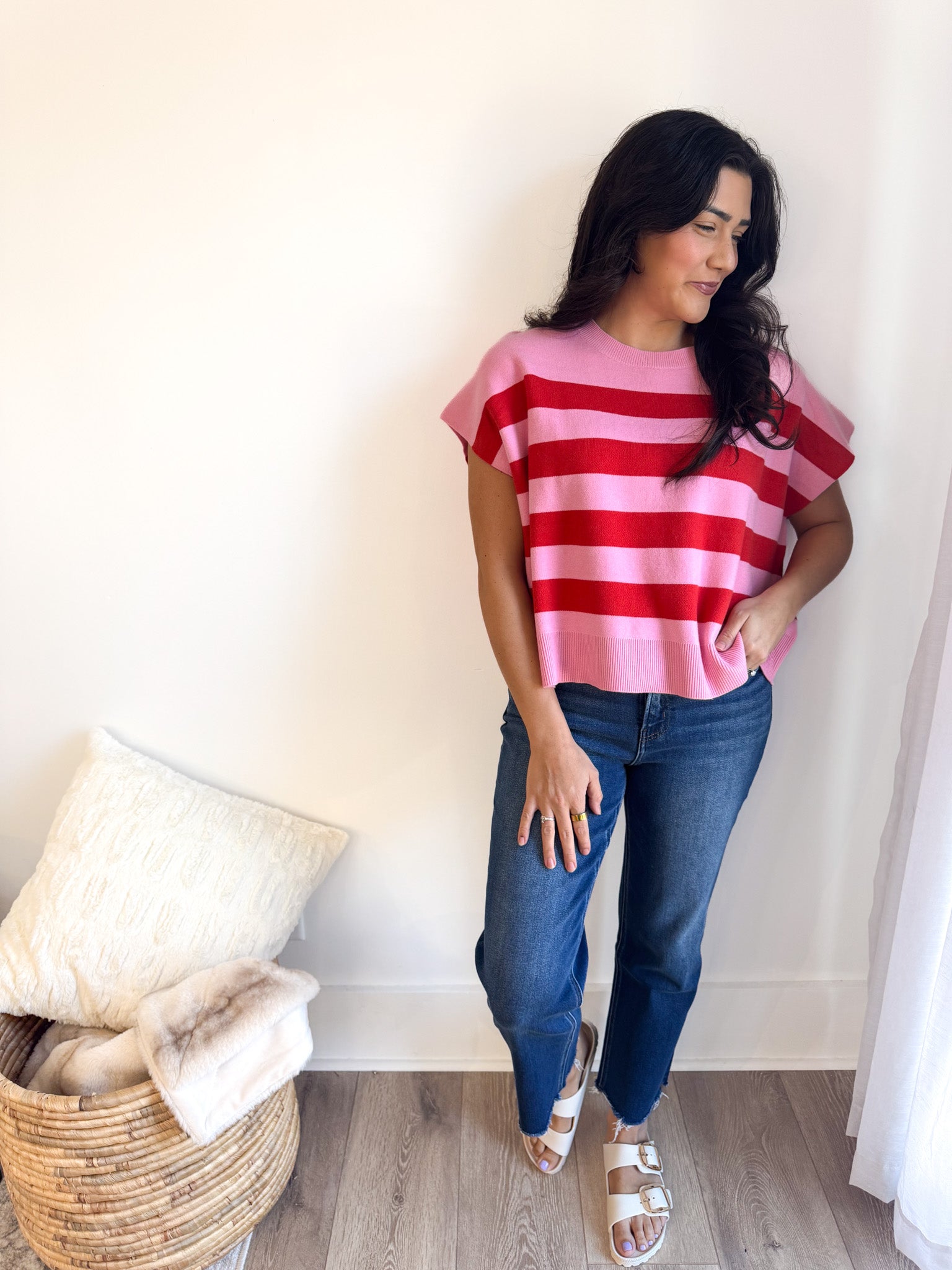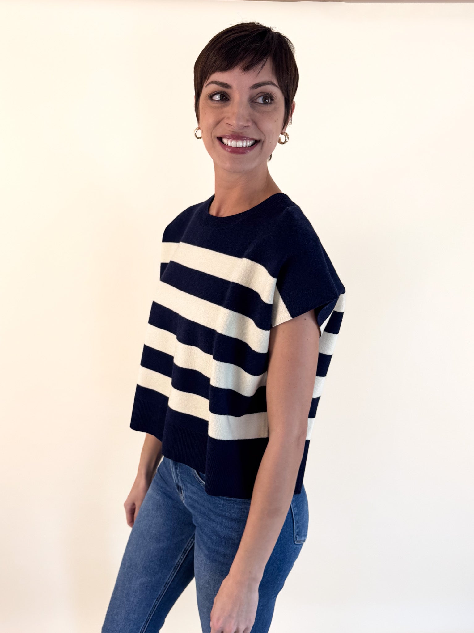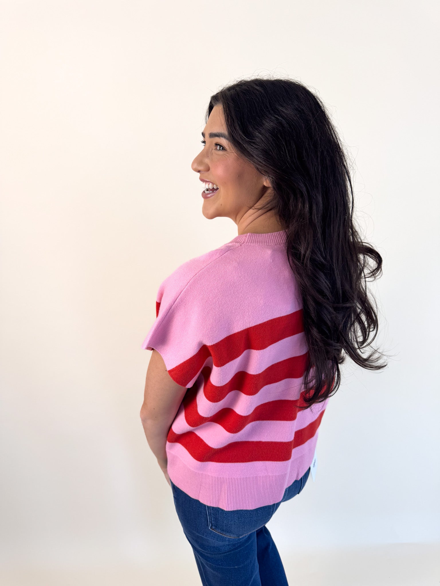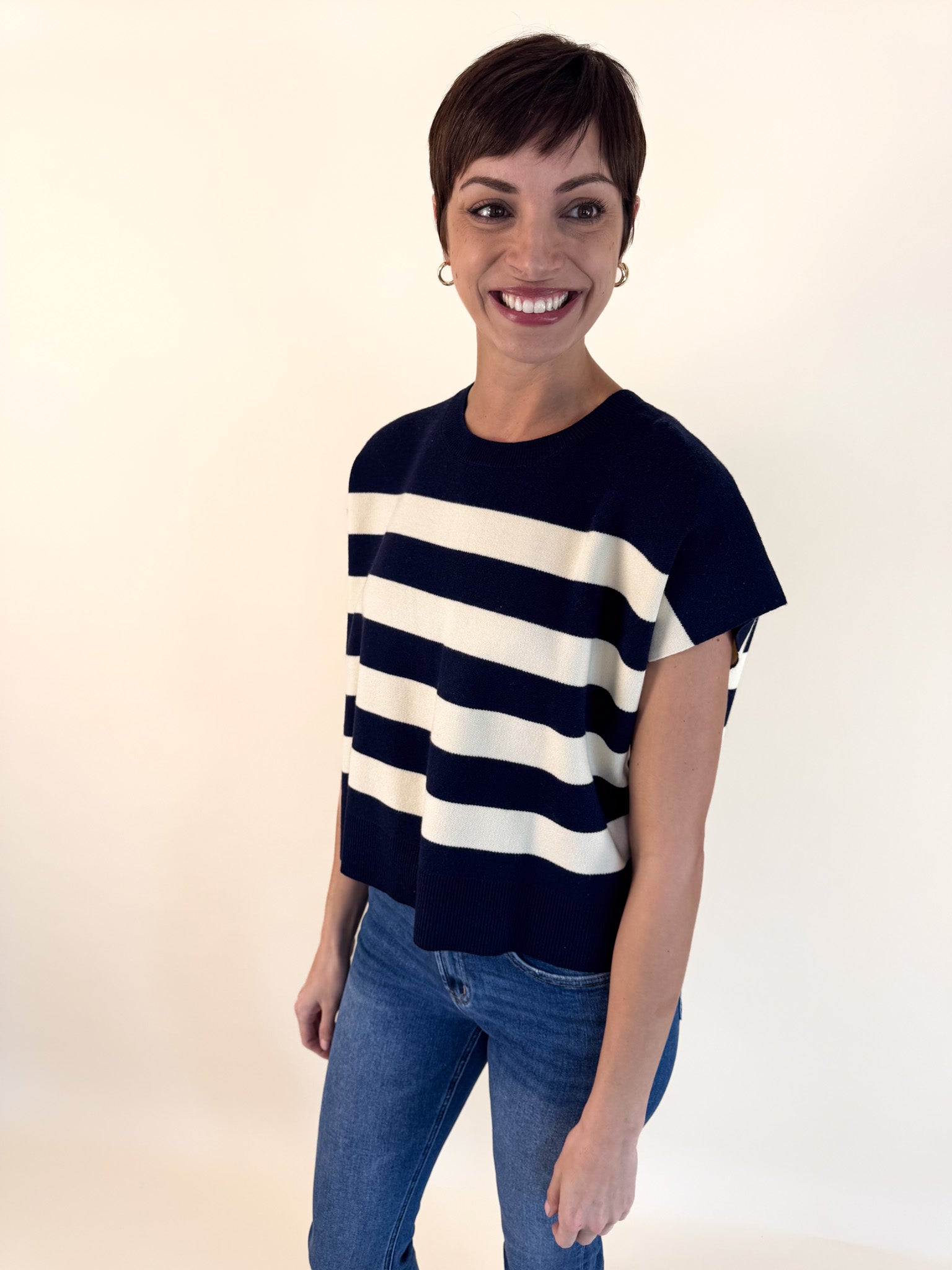 Soft and easygoing, this relaxed-fit sweater features charming capped sleeves and vibrant striped accents that add just the right pop of color.