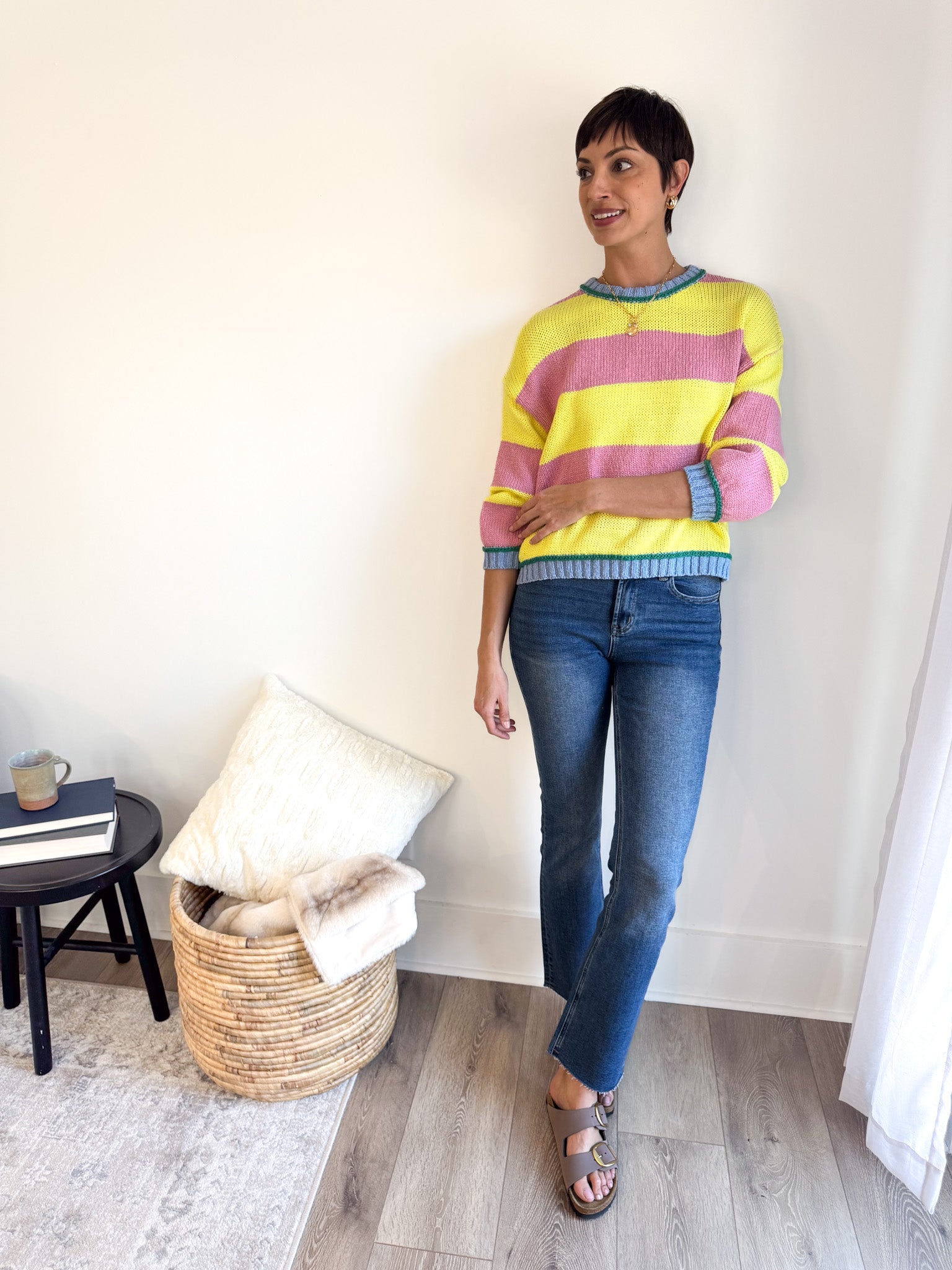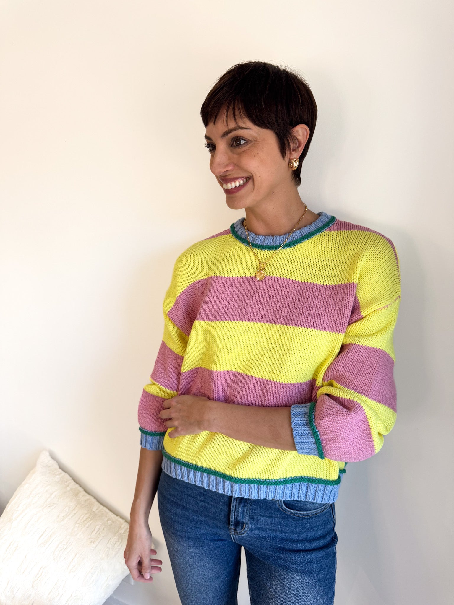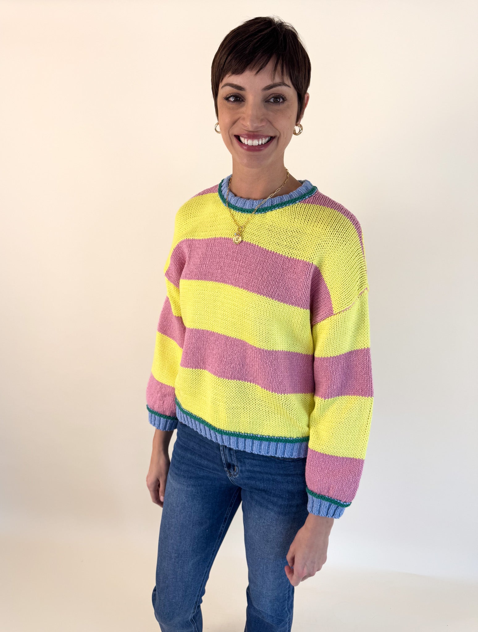 Forget matching—this season is all about color chaos, and the Lemonade Bold Striped Sweater is your ticket to the trend. Four vibrant hues collide in bold horizontal stripes, creating a statement piece that screams personality.