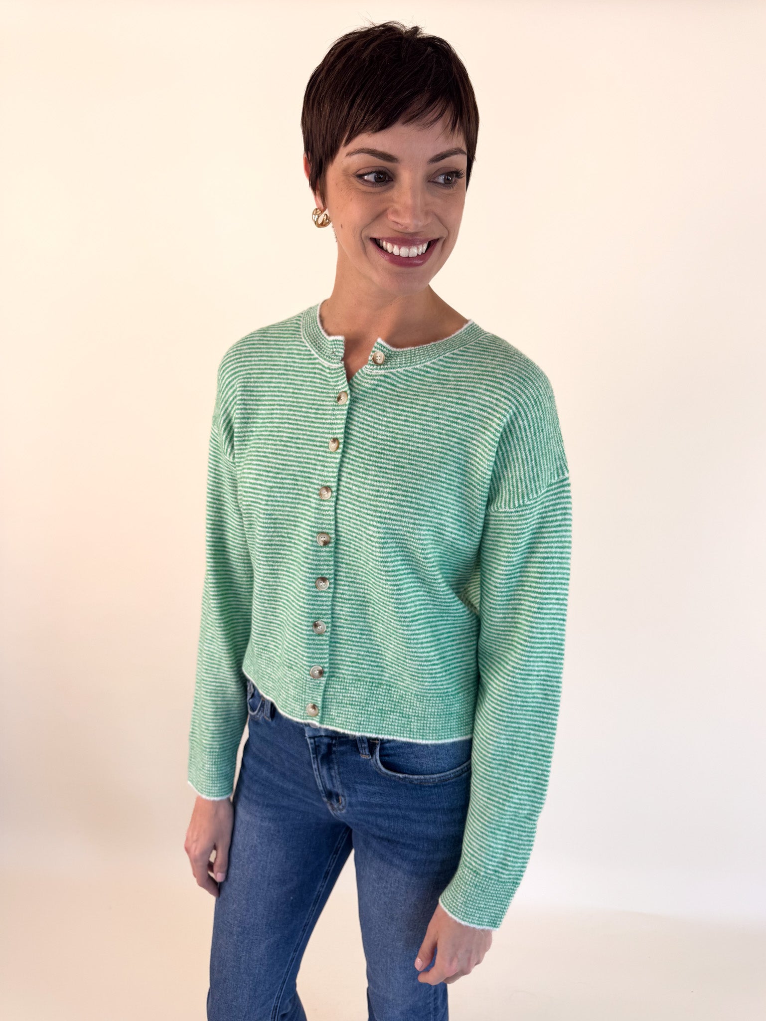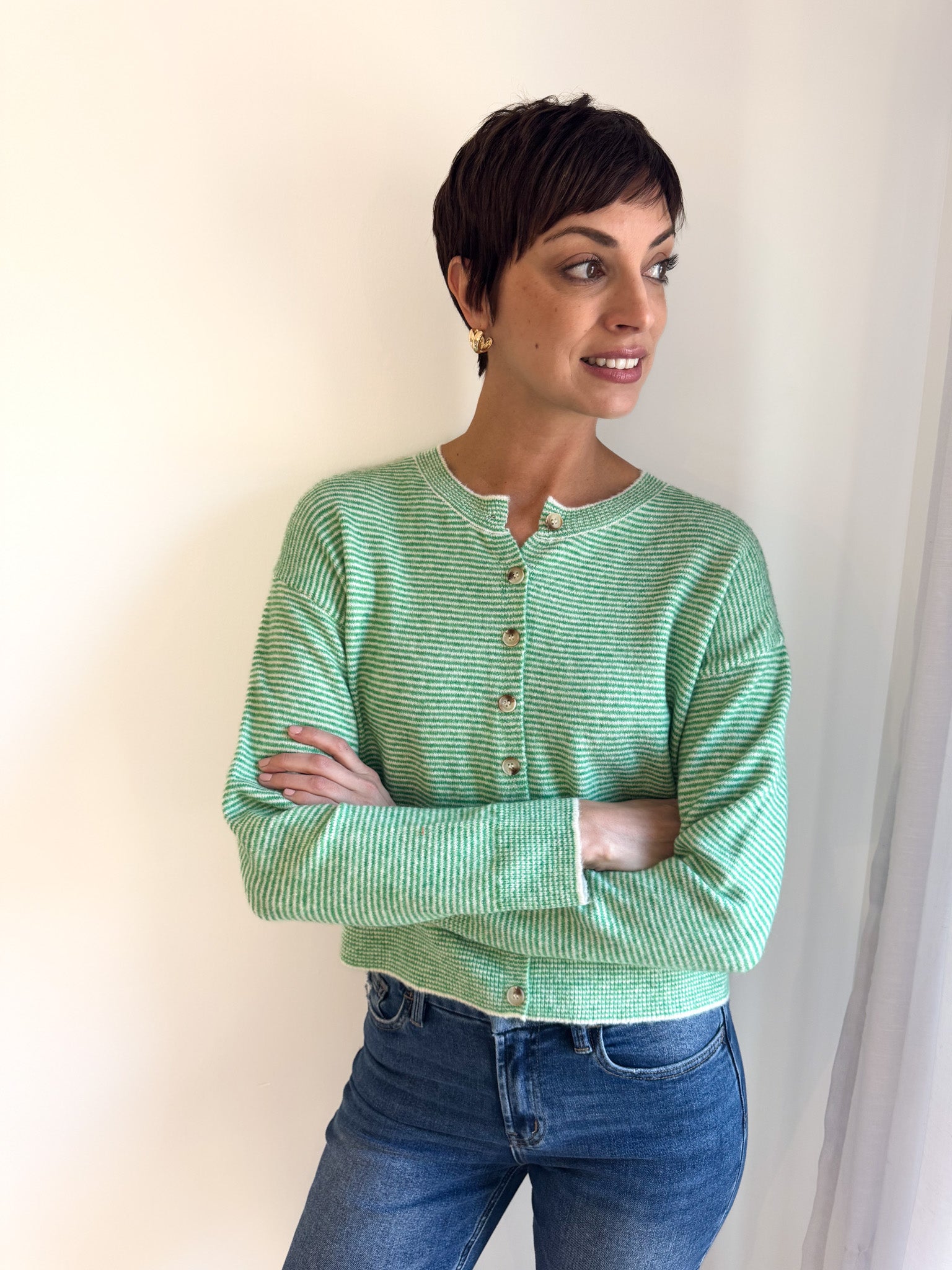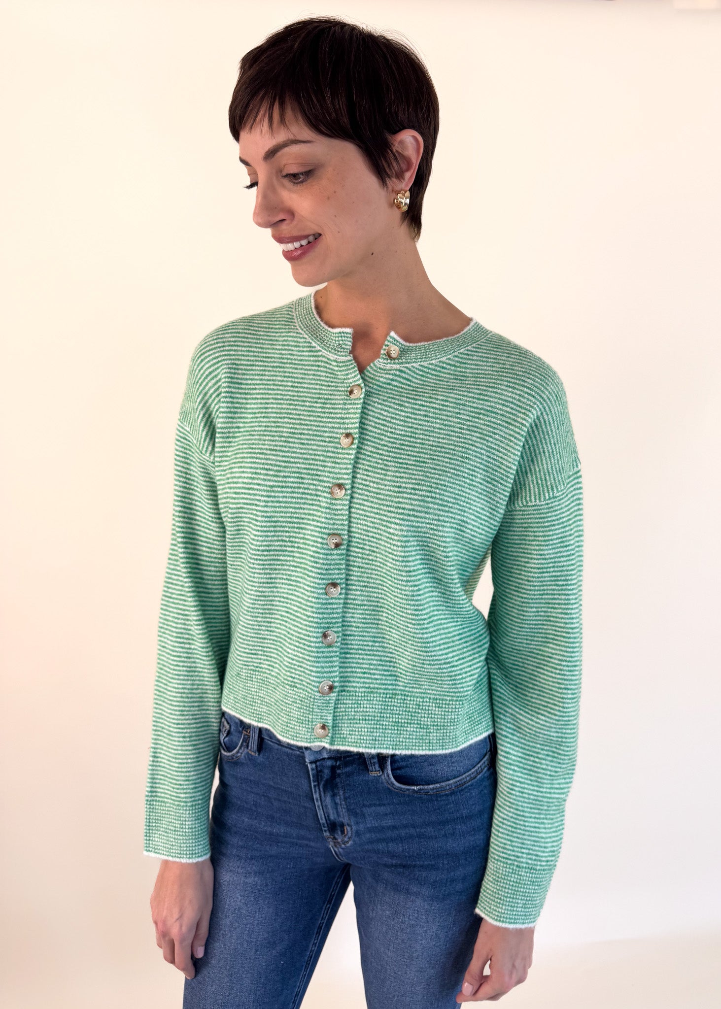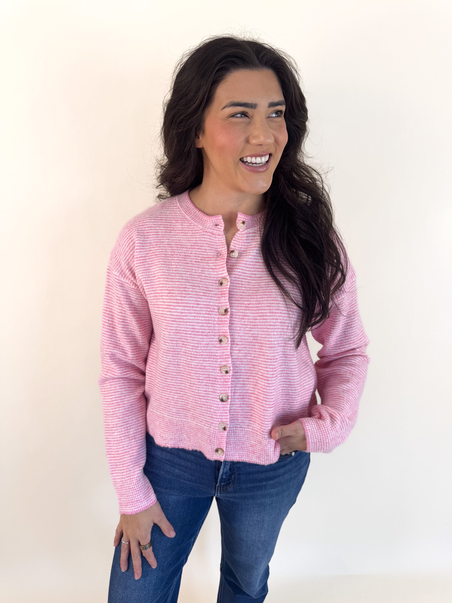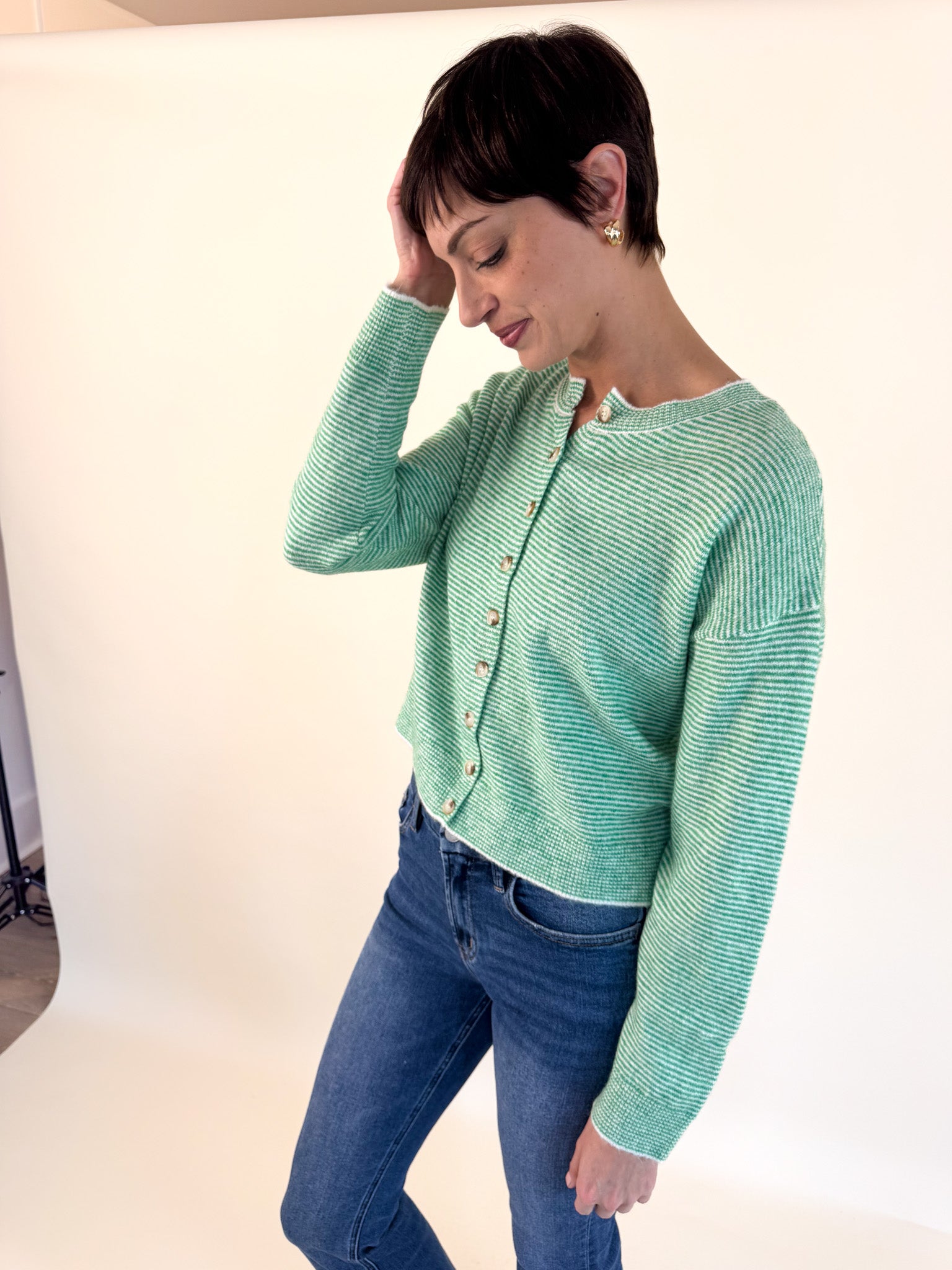 Cozy button-up sweater featuring classic stripes — perfect for layering or wearing on its own for casual-chic style.