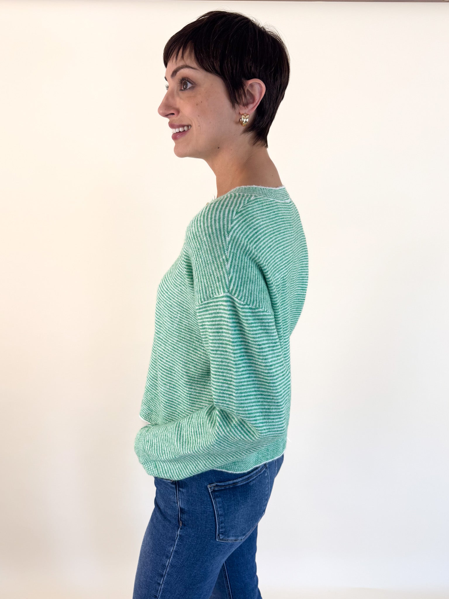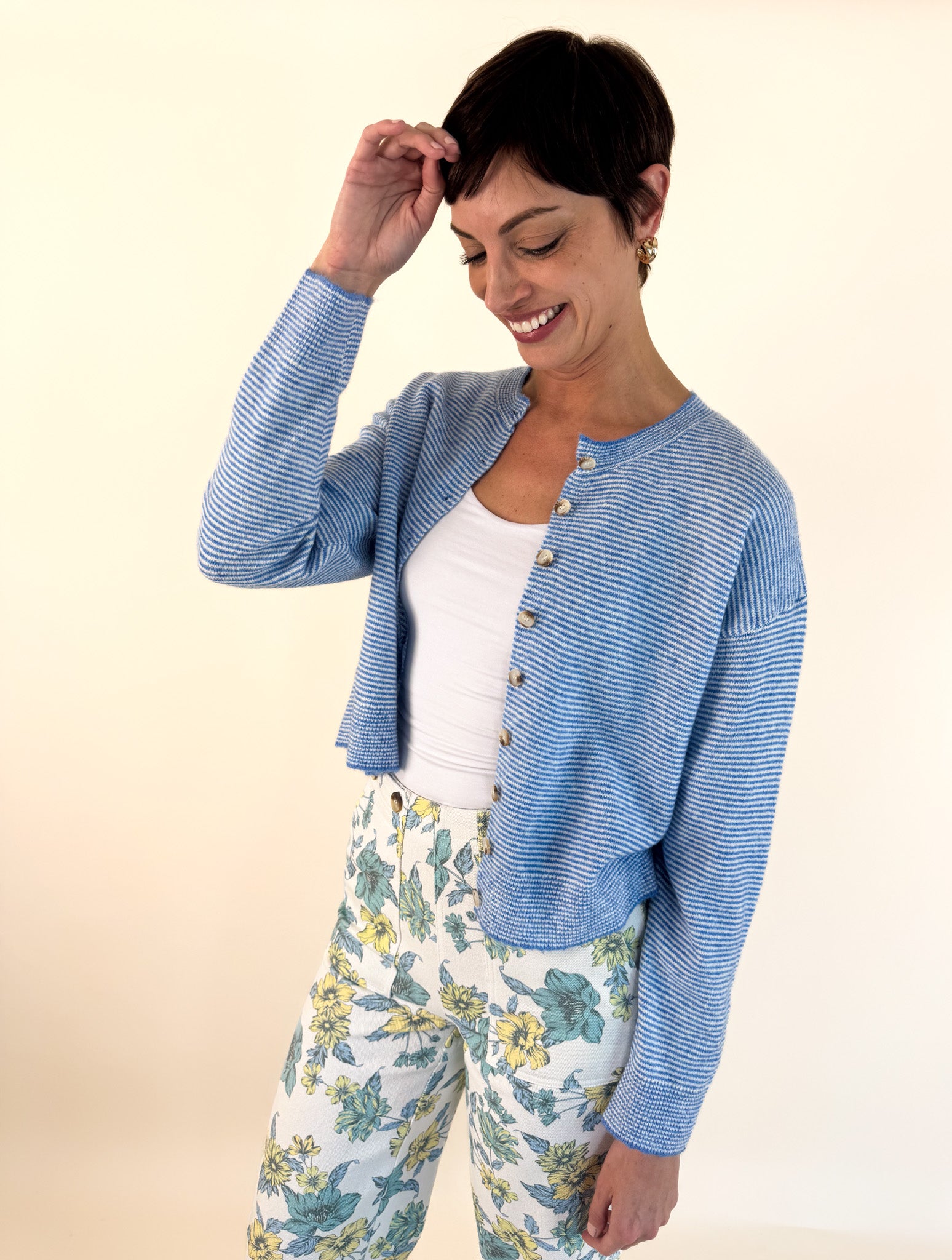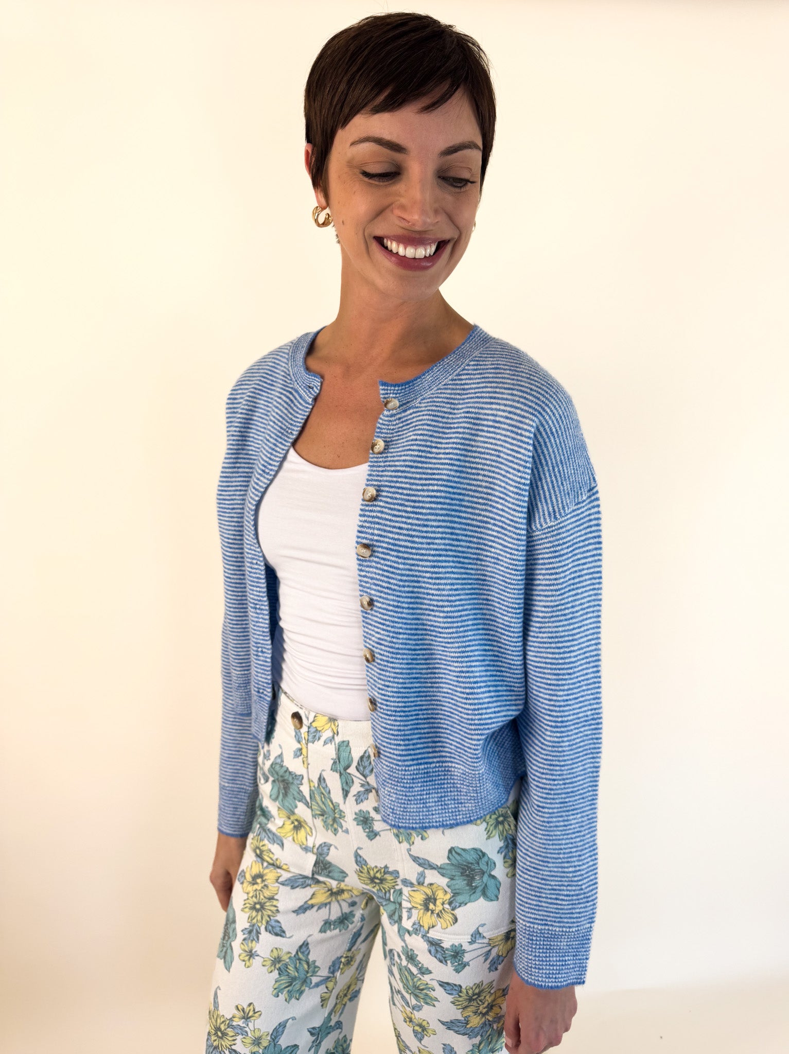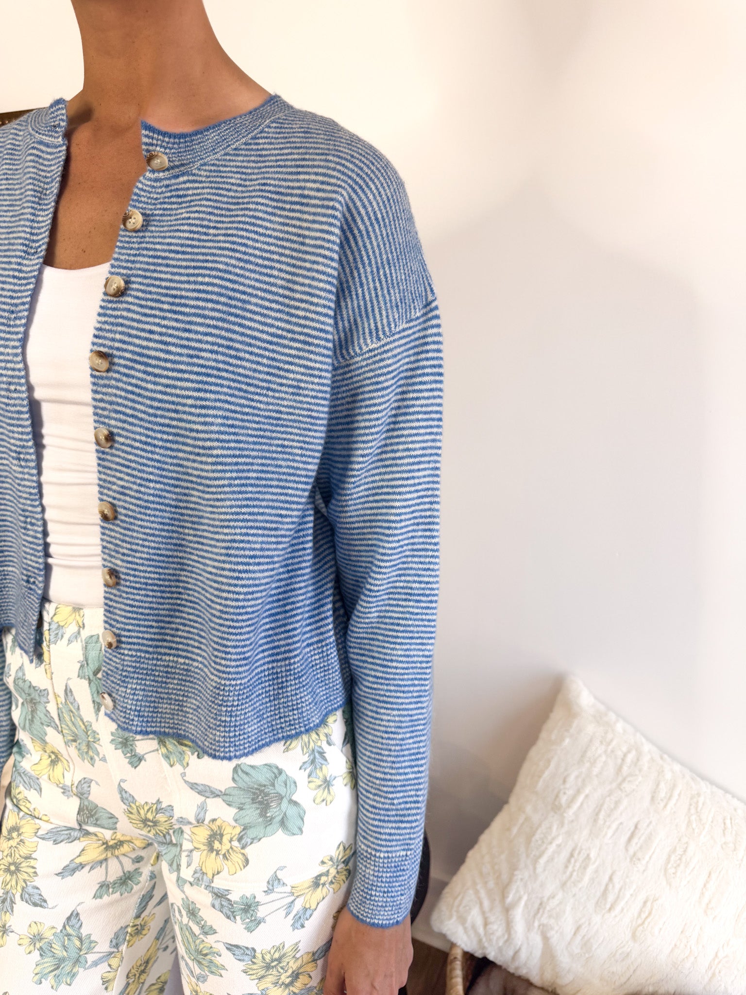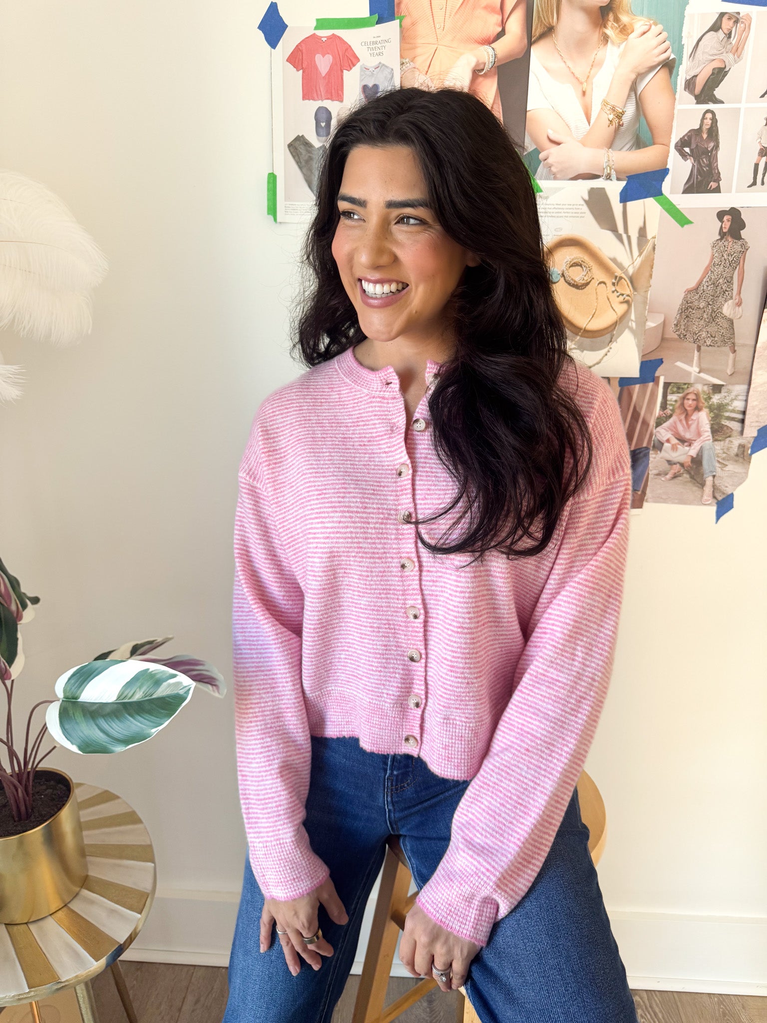Cozy button-up sweater featuring classic stripes — perfect for layering or wearing on its own for casual-chic style.