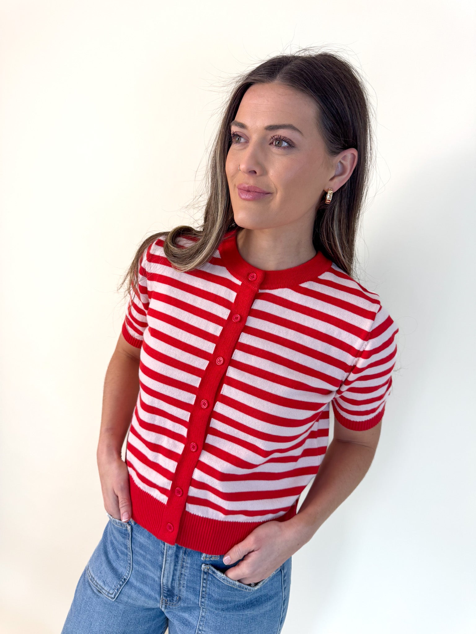 A sweet, cheerful knit that instantly brightens any spring–summer look. This striped short-sleeve cardigan blends a playful color palette with a soft, lightweight sweater knit. Perfect for warm days when you still want something cozy and polished. The silhouette is charmingly relaxed with a round neckline, delicate button-down front, and ribbed hems that create a naturally flattering fit. It pairs beautifully with flowy skirts for a soft, feminine look or with crisp shorts for an effortless, sun-kissed weekend style. Easy to layer, easy to love. Whether styled as a top or worn open over tanks and dresses, it’s the versatile knit that completes every outfit.