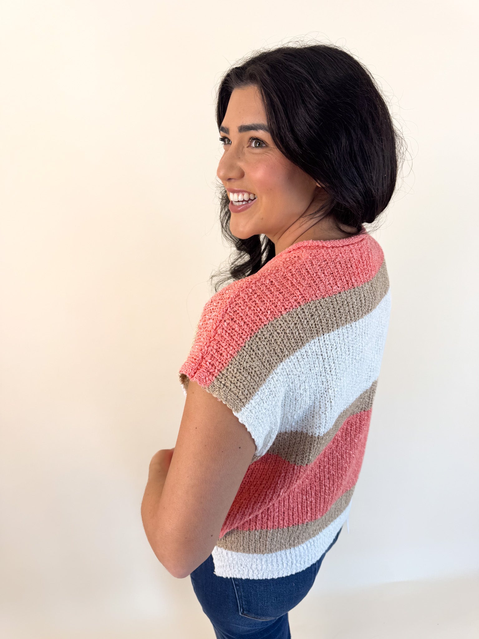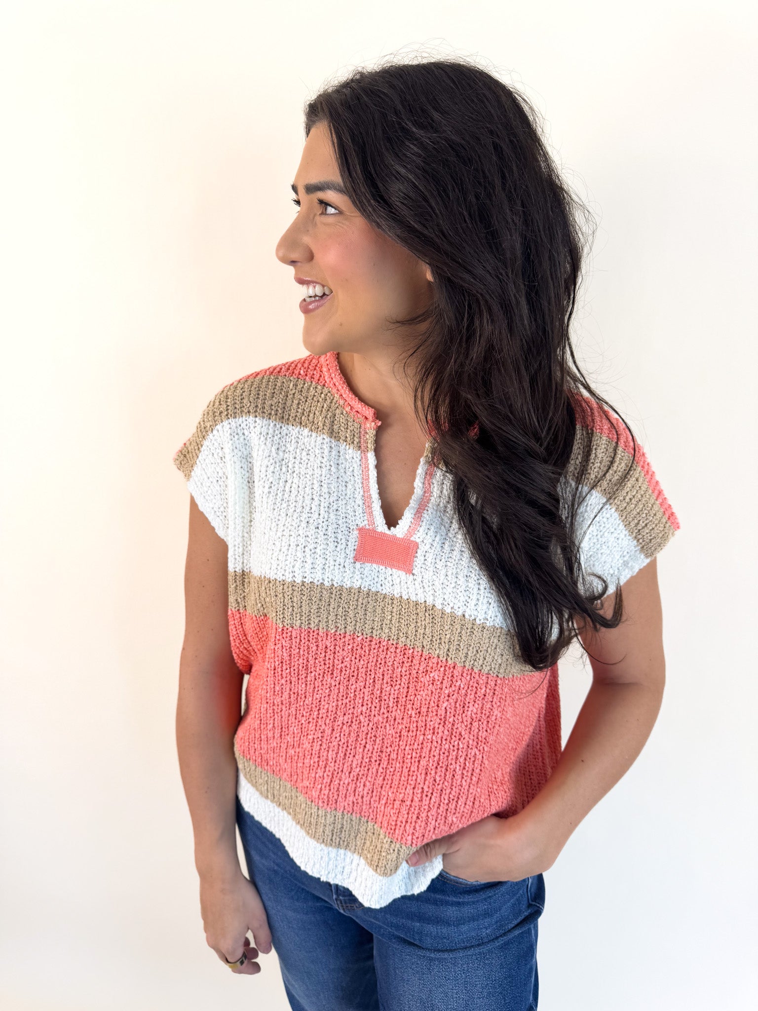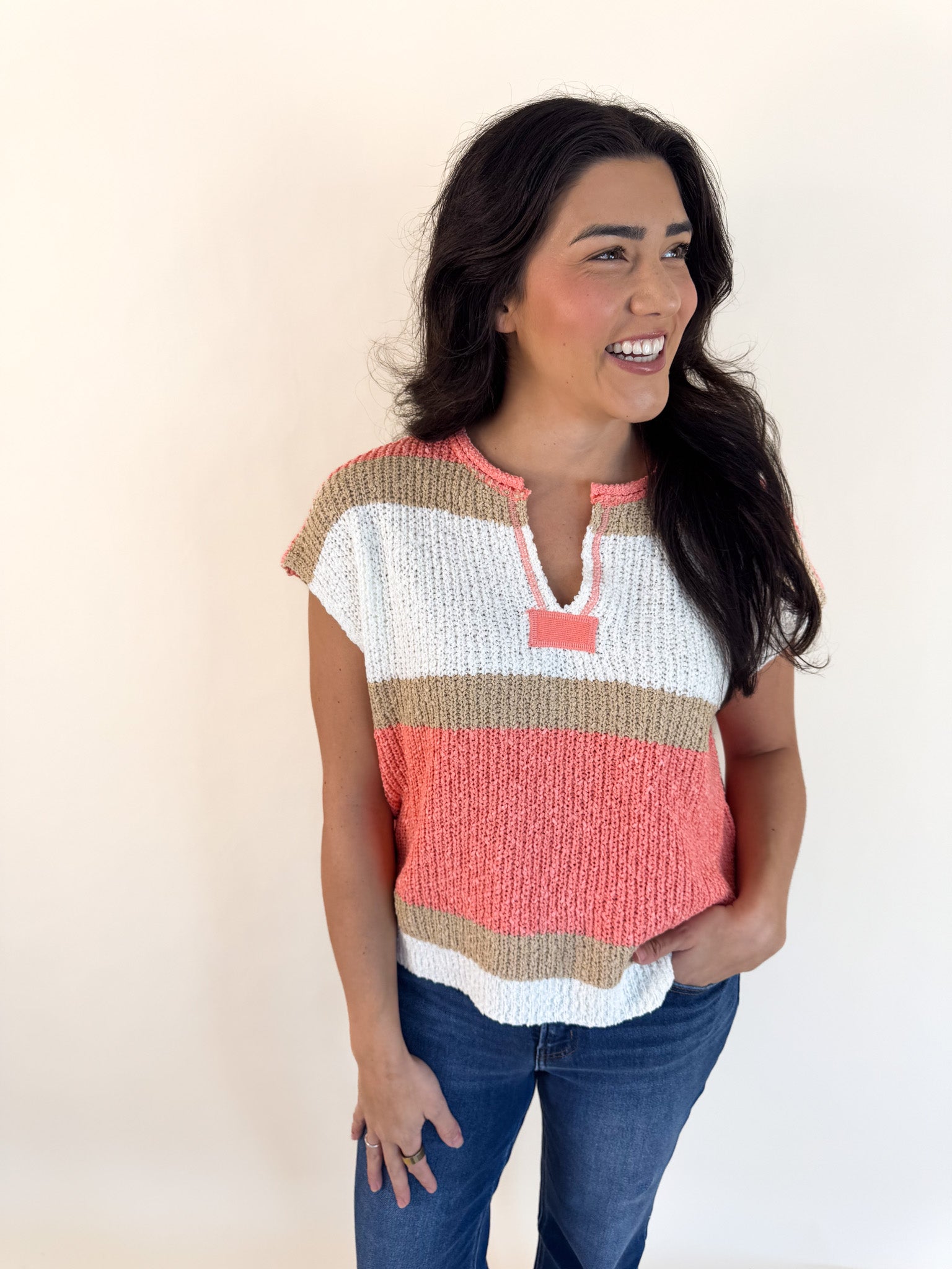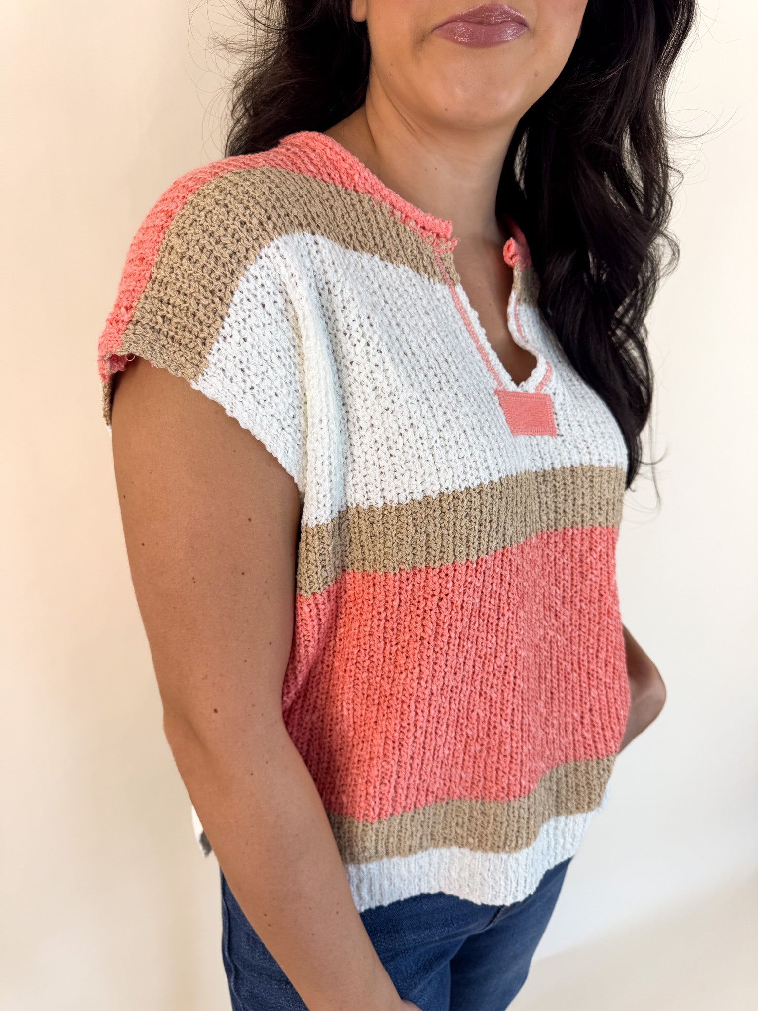 This lightweight knit top is designed with bold color block stripes that bring a fresh, cheerful vibe to any look. It features a relaxed fit with a flattering split neckline and short sleeves for easy, all-day comfort. Perfect for layering or wearing solo, it's an effortless choice for warm-weather days or casual outings.