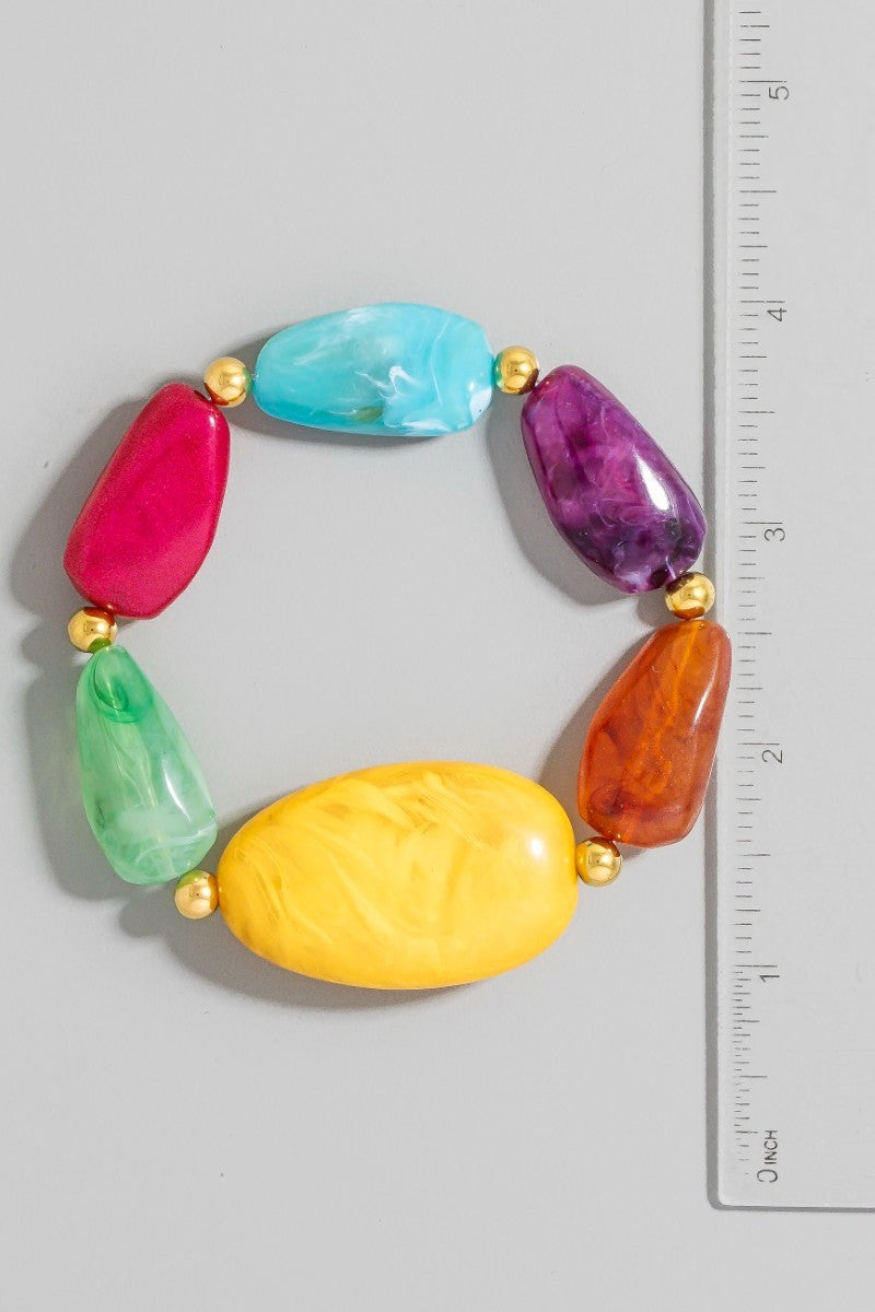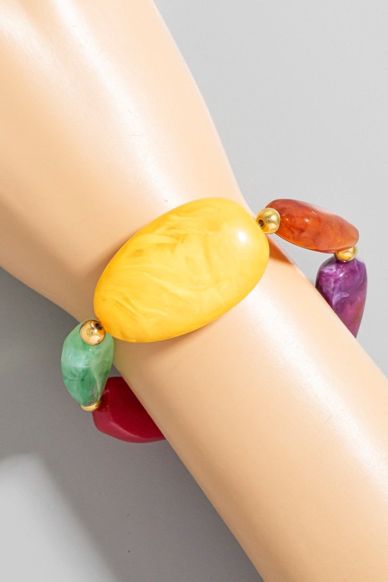 This bracelet showcases a timeless large marble resin beads style. Indulge in the artistry of accessorizing with this unique piece. MADE IN CHINA 90% PLASTIC 10% ALLOY