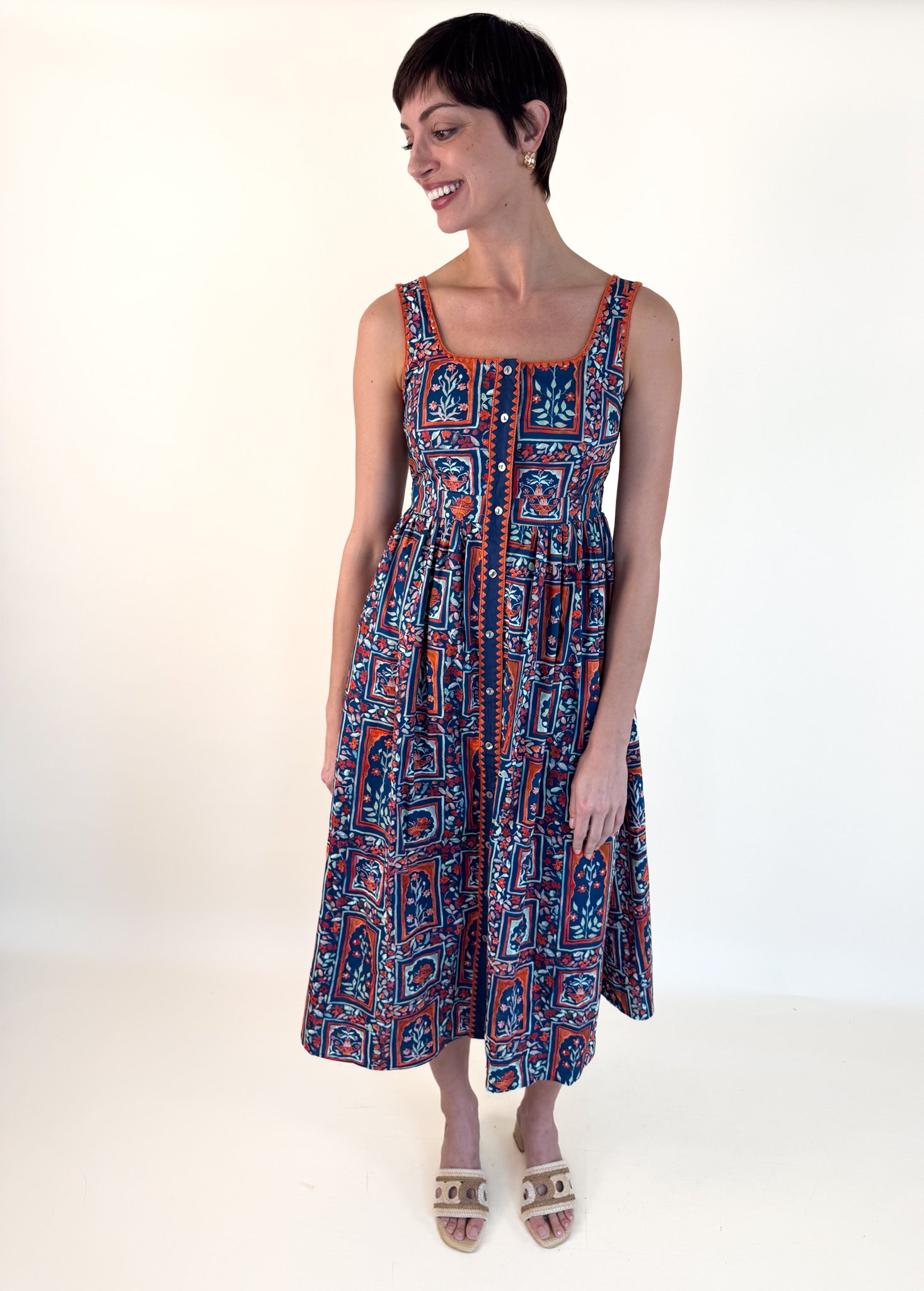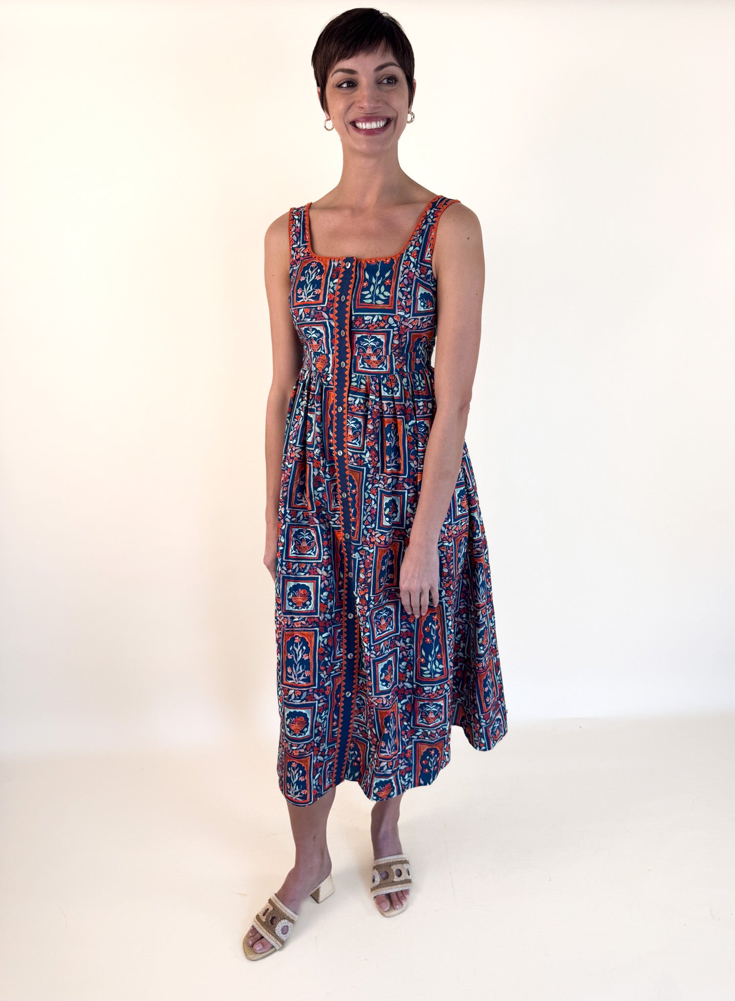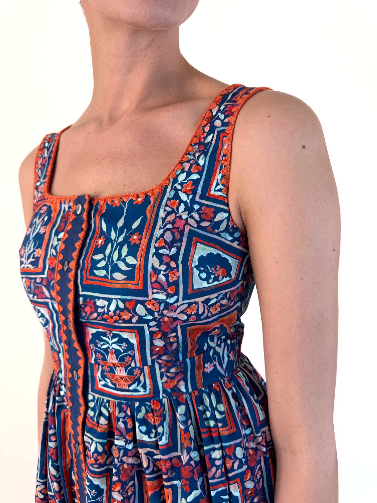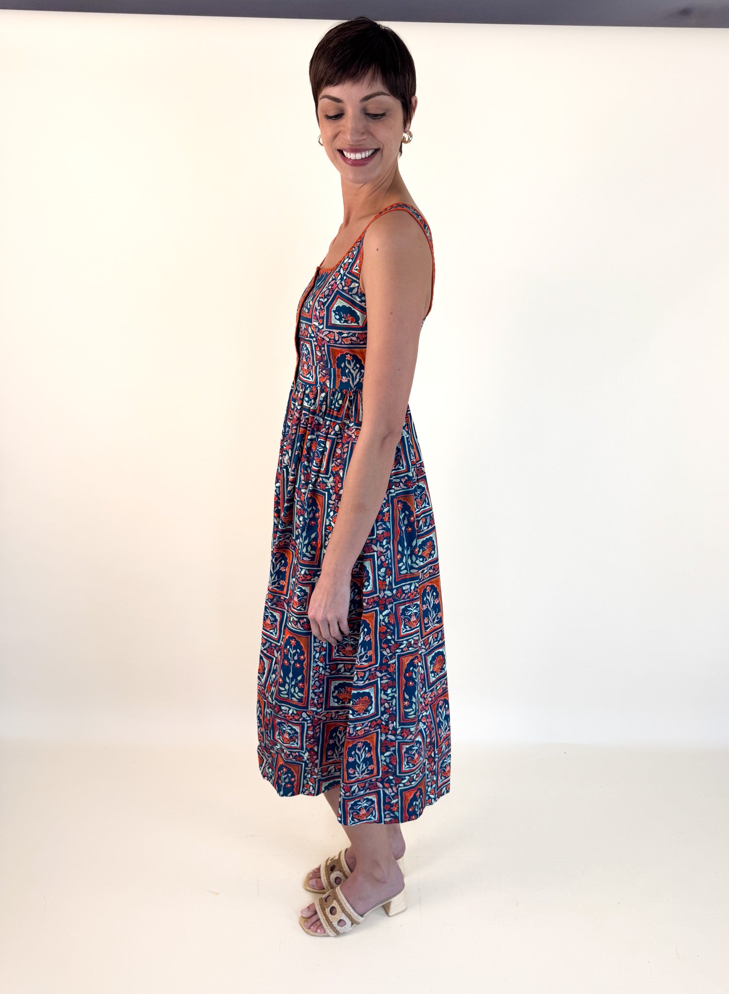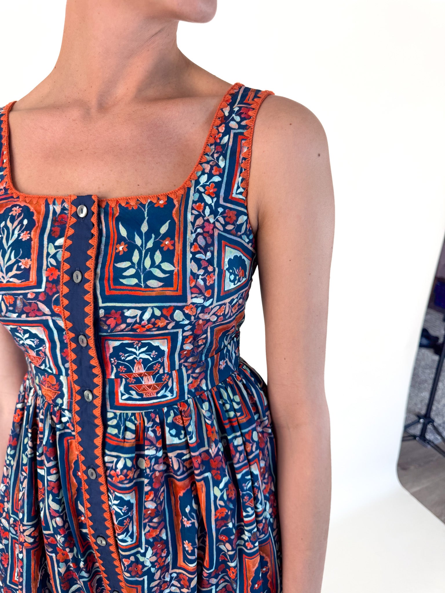 Escape to the islands with this breezy midi dress, featuring a captivating blue and orange Santorini print that transports you straight to sun-soaked shores.