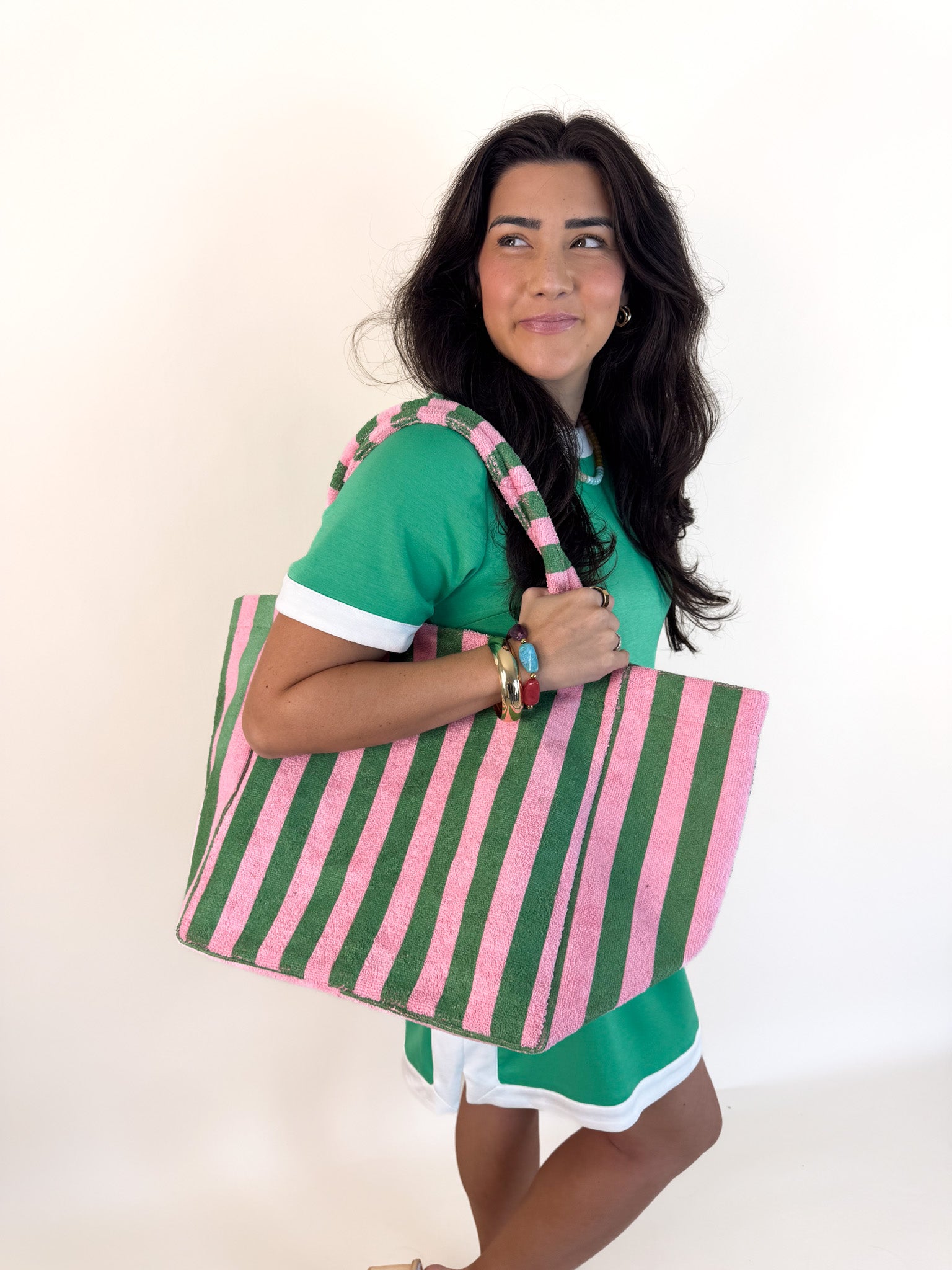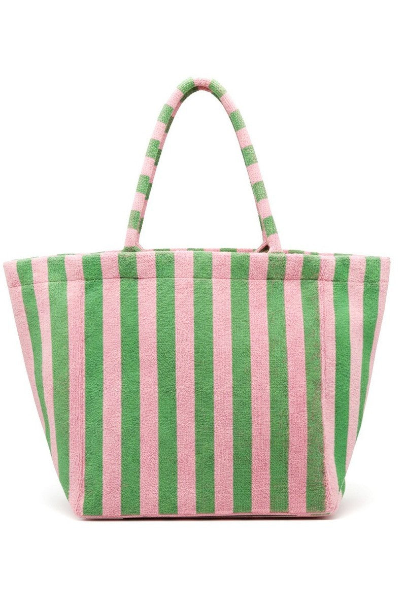 This tote bag showcases a unique striped terry style. Experience a burst of creativity in accessorizing as this piece effortlessly sets the tone for your unique style. THIS TOTE BAG APPROXIMATELY MEASURES: LENGTH: 22.5 INCHES DEPTH: 9.5 INCHES HEIGHT: 13.5 INCHES $0.25 FREIGHT DIMENSIONAL WEIGHT SURCHARGE INCLUDED 80% POLYESTER 20% POLYAMIDE