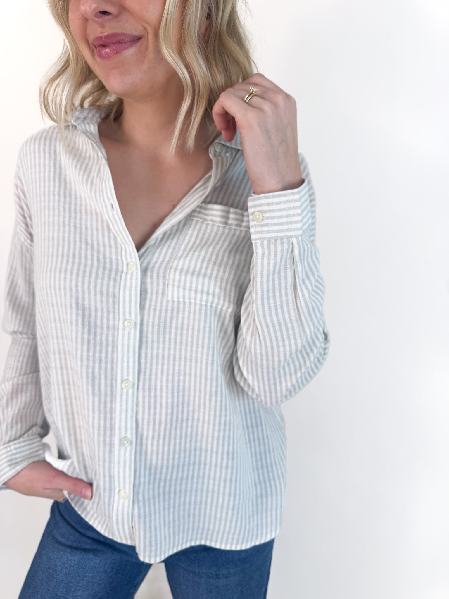 The soft, breathable fabric drapes beautifully over your frame, making it the perfect companion to your favorite denim. Whether you're running errands or meeting friends for coffee, this blouse strikes that sweet spot between polished and relaxed.
