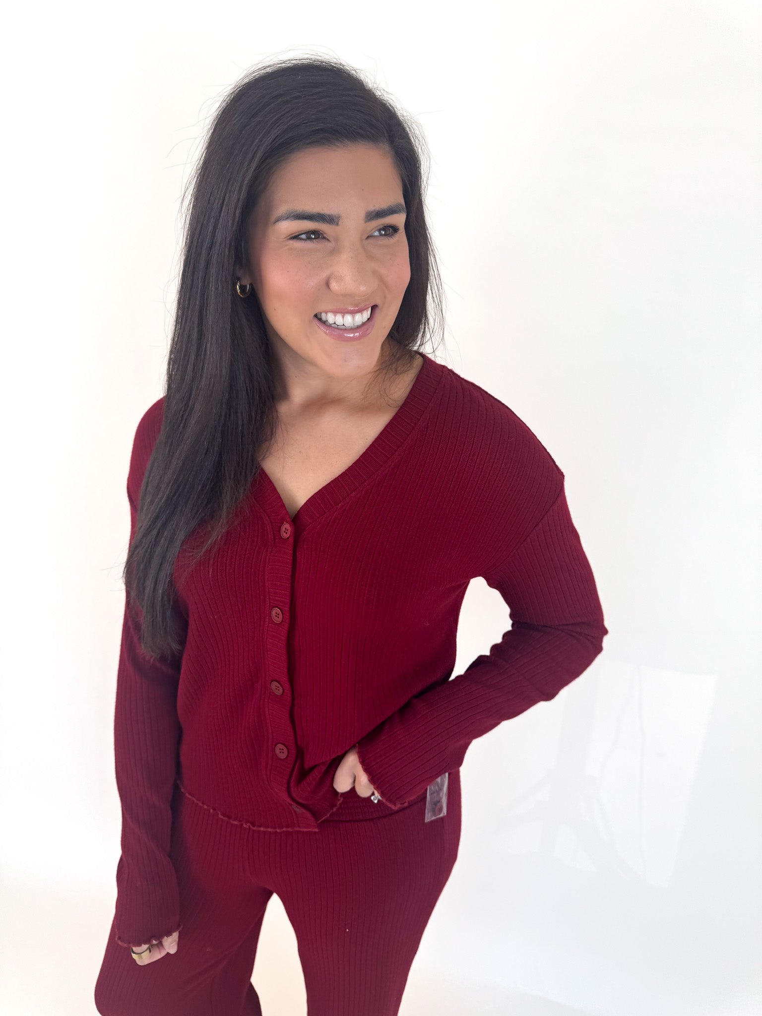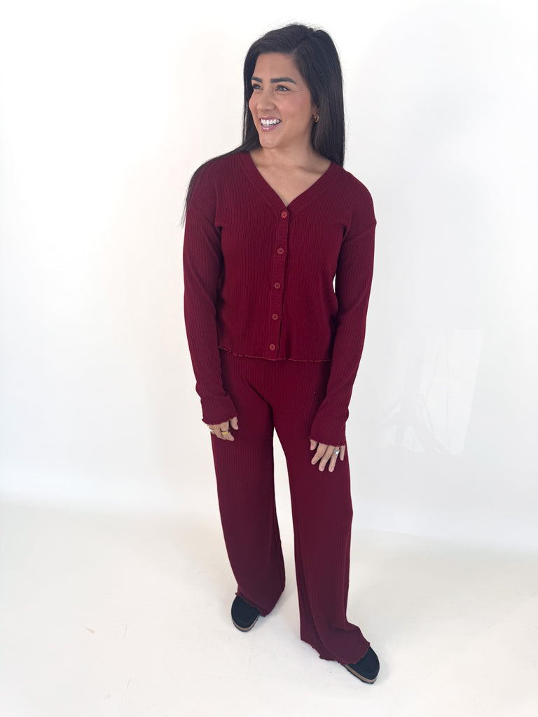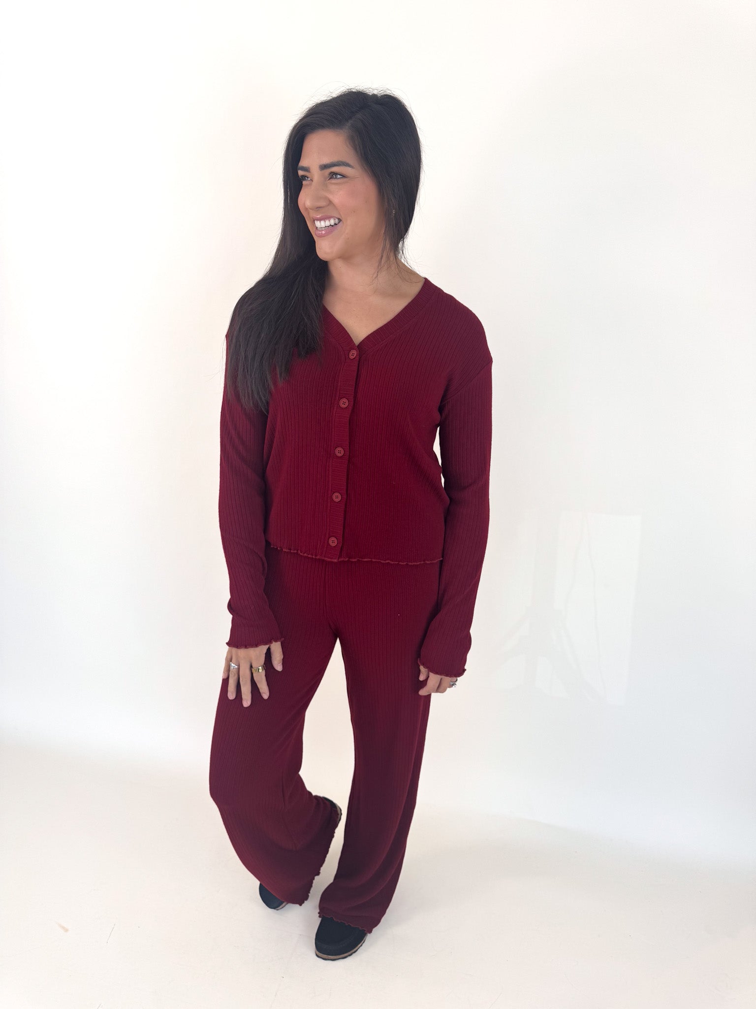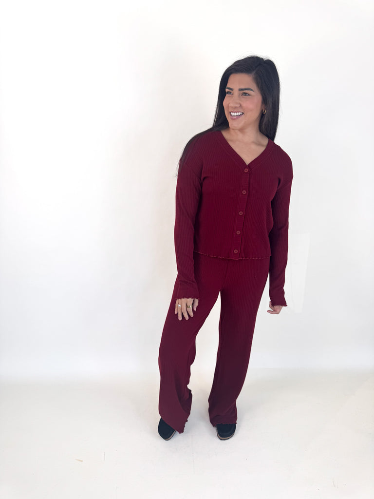 Lounge the day away in this comfy set, featuring a fitted V-neck long sleeve with relaxed, ribbed striped pants with elastic waist, made for taking it easy. Part of our exclusive holiday pajama collection!