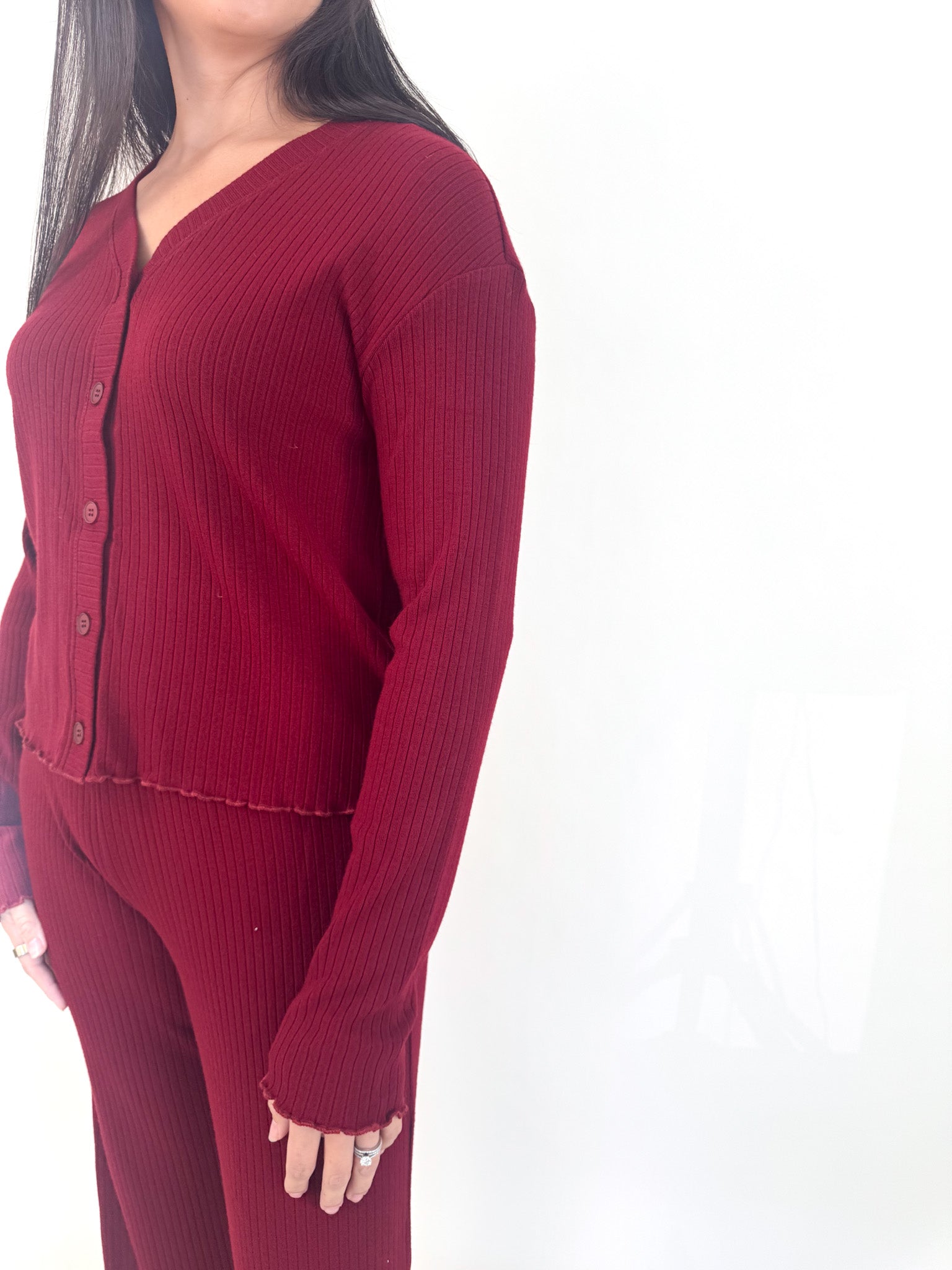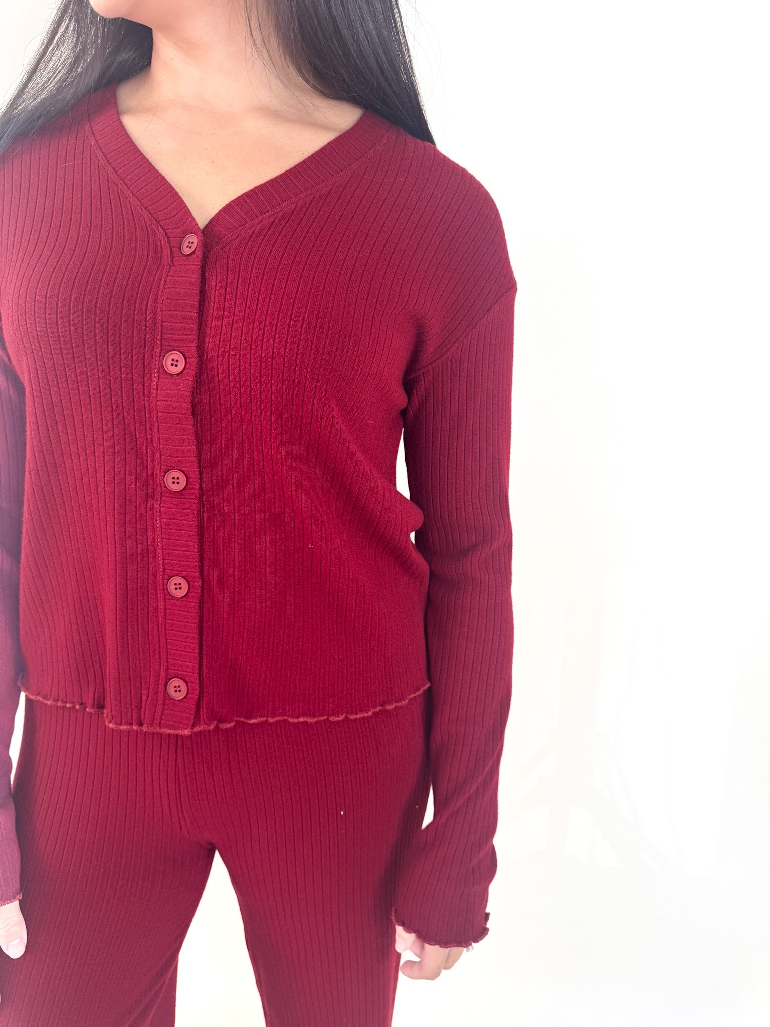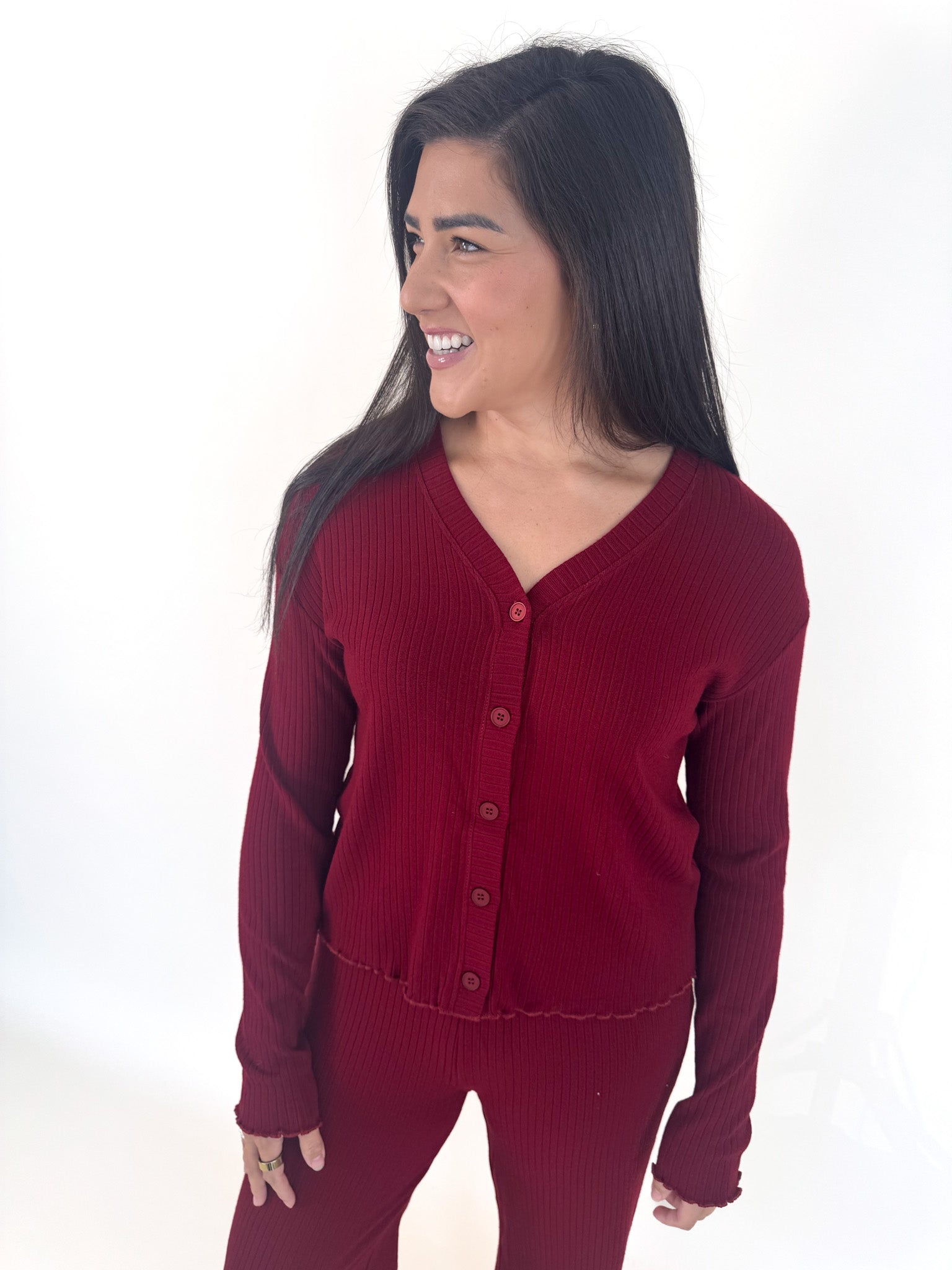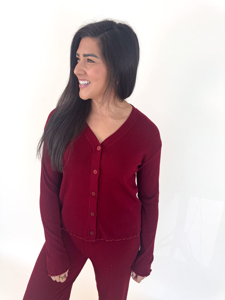 Lounge the day away in this comfy set, featuring a fitted V-neck long sleeve with relaxed, ribbed striped pants with elastic waist, made for taking it easy. Part of our exclusive holiday pajama collection!
