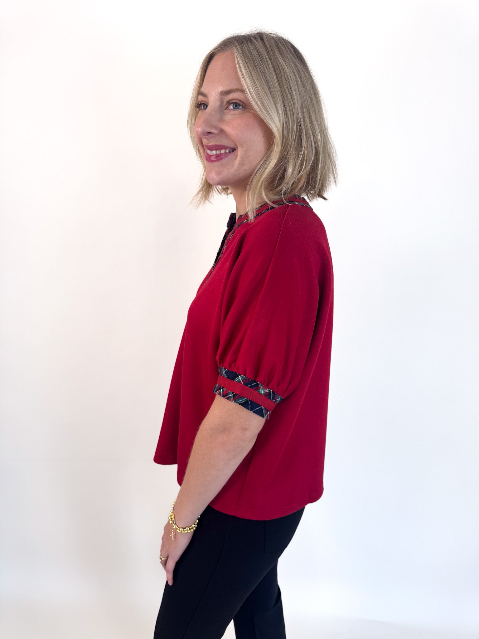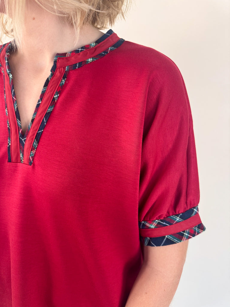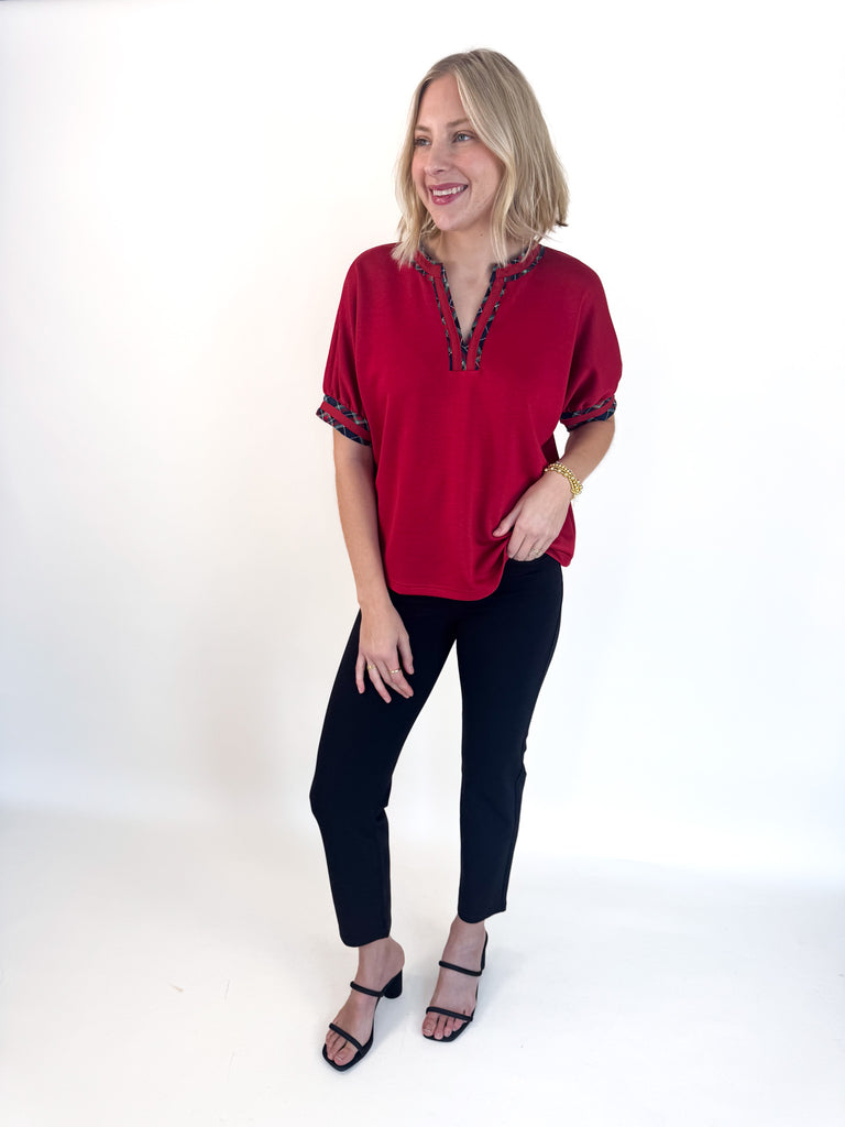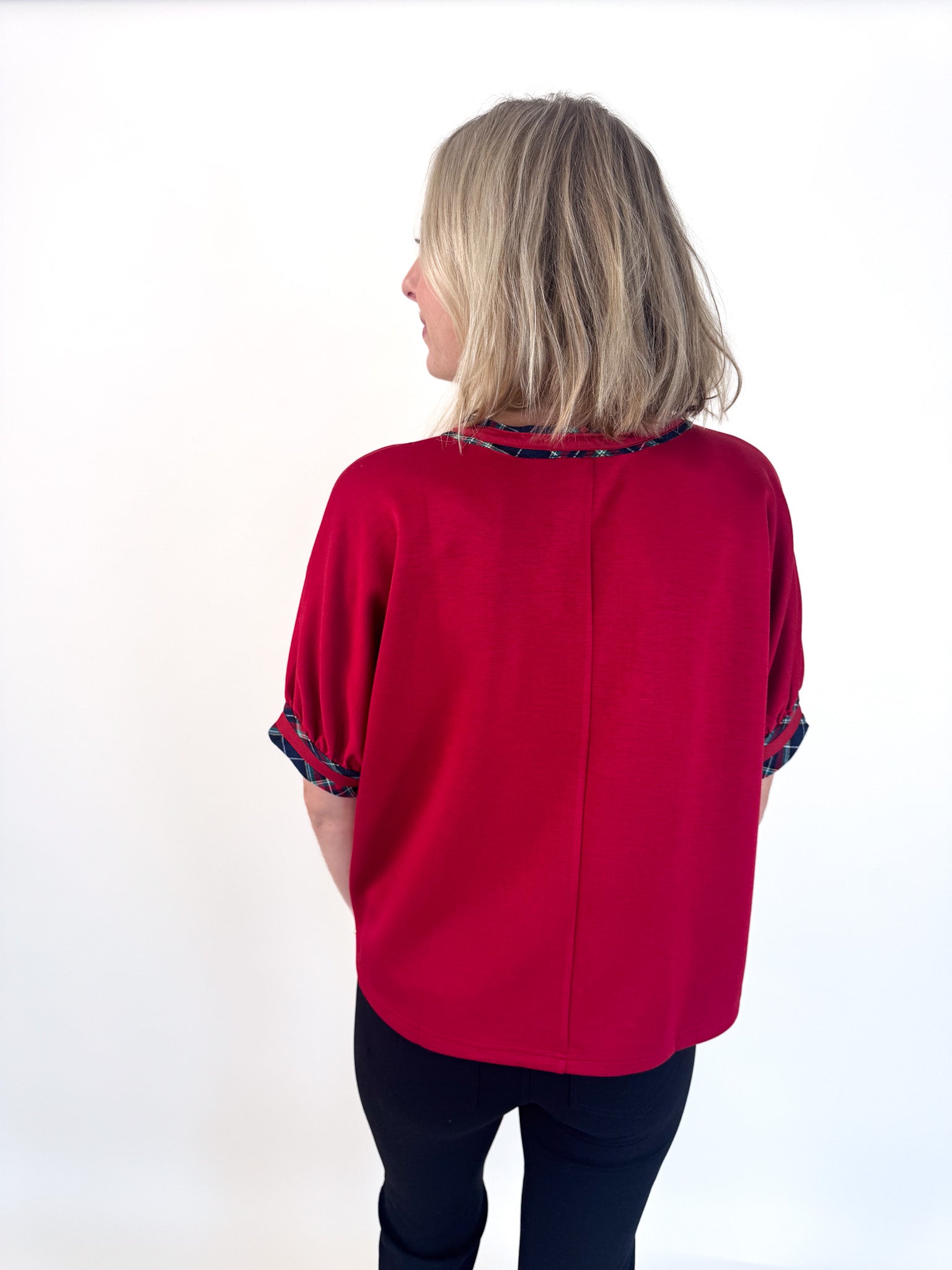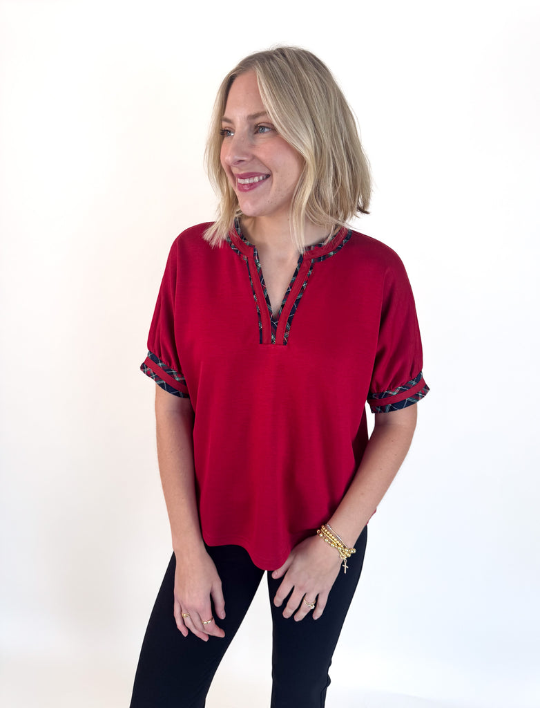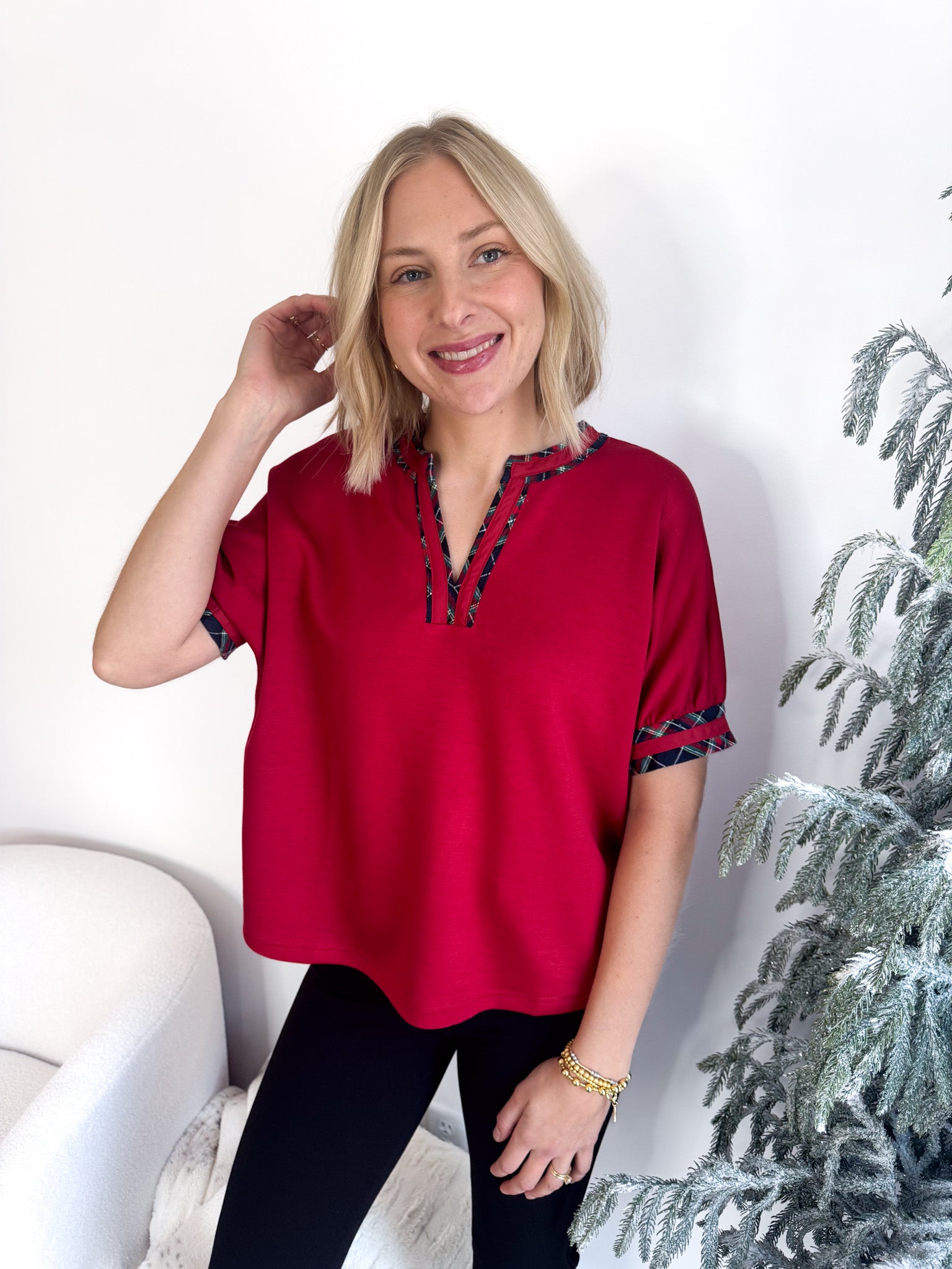 Festive and flattering, this red short sleeve tee blouse is the perfect mix of casual and holiday-ready.