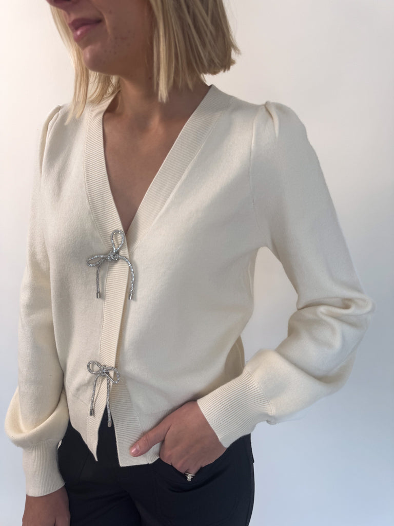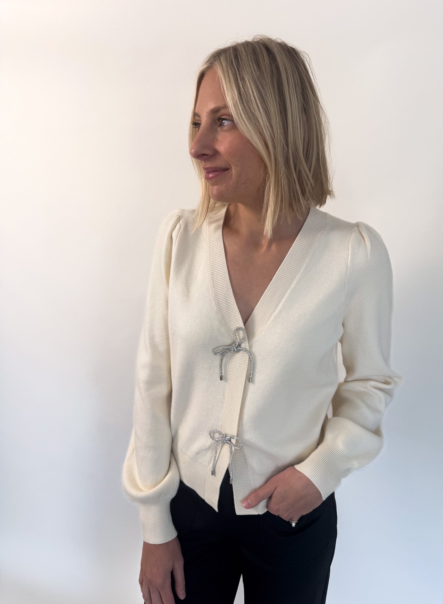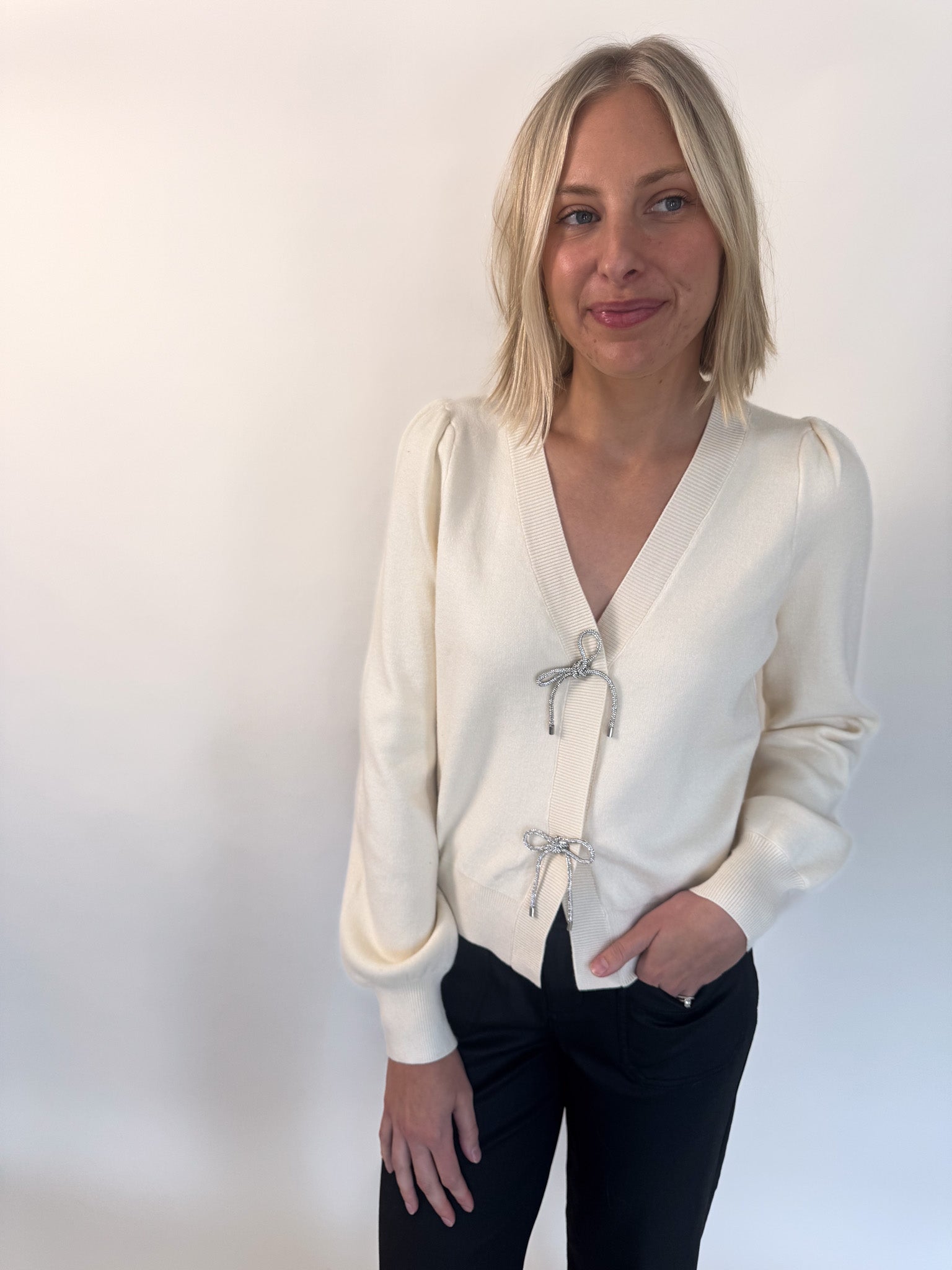 Soft, cozy, and perfectly feminine, this cardigan blends classic elegance with festive flair.