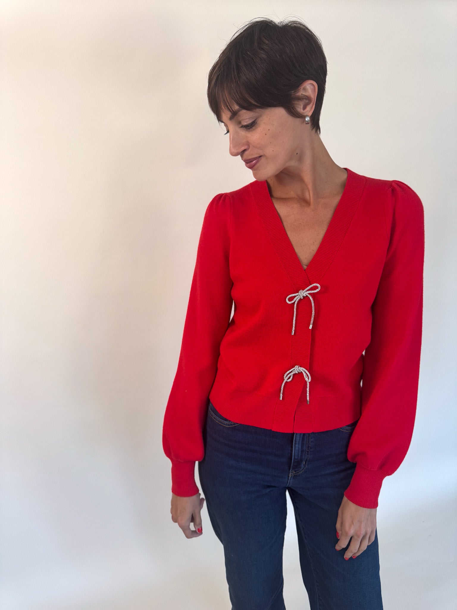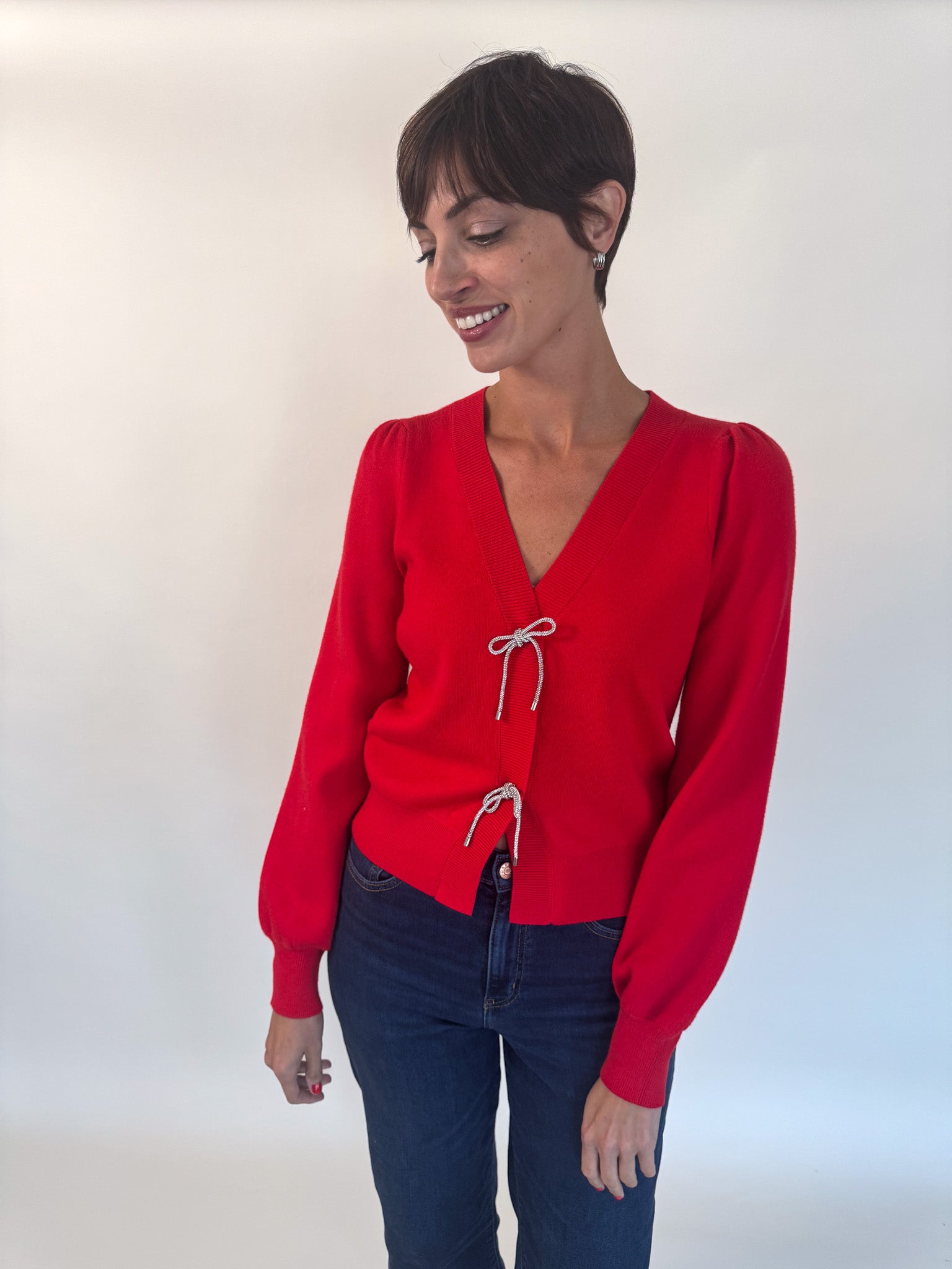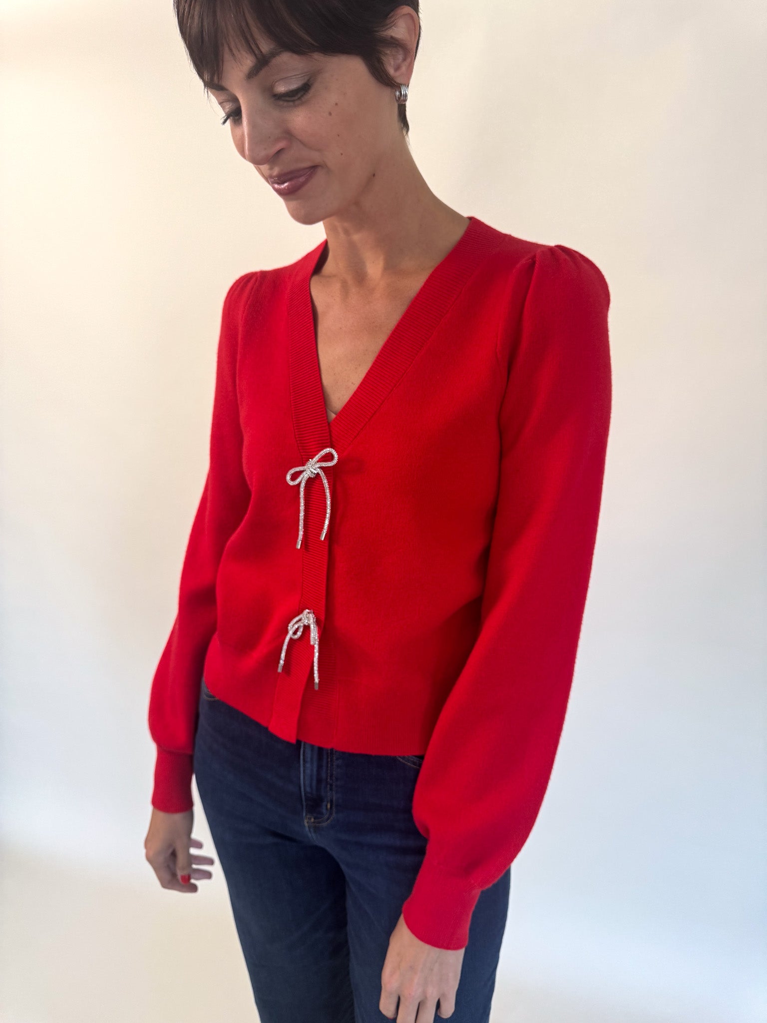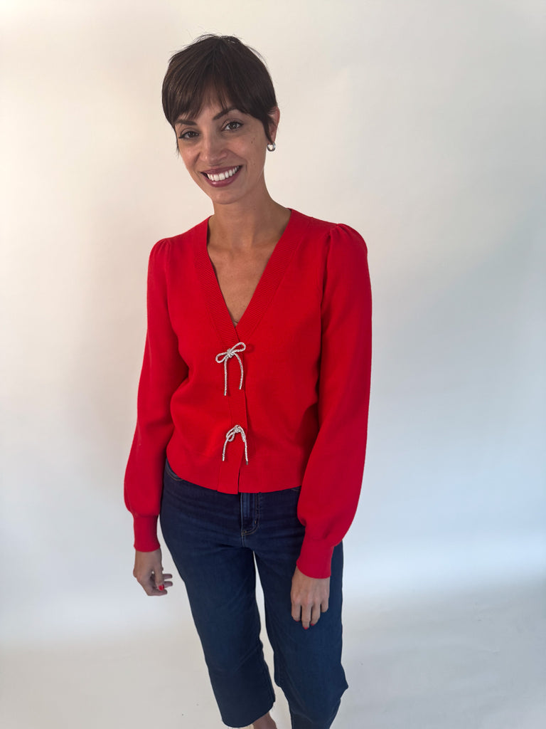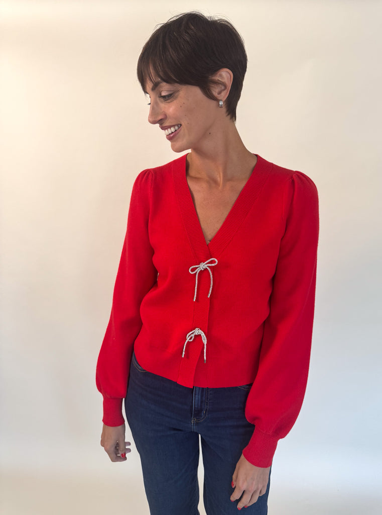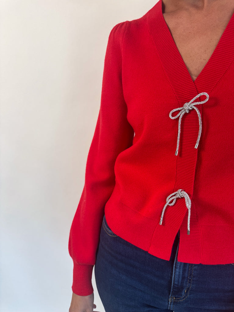 Crystal Bow Button Cardigan- Red