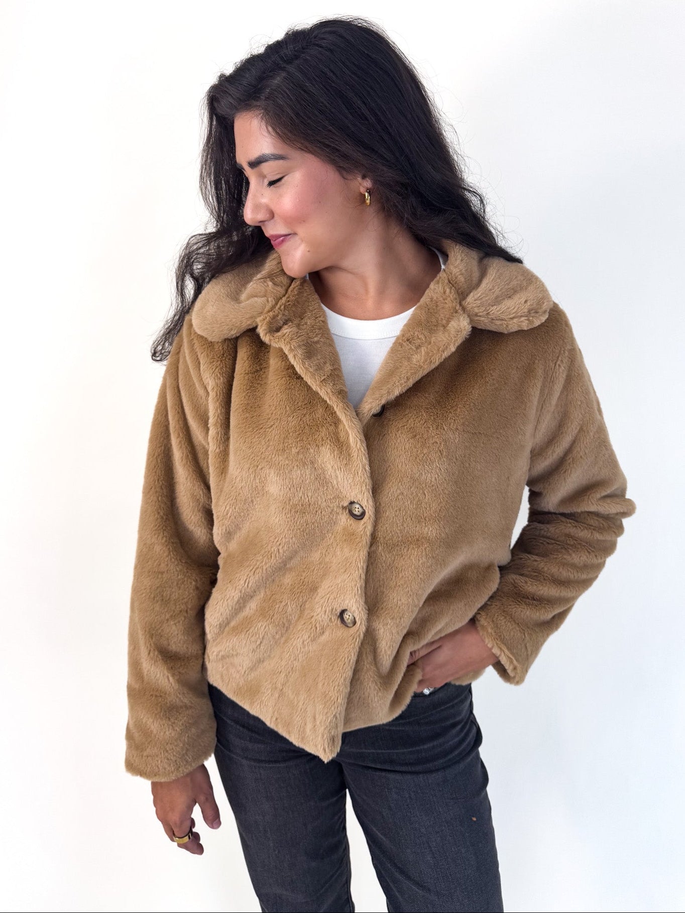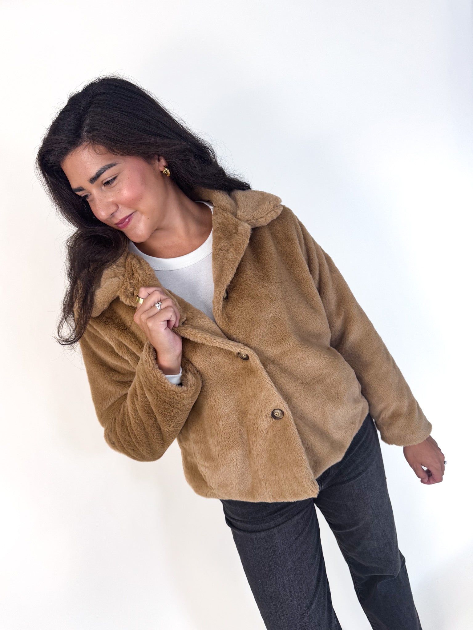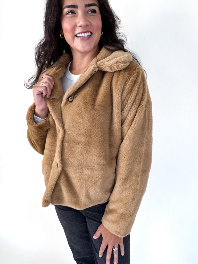This ultra-soft camel coat brings timeless sophistication with a cozy twist.