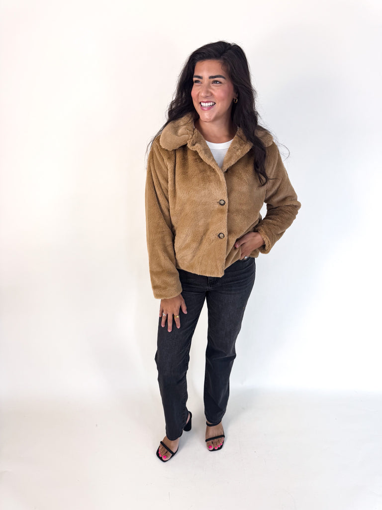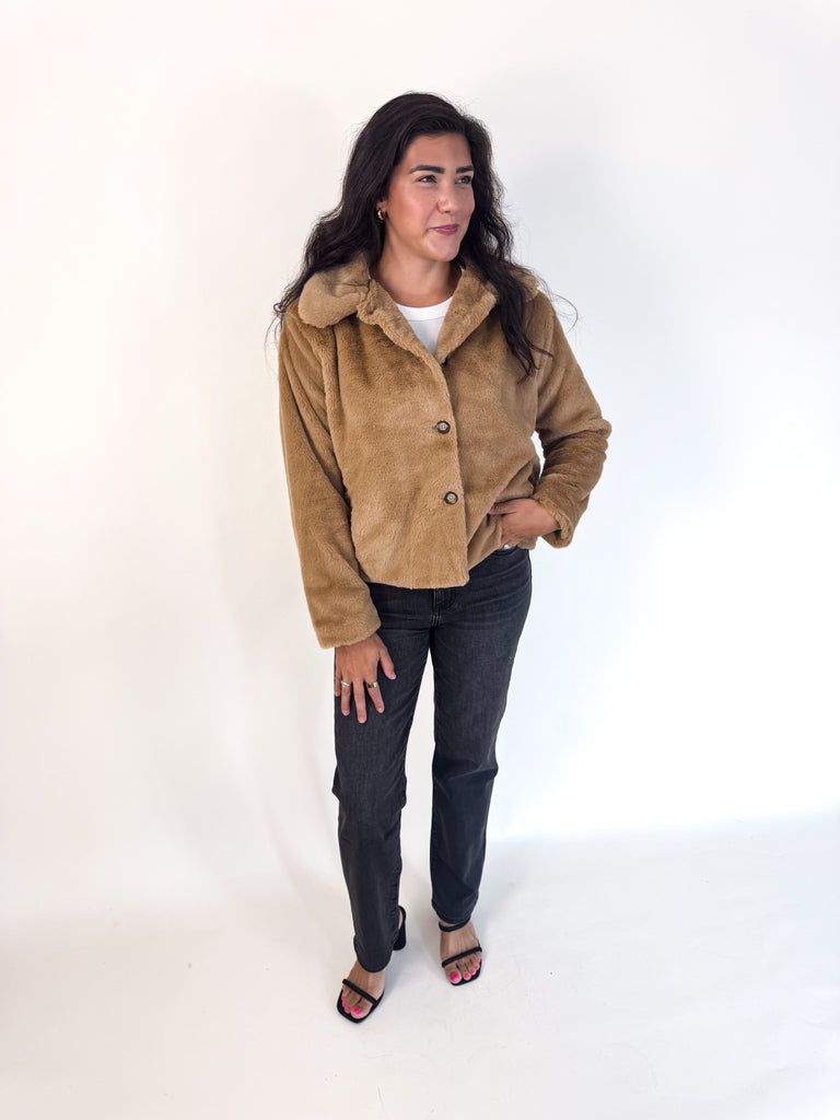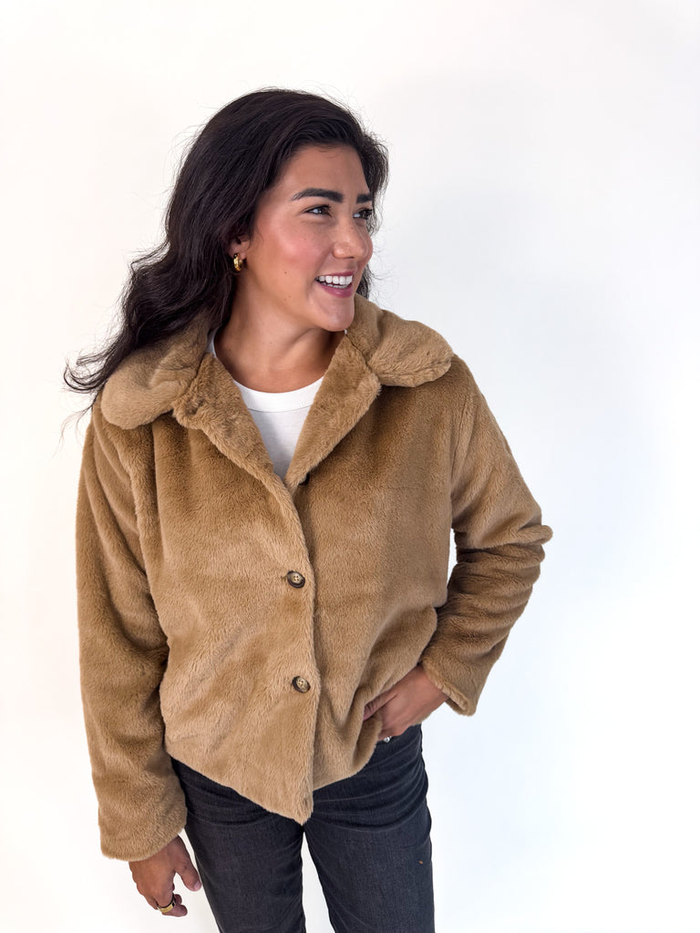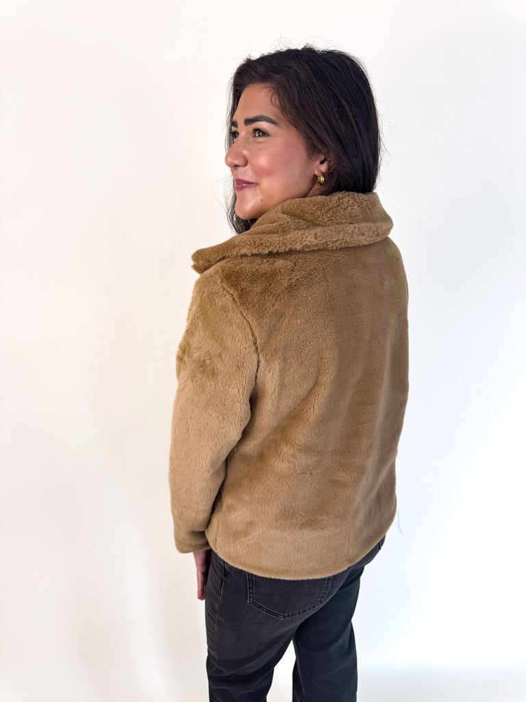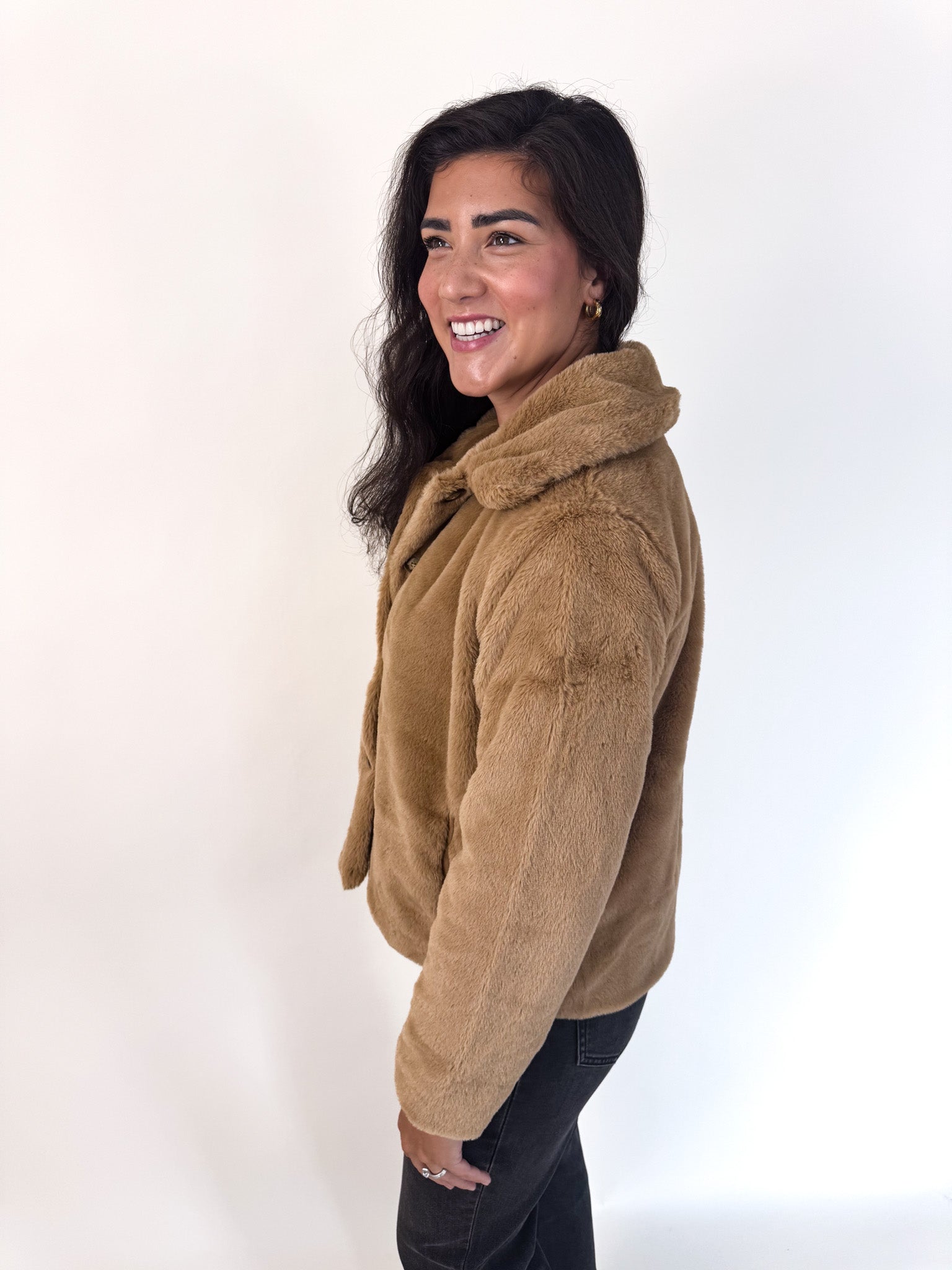 This ultra-soft camel coat brings timeless sophistication with a cozy twist.