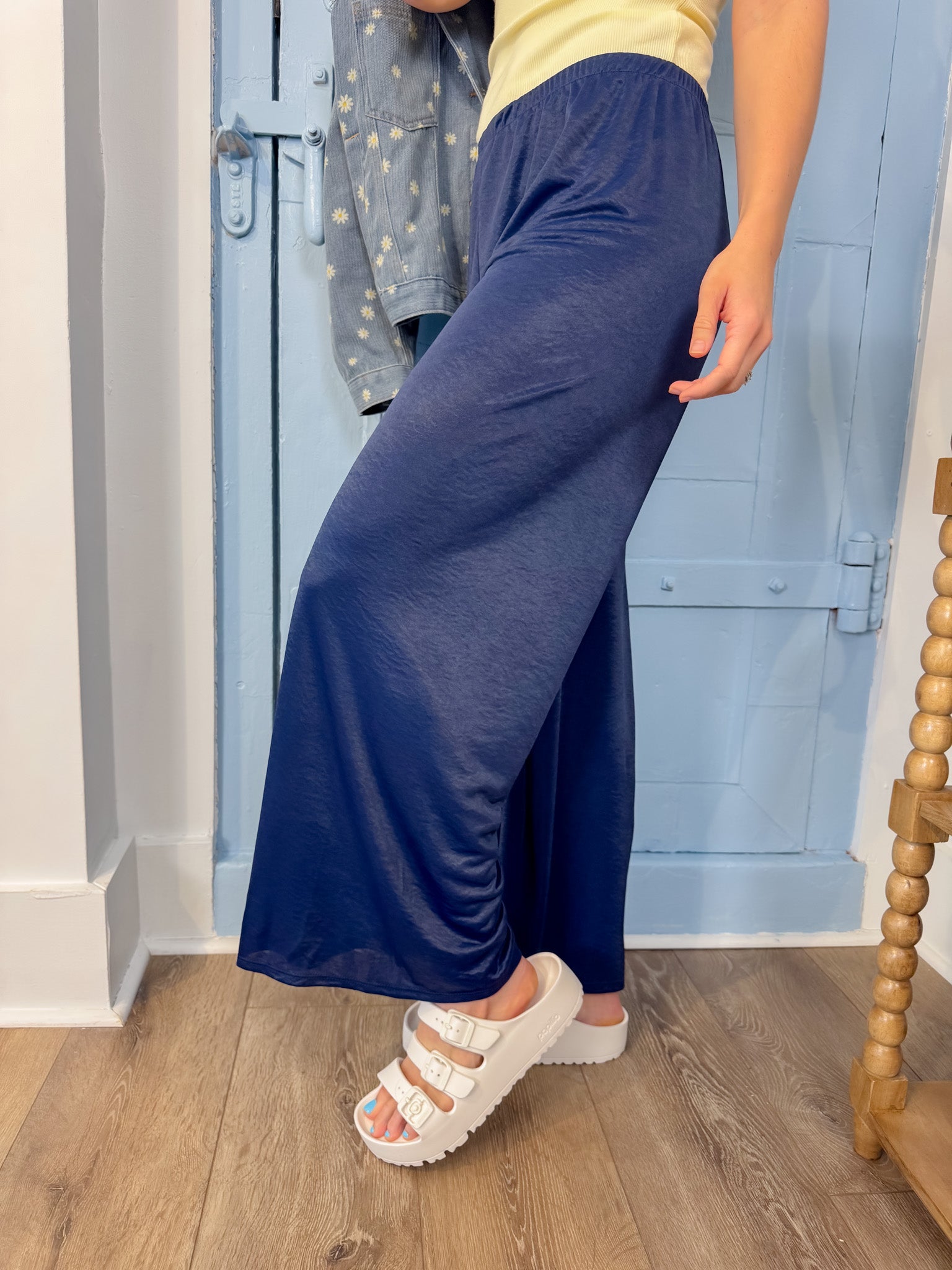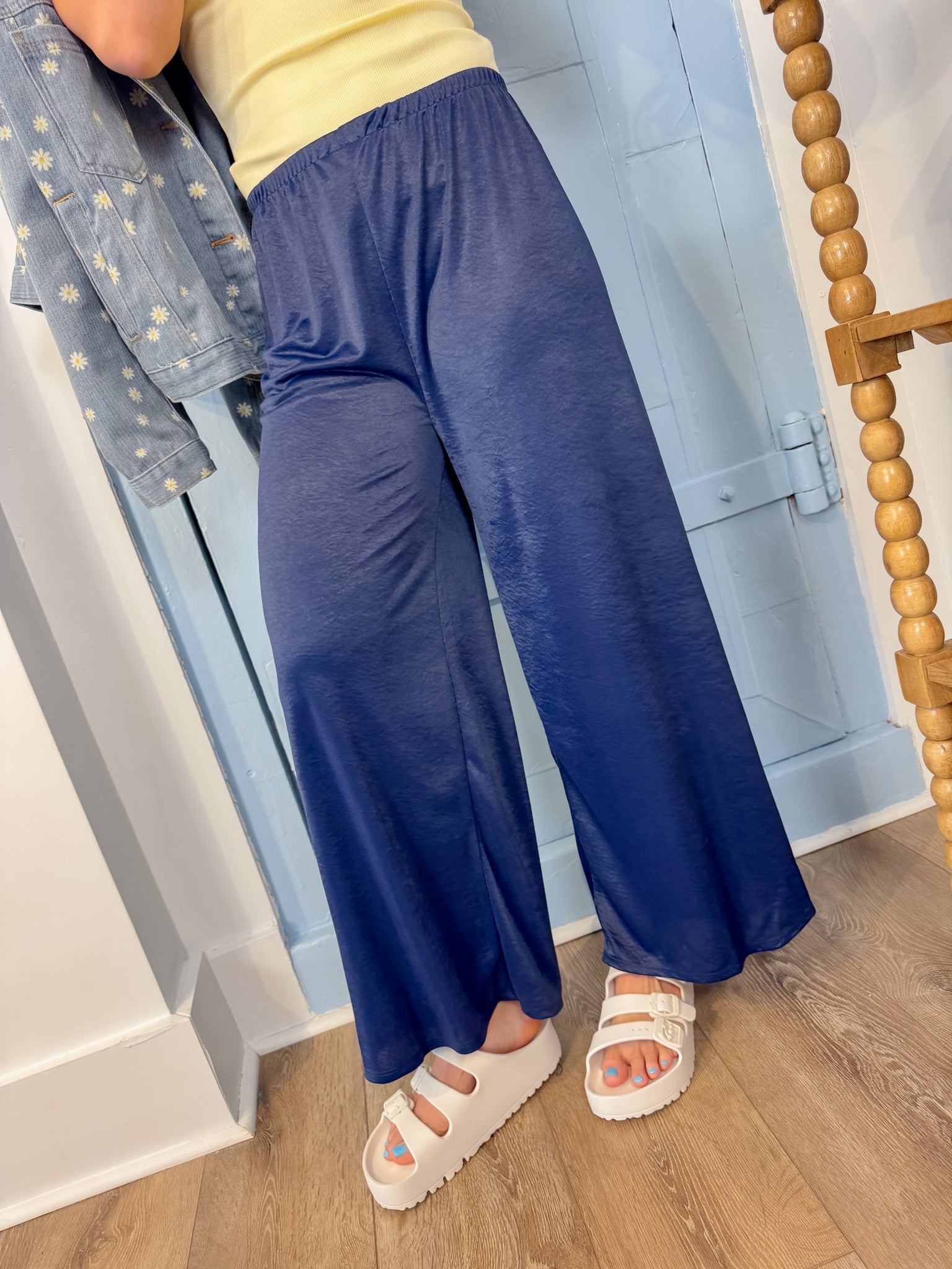 Slip into understated elegance with our Navy Satin Wide Leg Pant. Crafted from a luxurious satin-feel fabric, these pants drape beautifully while maintaining a comfortable, forgiving elastic waist. The wide-leg silhouette creates a sophisticated, flowing line that works seamlessly from day to evening. Perfect for those moments when you want to look polished without sacrificing comfort—simply pull them on and go.