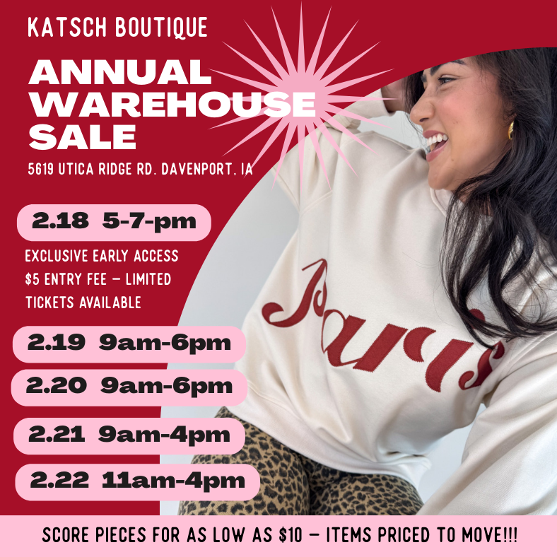 Our Early Access Warehouse Sale Ticket gets you into an exclusive, private shopping event at Katsch Boutique from 5–7 PM, before the sale opens to the public. Sale items are extremely limited — often only one or two pieces per size — and once they’re gone, they’re gone for good.
